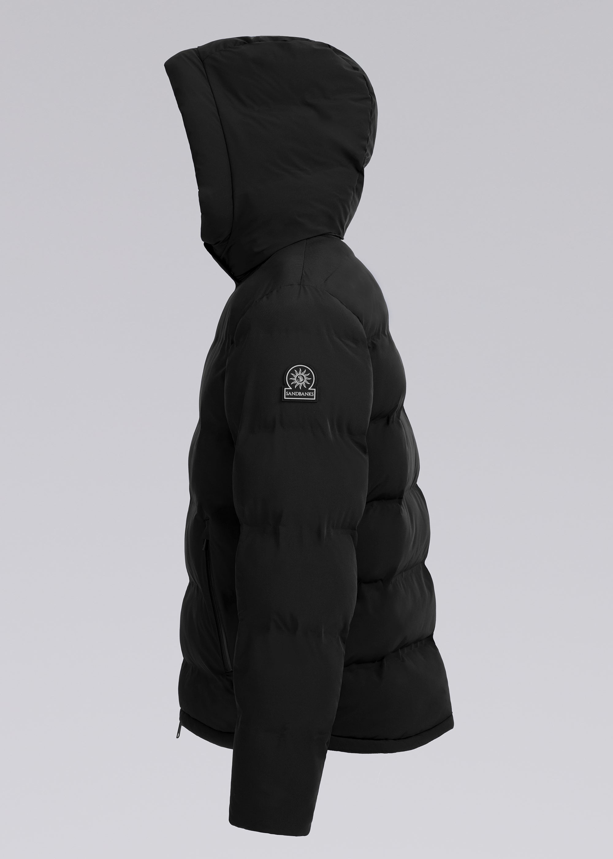 The Sandbanks Waterproof Banks Puffer Jacket in black combines high-performance design with sustainable innovation. Made from technical soft shell fabric with bonded seams and YKK Aquaguard zippers, it is fully waterproof, windproof, and features adjustable waist for a tailored fit. PrimaLoft® insulation provides lightweight warmth, while the outer shell and recycled lining ensure breathability and comfort. Built with sustainable materials, this jacket is designed to endure the elements.