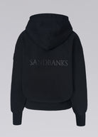 Our women's Sandbanks badge logo hoodie in black is constructed with 400gsm diagonal knitted fabric that features a slight brushed back for a superior soft feeling and warmth, whilst remaining breathable. Made from 100% BCI Cotton with a sleeve embroidered badge logo and cover stitch details.