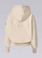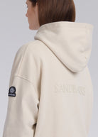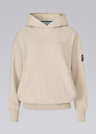 Our women's Sandbanks badge logo hoodie in stone is constructed with 400gsm diagonal knitted fabric that features a slight brushed back for a superior soft feeling and warmth, whilst remaining breathable. Made from 100% BCI Cotton with a sleeve embroidered badge logo and cover stitch details.