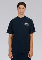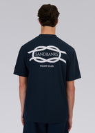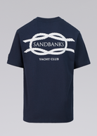 Sandbanks men's yacht club t-shirt in navy, made from 100% organic cotton. This t-shirt features a statement Sandbanks chest and rear print, and tri-colour back neck binding.