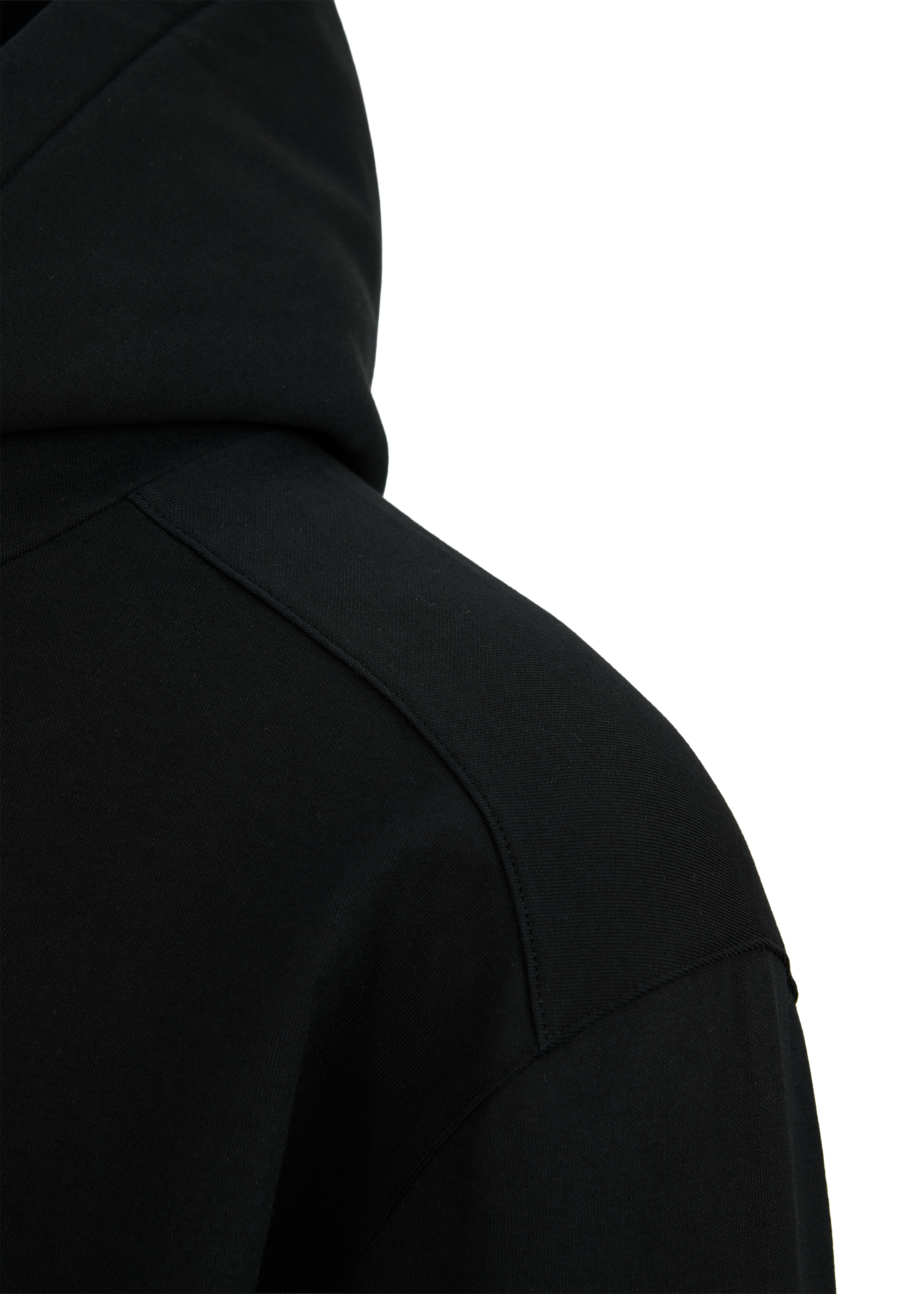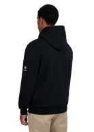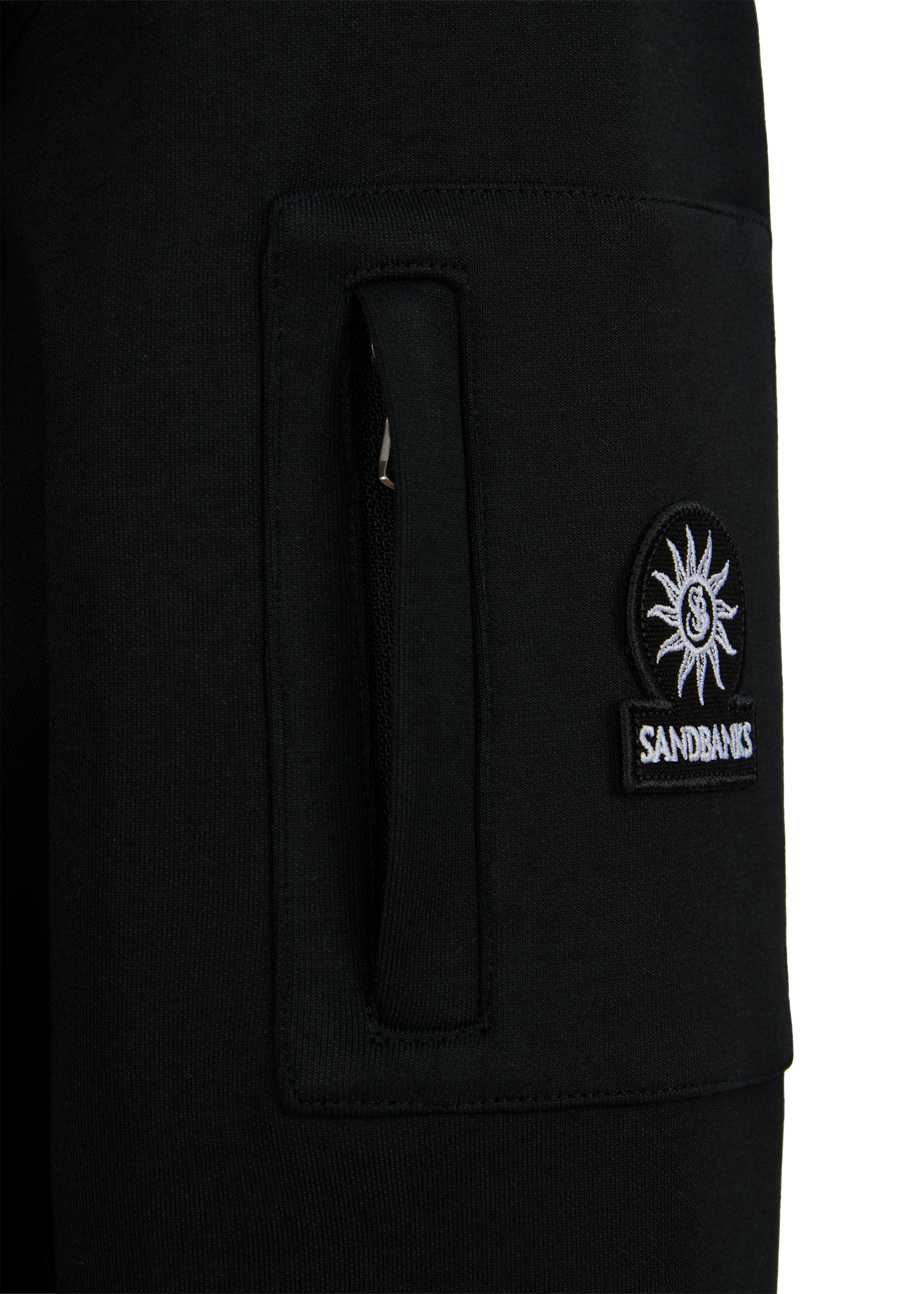 Sandbanks zip pocket hoodie in black, crafted from premium 350gsm cotton interlock. Designed with a functional zip pocket highlighted by a contrasting embroidered Sandbanks badge logo, and finished with a signature tri-colour back neck binding.