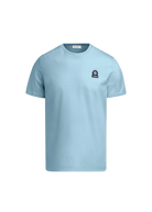 Sandbanks men's badge logo t-shirt in crystal blue, made from mercerised cotton for a silky and luxurious feel. This classic fitting crew neck t-shirt features an embroidered badge logo on the chest and tri-colour back neck binding.
