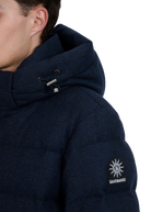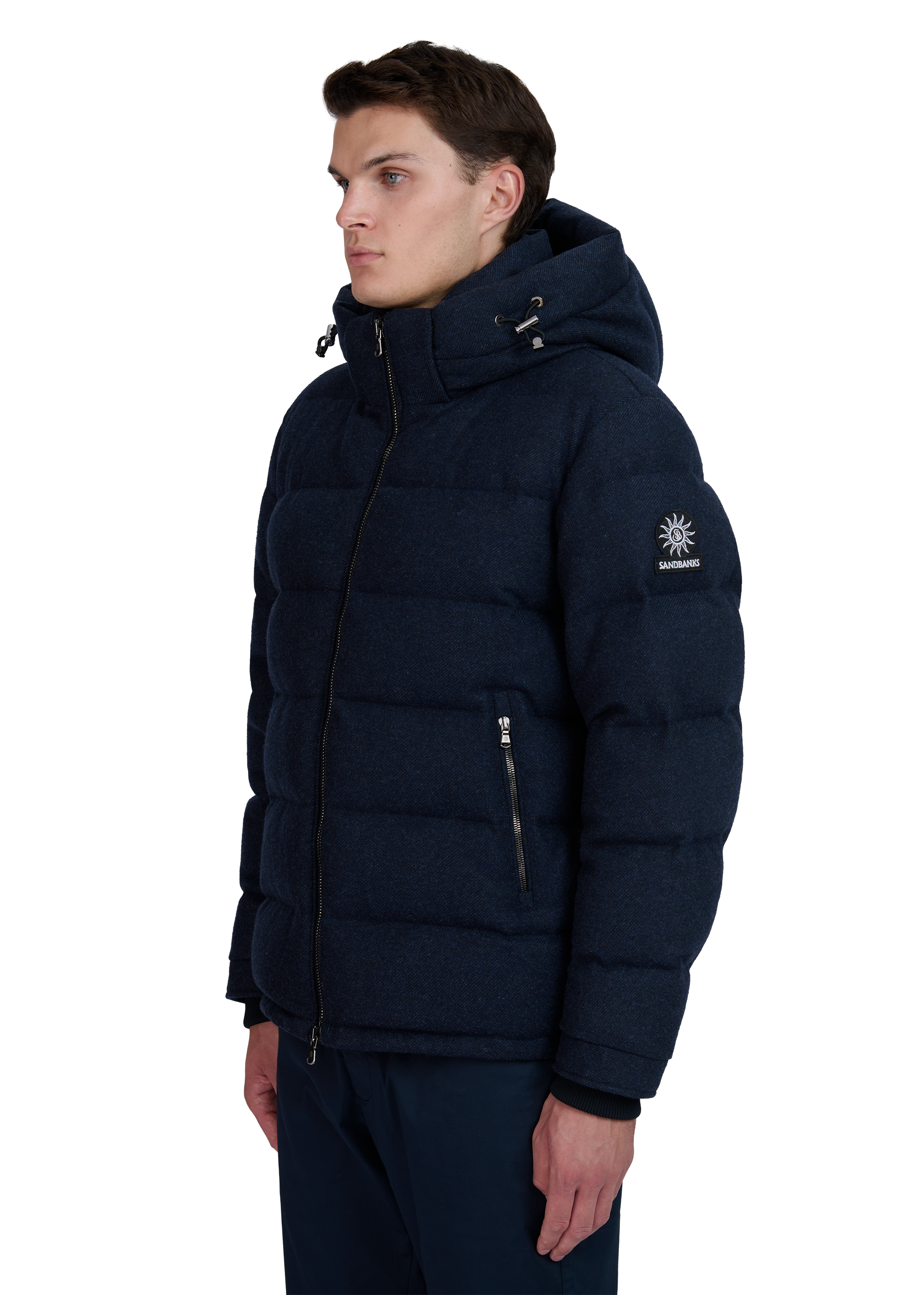 Our signature Sandbanks Banks puffer jacket transformed into statement outerwear as part of our Artisan Series. This luxury jacket is crafted from Italian artistry wool, meticulously finished with gun metal components and Lampo zips, this puffer has high thermal retention and features a Sandbanks embroidered logo badge, detachable hood and filled with recycled natural down.