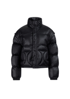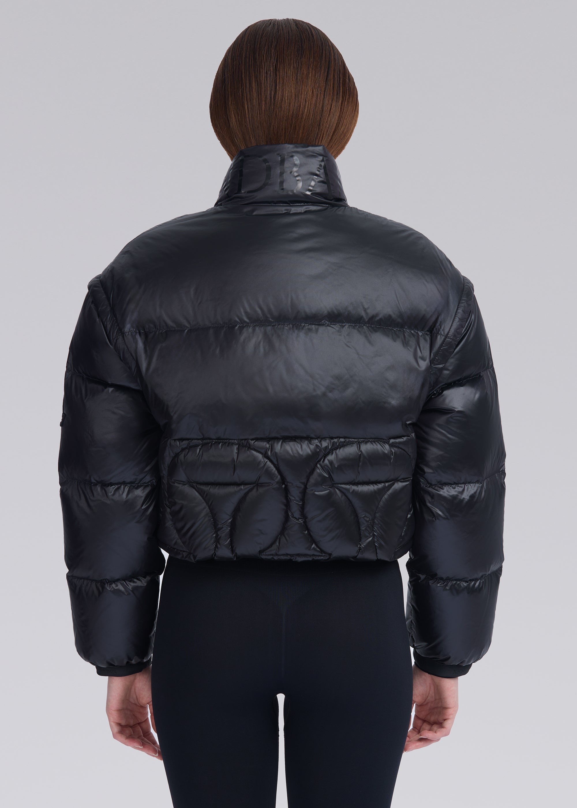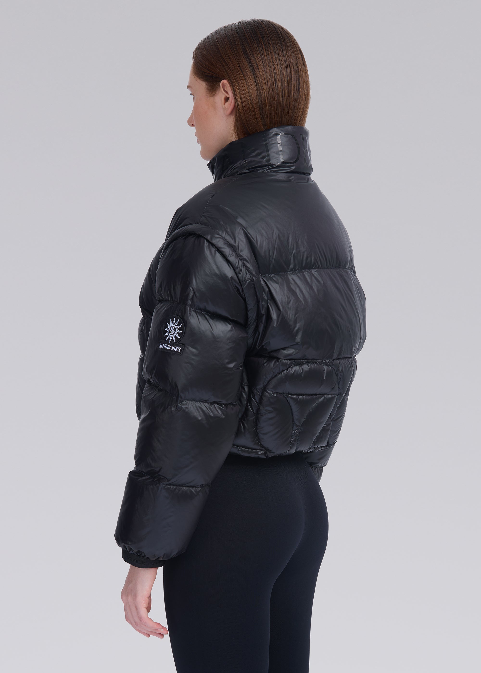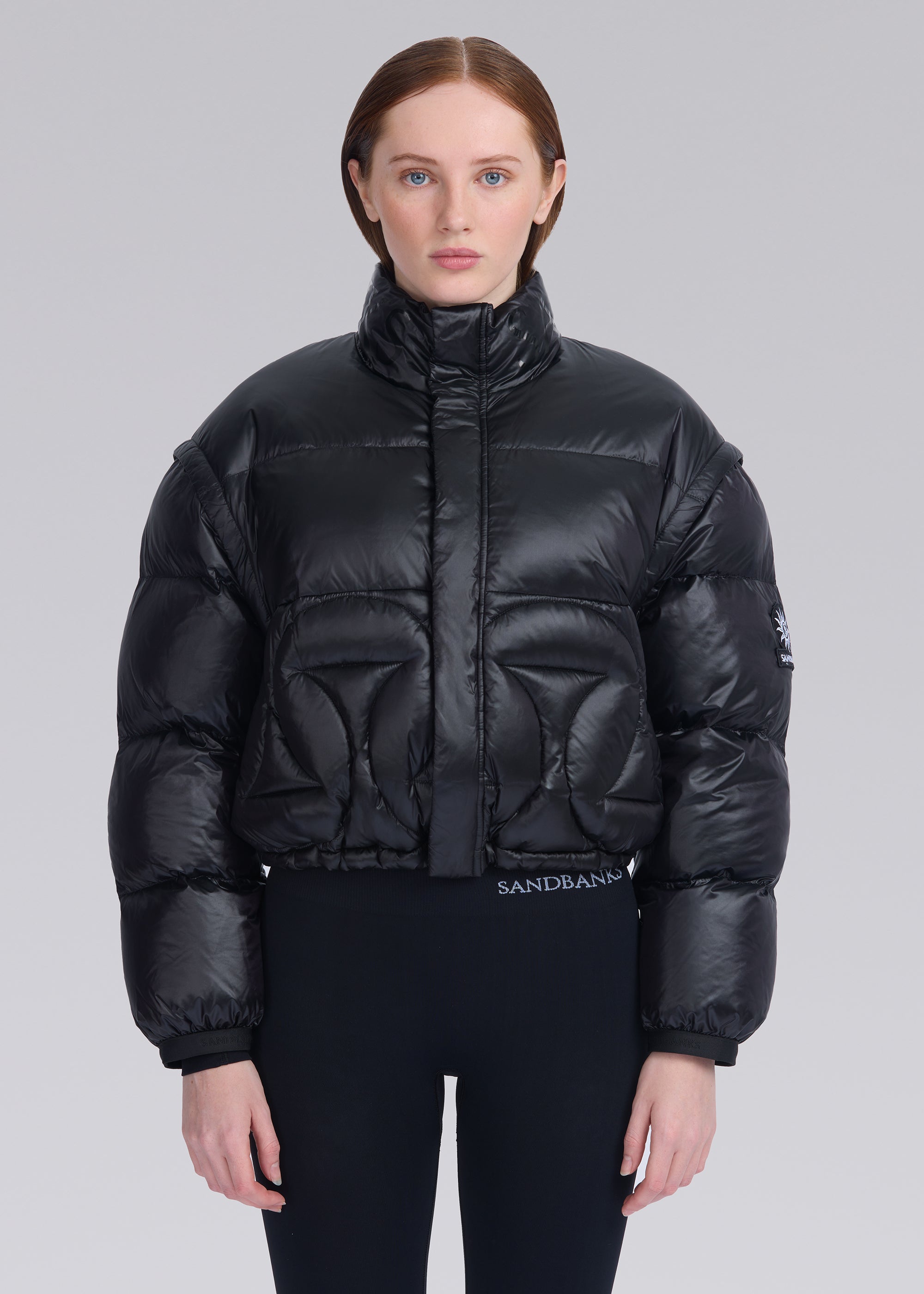 The Sandbanks Women's Monogram Cropped Puffer/Gilet jacket is featured with a black shiny shell fabric, with removable sleeves transforming into a statement gilet. This jacket features shiny black engraved components, branded tonal elastic, contrast felt badge with rubber logo badge, fleece lined pockets and Sandbanks Monogram baffles.