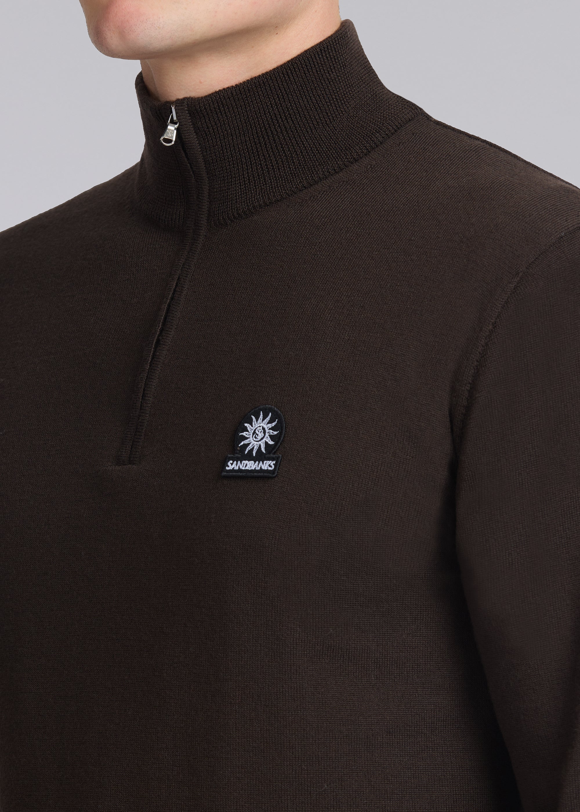 The Sandbanks Merino Wool Quarter Zip Jumper in brown is crafted with ultra fine 100% Merino Wool from Italy. It boasts a Sandbanks logo badge embroidery on the chest, a funnel neck design, and a Sandbanks branded Lampo engraved zip.
