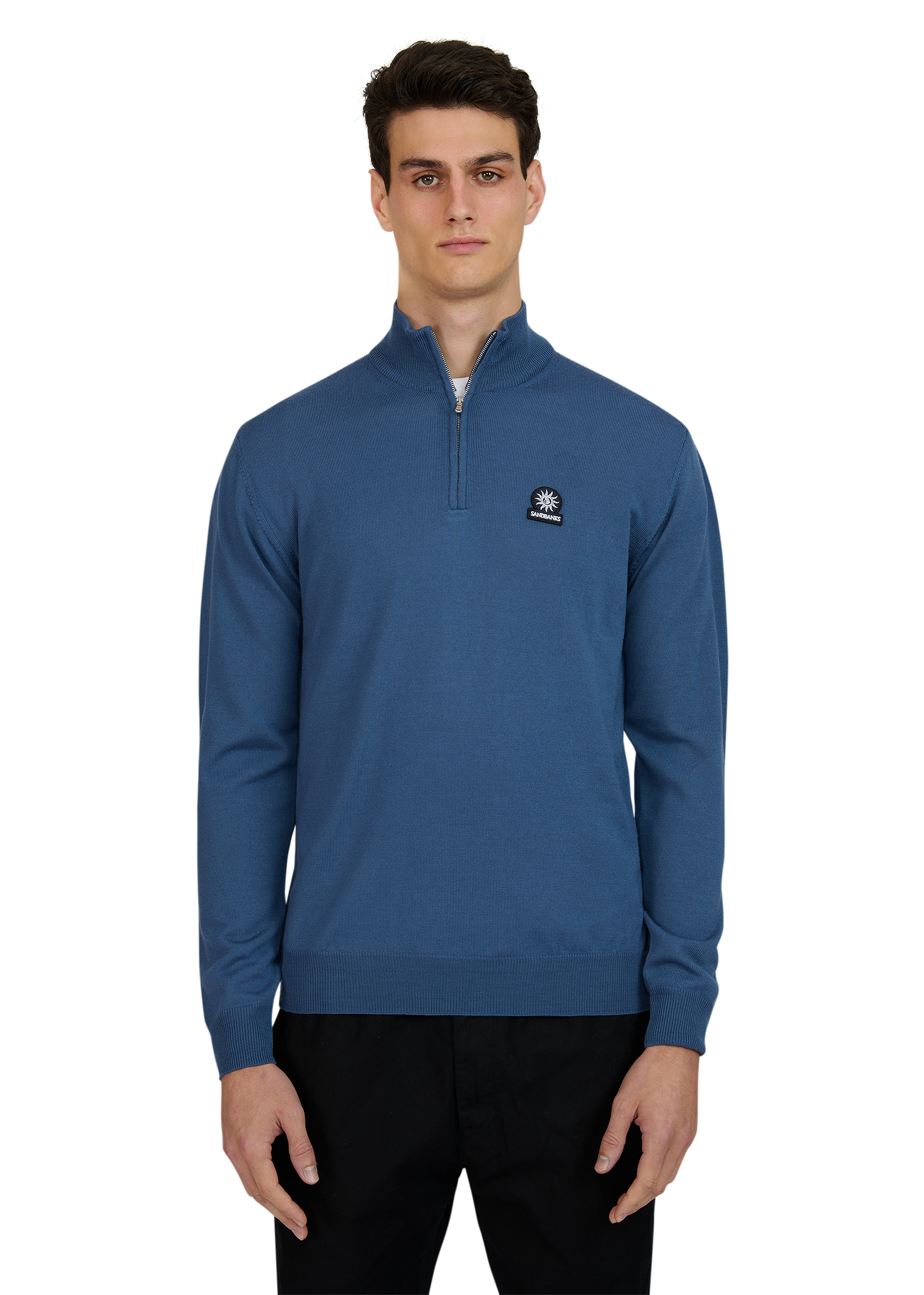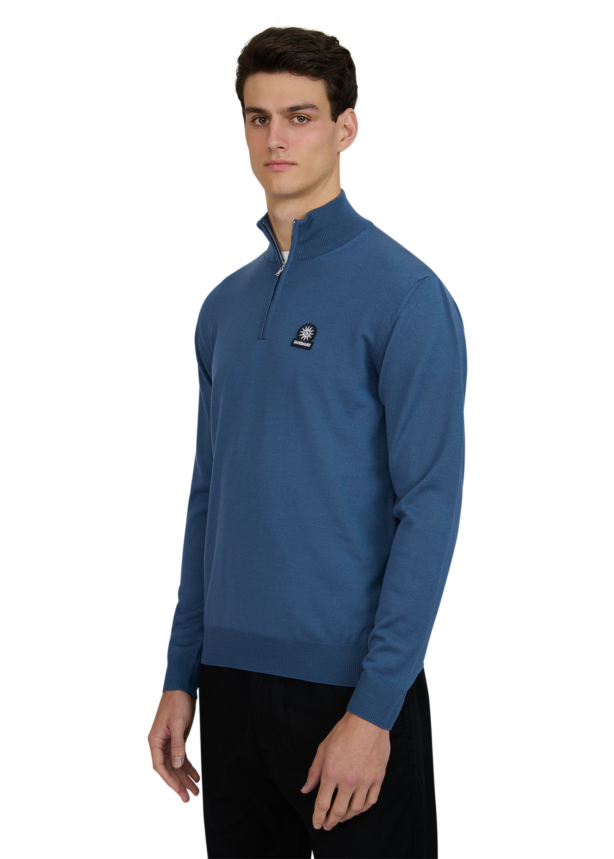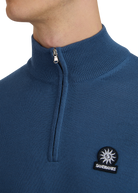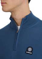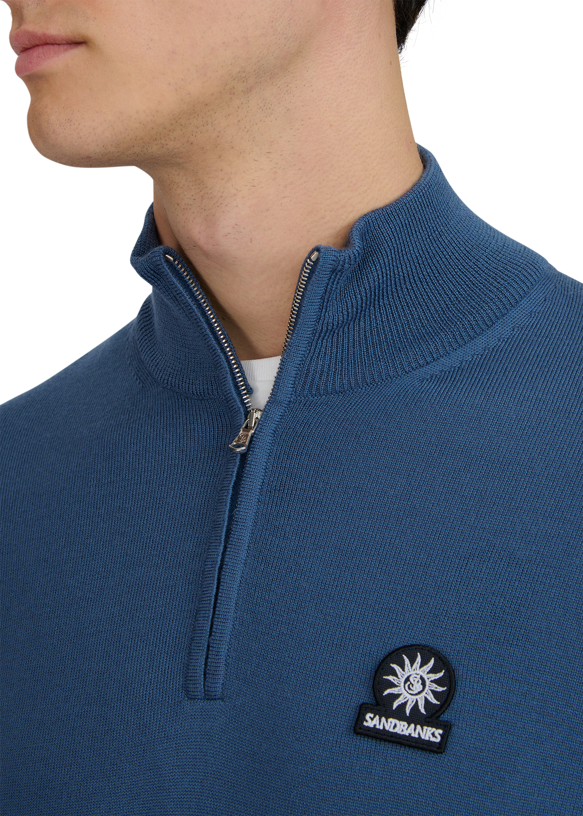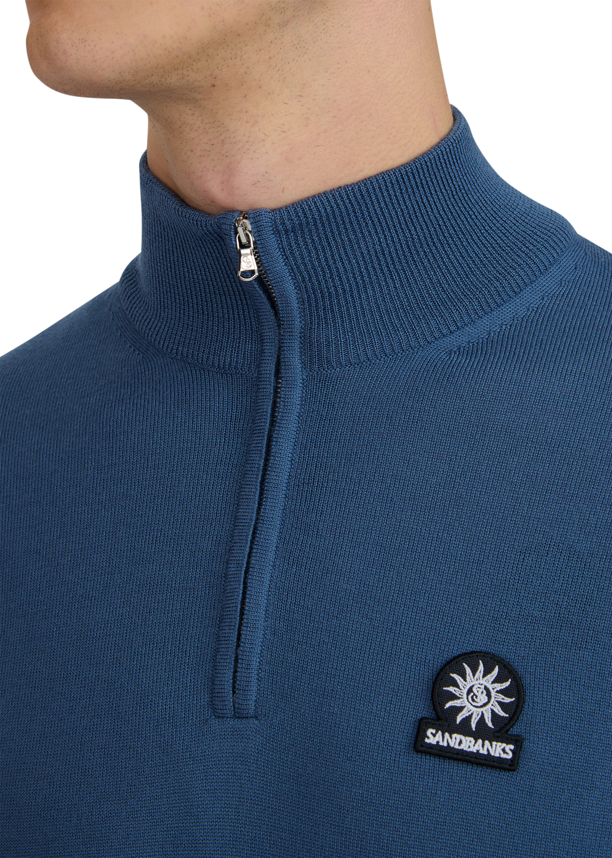 The Sandbanks Merino Wool Quarter Zip Jumper in teal is crafted with ultra fine 100% Merino Wool from Italy. It boasts a Sandbanks logo badge embroidery on the chest, a funnel neck design, and a Sandbanks branded Lampo engraved zip.