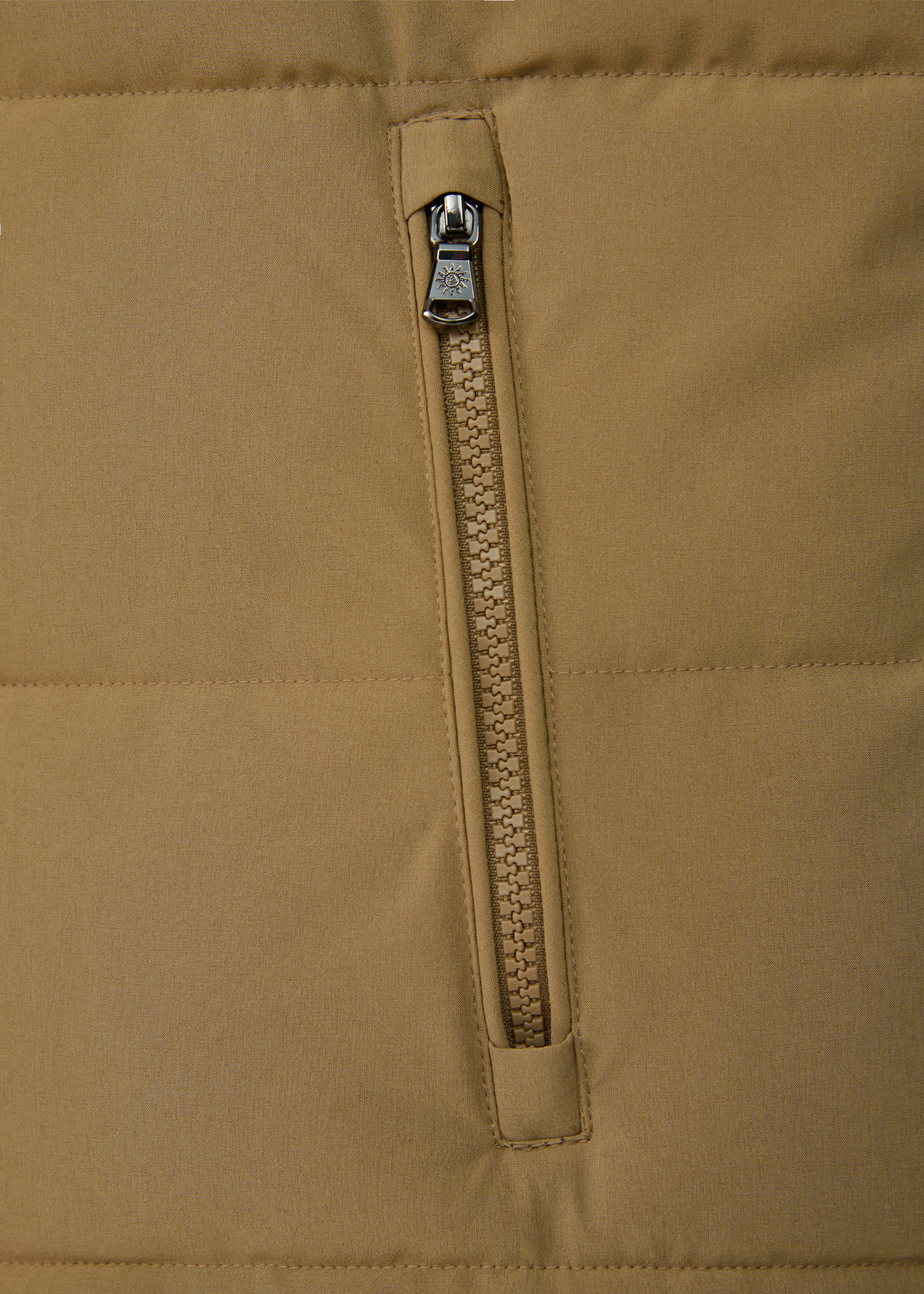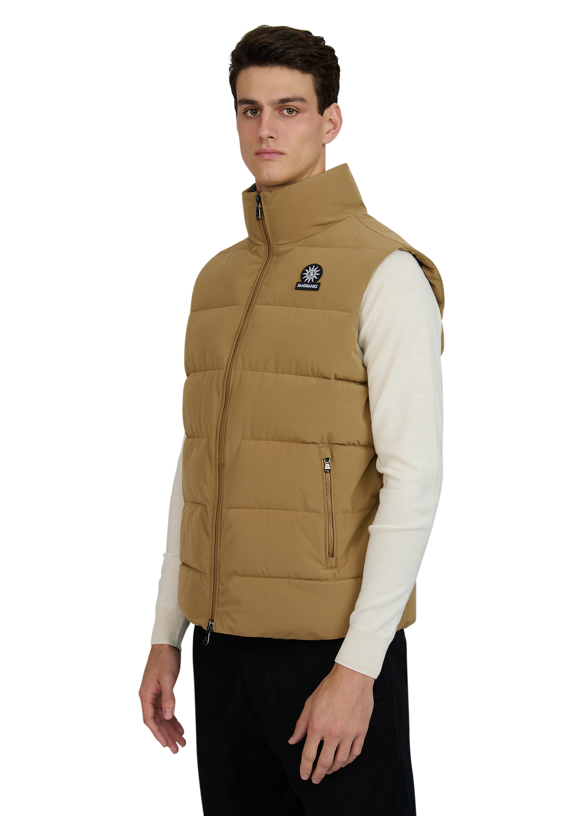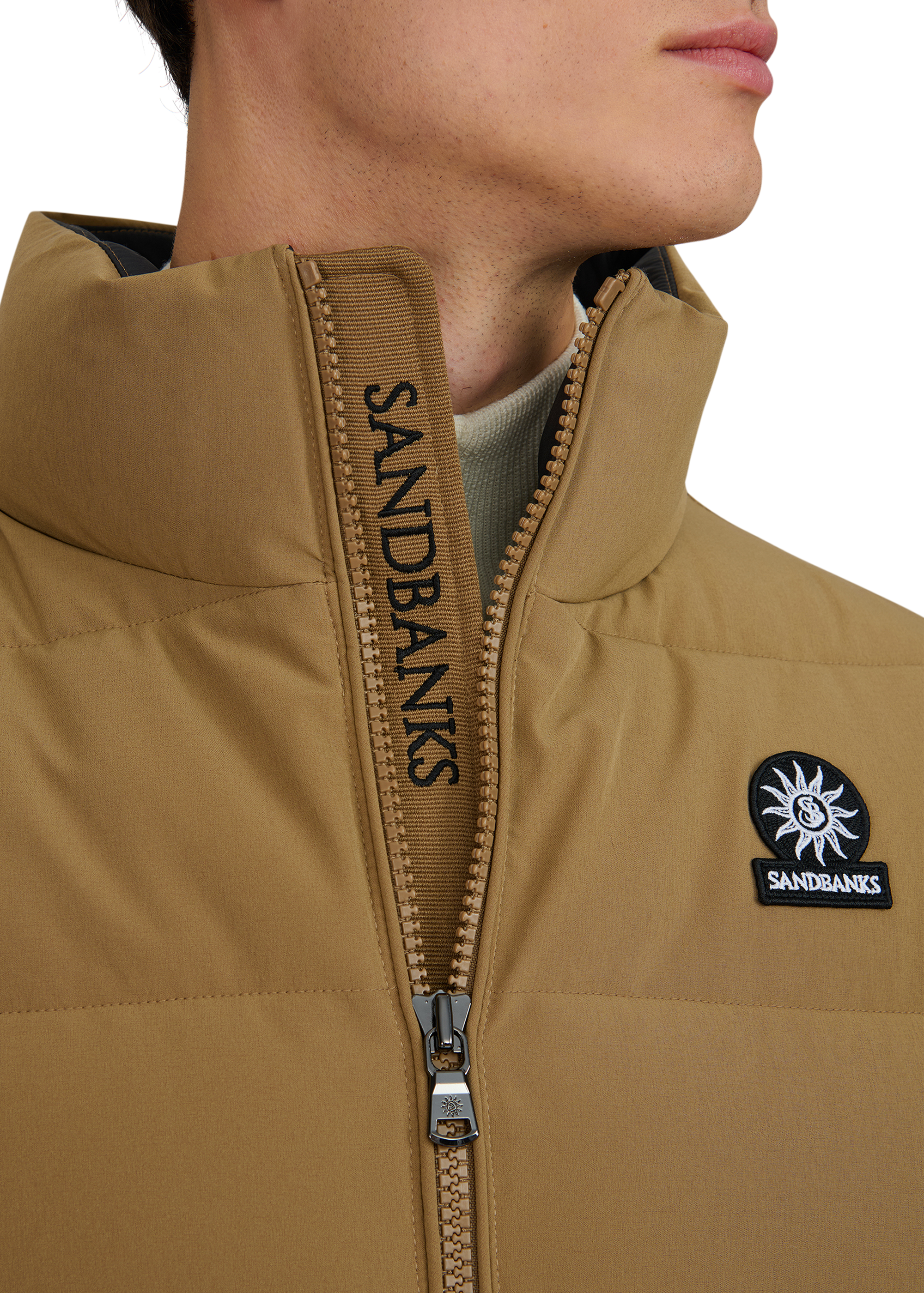 Sandbanks Clifftop zip pocket gilet in brown. This lightweight gilet is made almost entirely from recycled plastic bottles and features statement Sandbanks placket embroidery, swirl embroidered chest badge logo, YKK zippers with gunmetal engraved pullers.