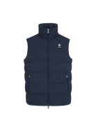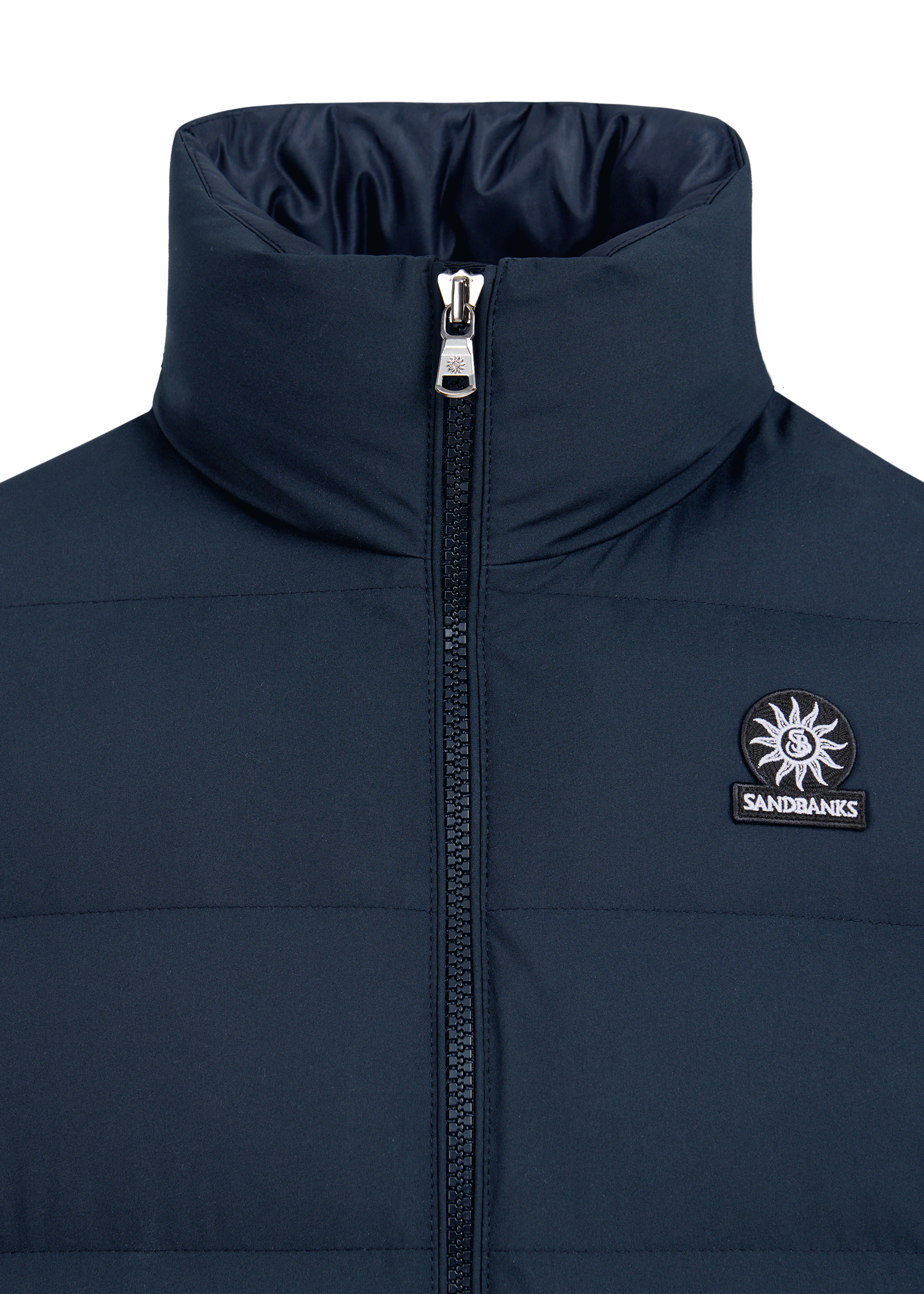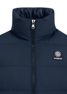 Sandbanks Clifftop zip pocket gilet in navy. This lightweight gilet is made almost entirely from recycled plastic bottles and features statement Sandbanks placket embroidery, swirl embroidered chest badge logo, YKK zippers with gunmetal engraved pullers.