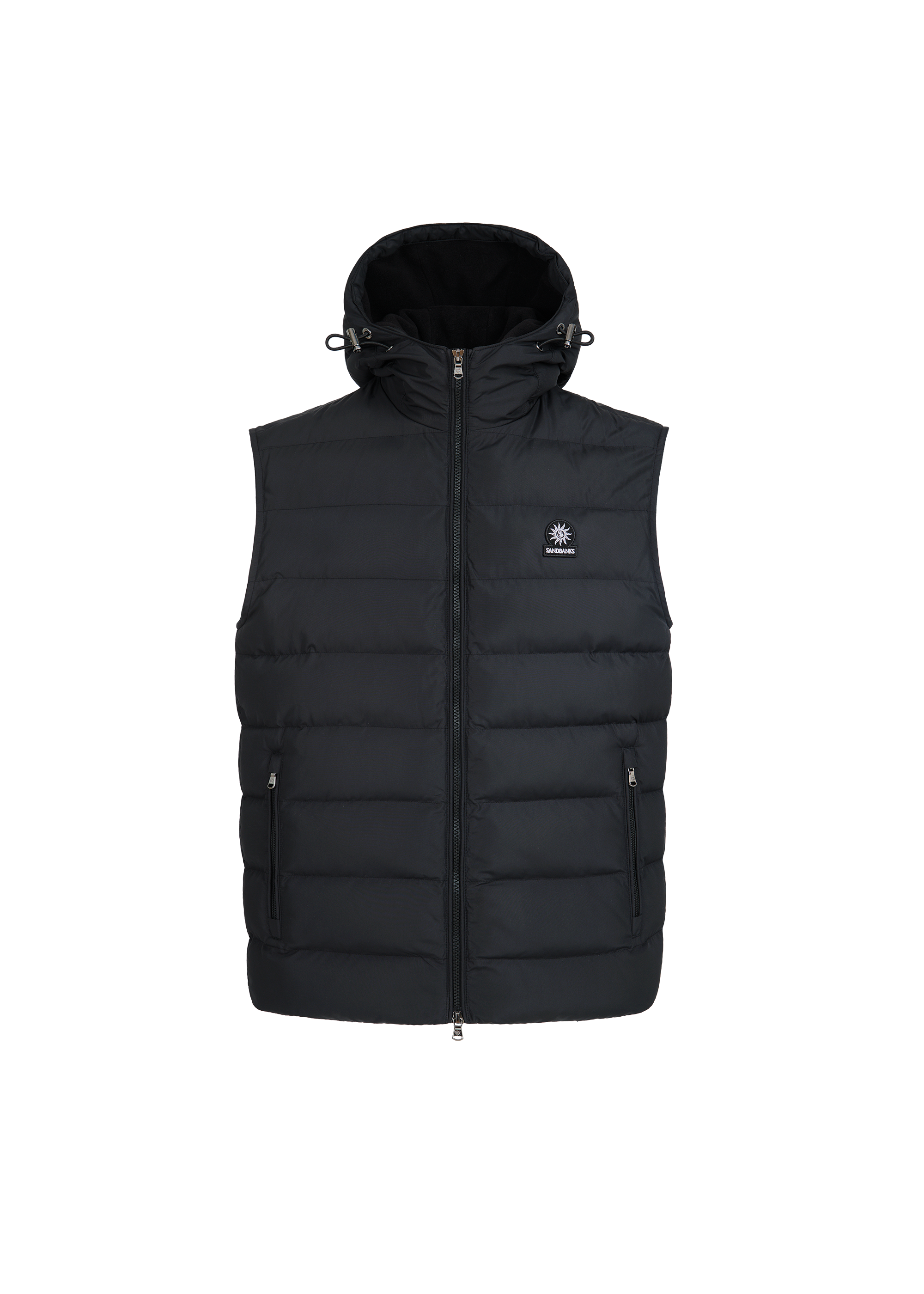 Sandbanks Frontier hooded puffer gilet in black. This lightweight gilet is made almost entirely from recycled plastic bottles and features; Sandbanks ottoman embroidered chest badge, 2-way YKK Vislon central zip, YKK coil side entry pockets with fleece lining, micro polar fleece lined hood with cord adjusters.