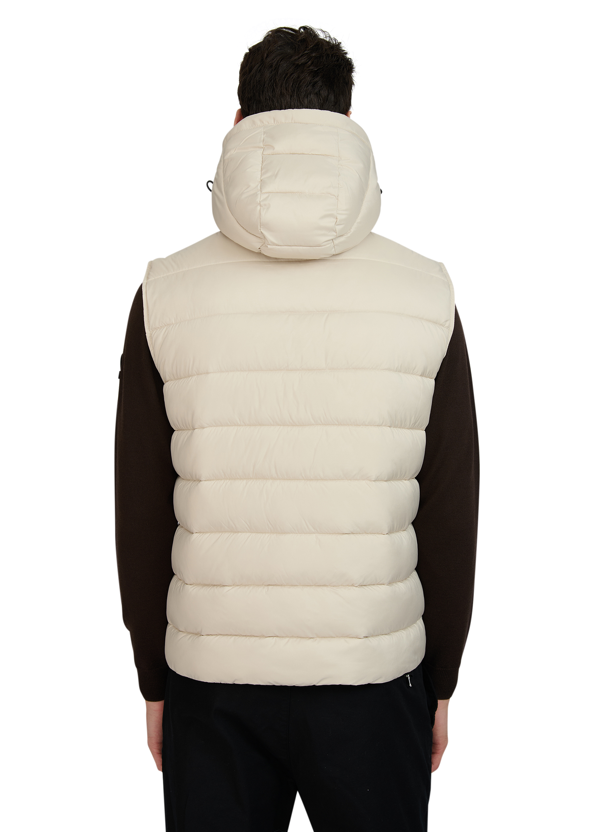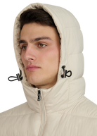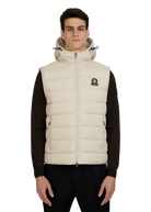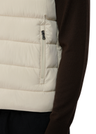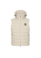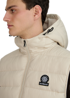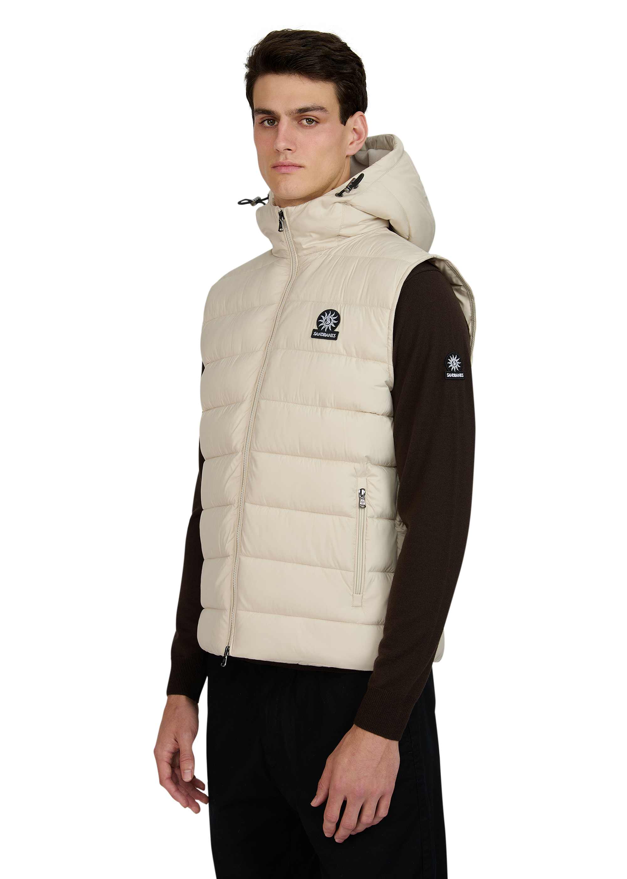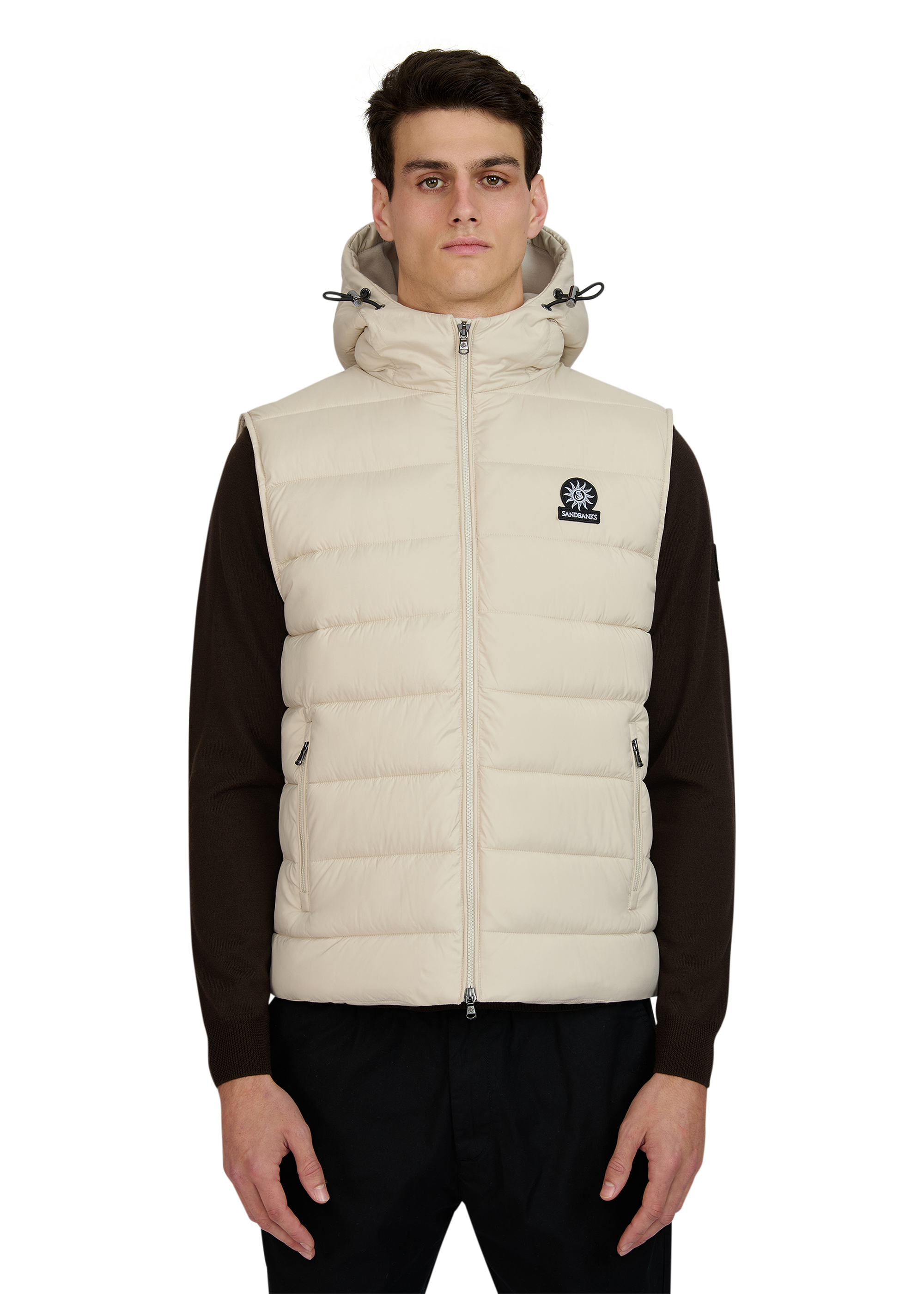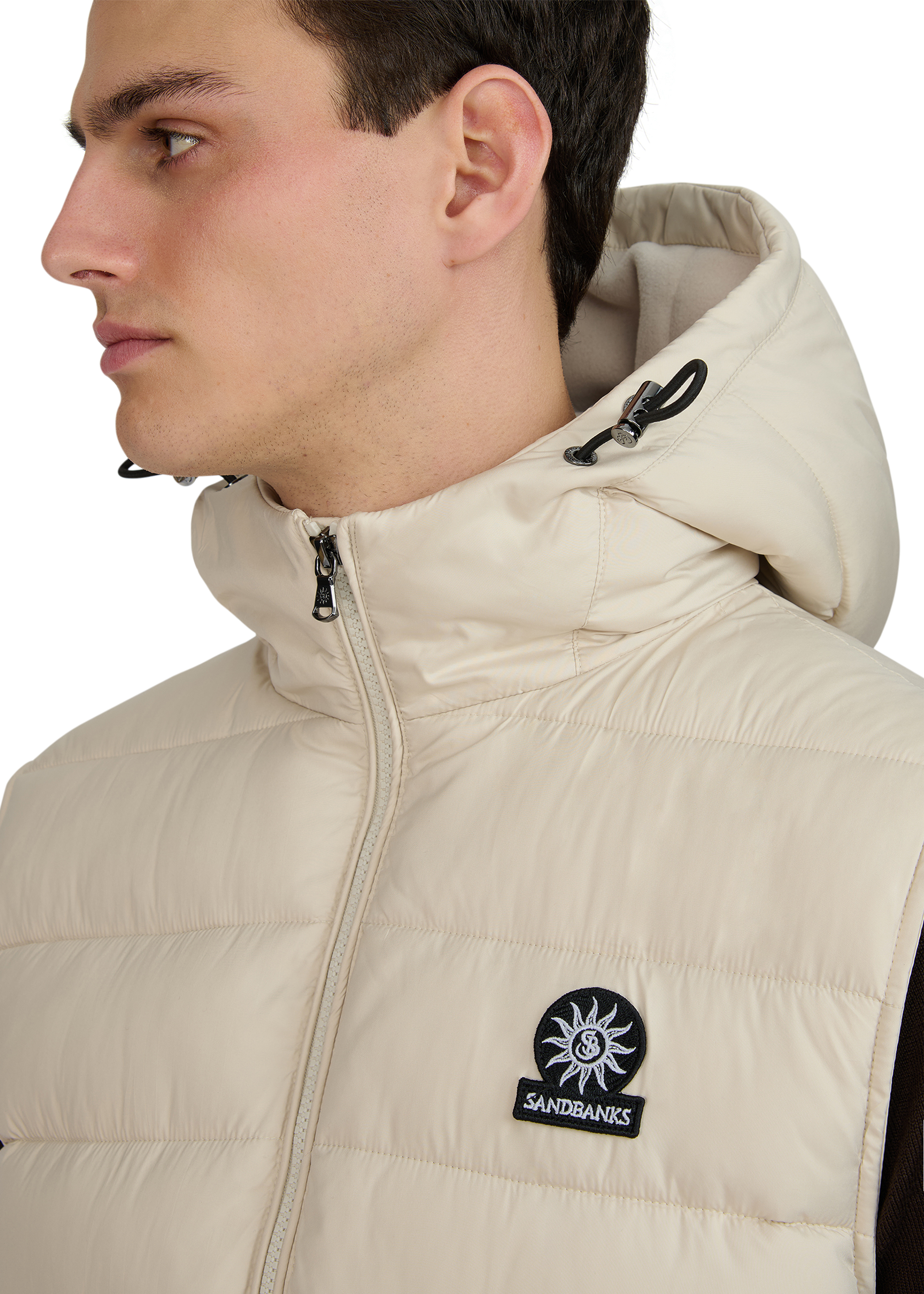 Sandbanks Frontier Hooded Puffer Gilet in stone. This lightweight gilet is made almost entirely from recycled plastic bottles and features a Sandbanks ottoman embroidered chest badge, a 2-way YKK Vislon central zip, YKK coil side entry pockets with fleece lining, and a micro polar fleece lined hood with cord adjusters.