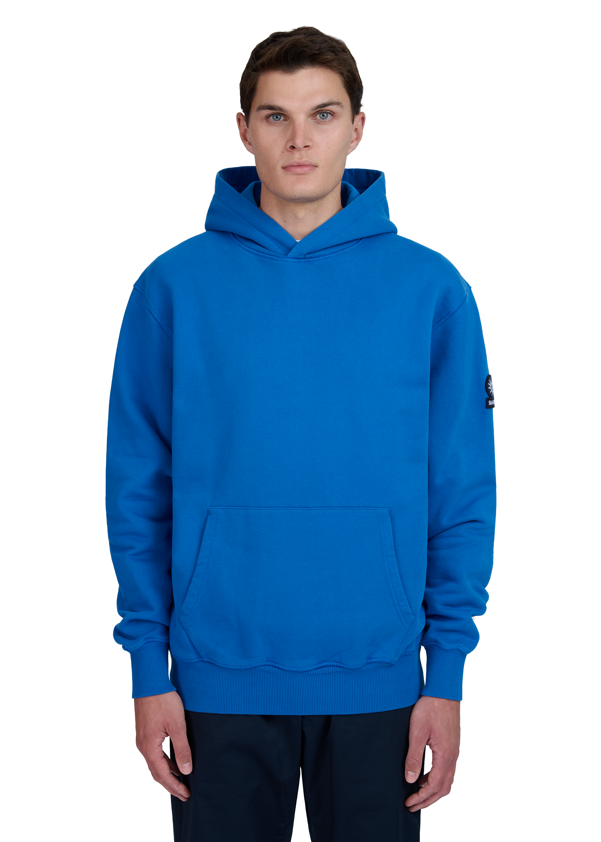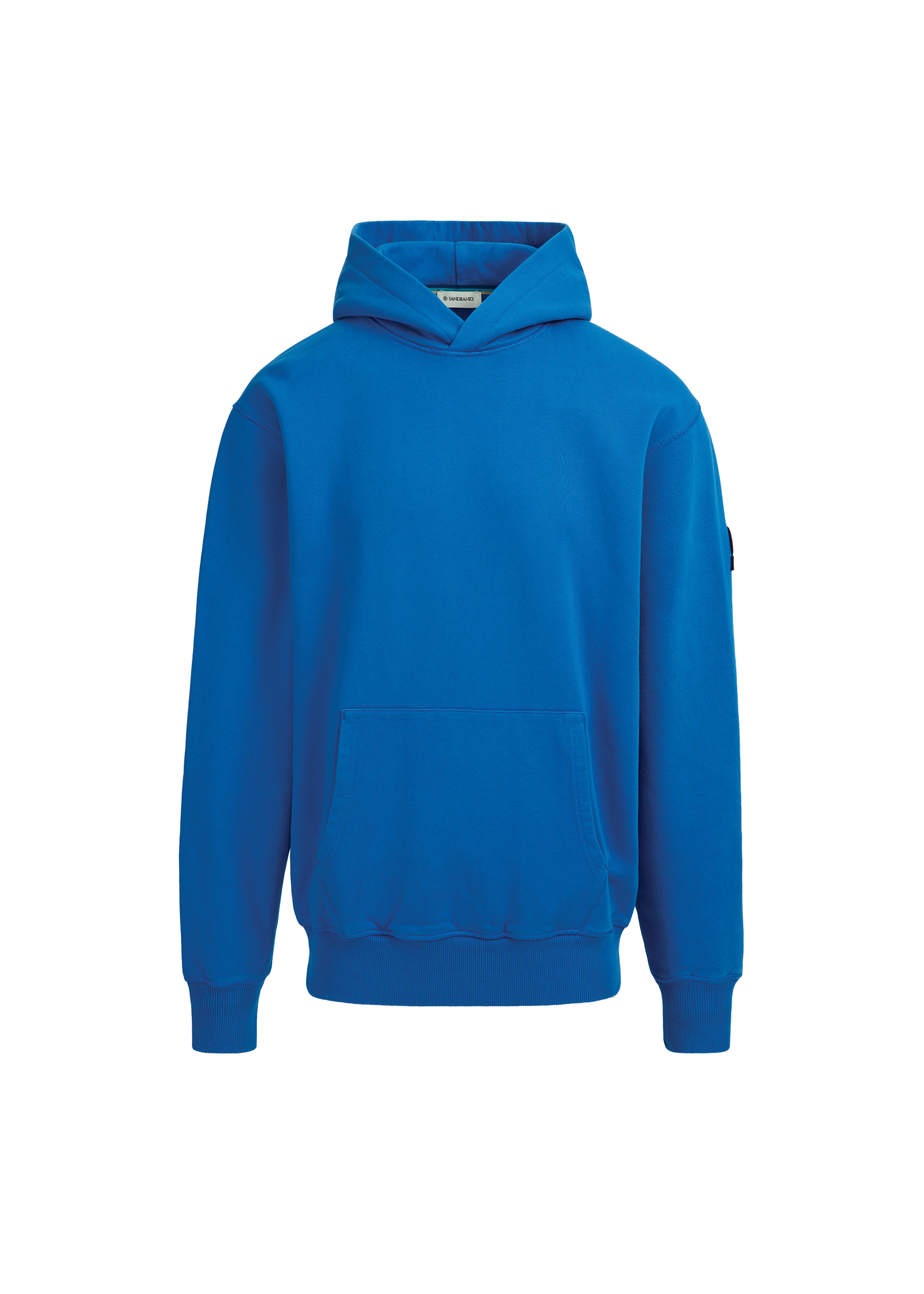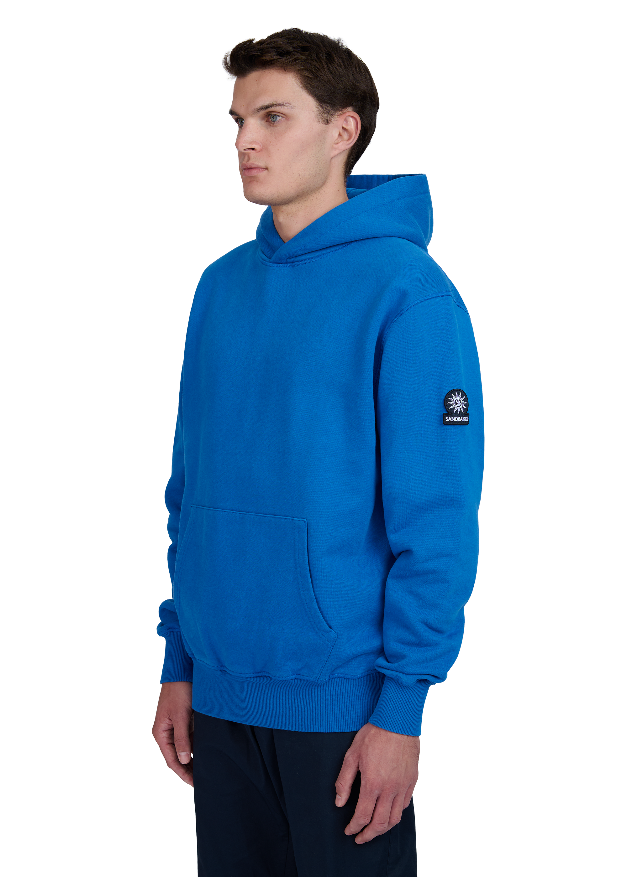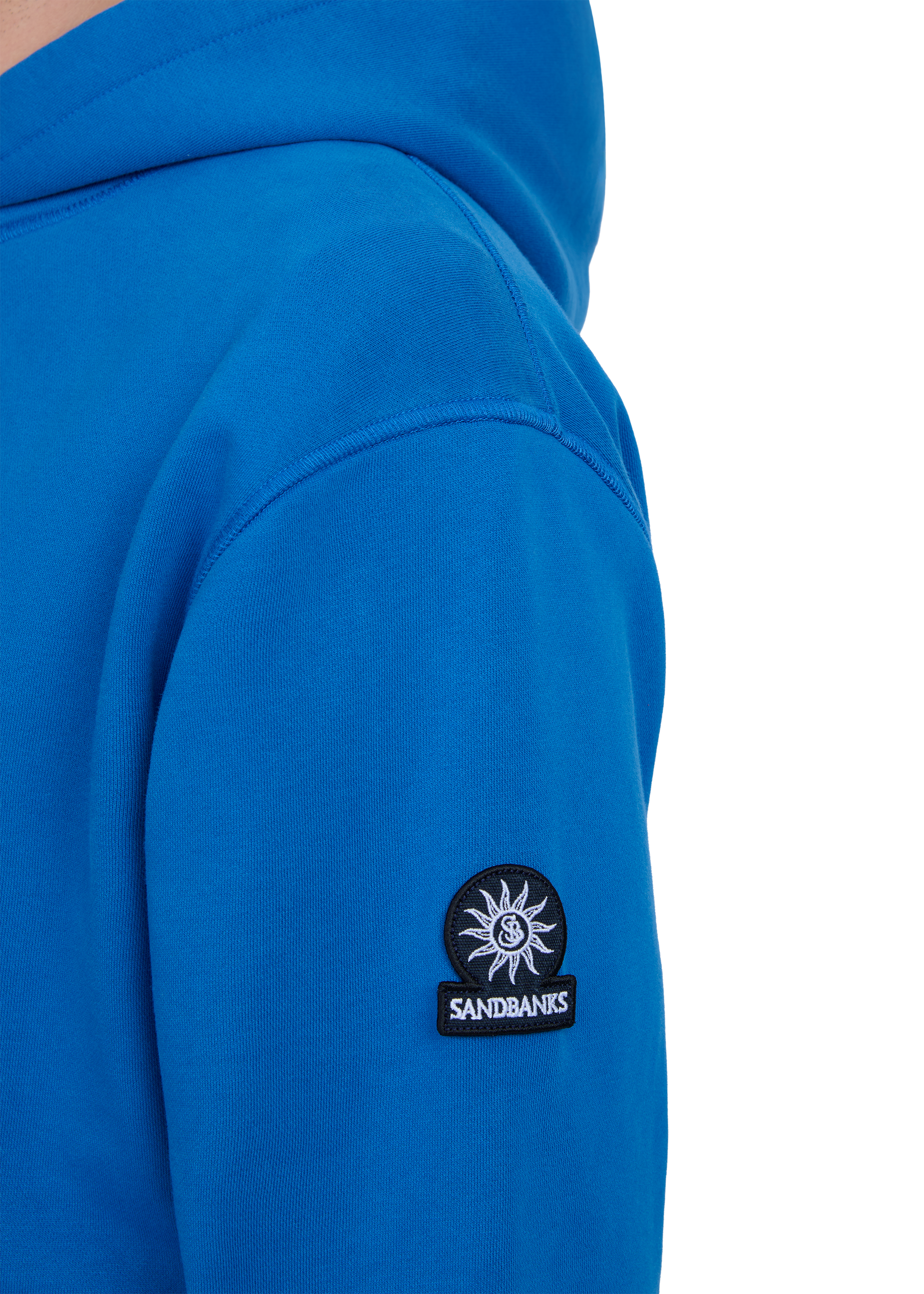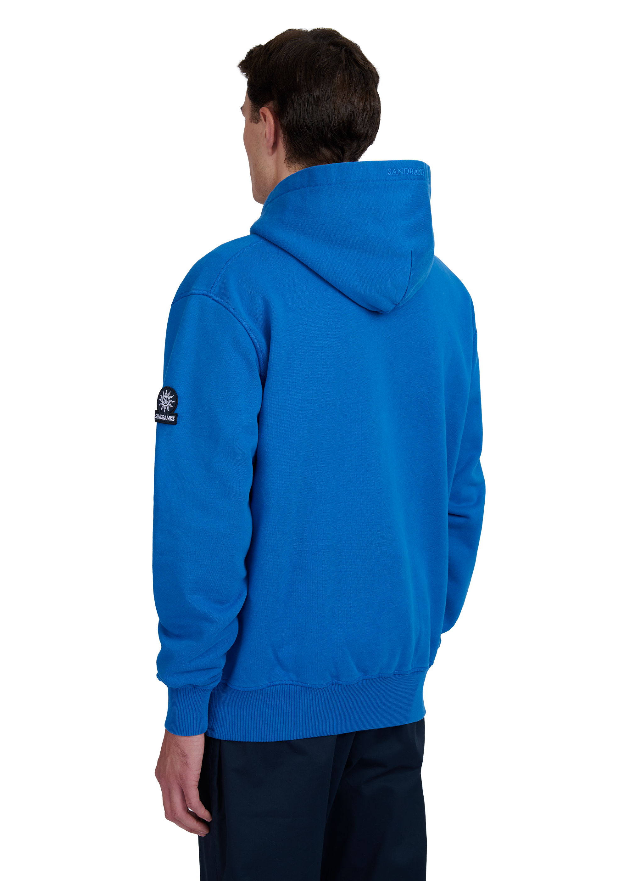 Our new and improved men's Sandbanks badge logo hoodie in cobalt blue. This garment has been upgraded with a 400gsm diagonal knitted fabric that features a slight brushed back for a superior soft feeling and warmth, whilst remaining breathable. Made from 100% BCI Cotton with a sleeve embroidered badge logo and cover stitch details.