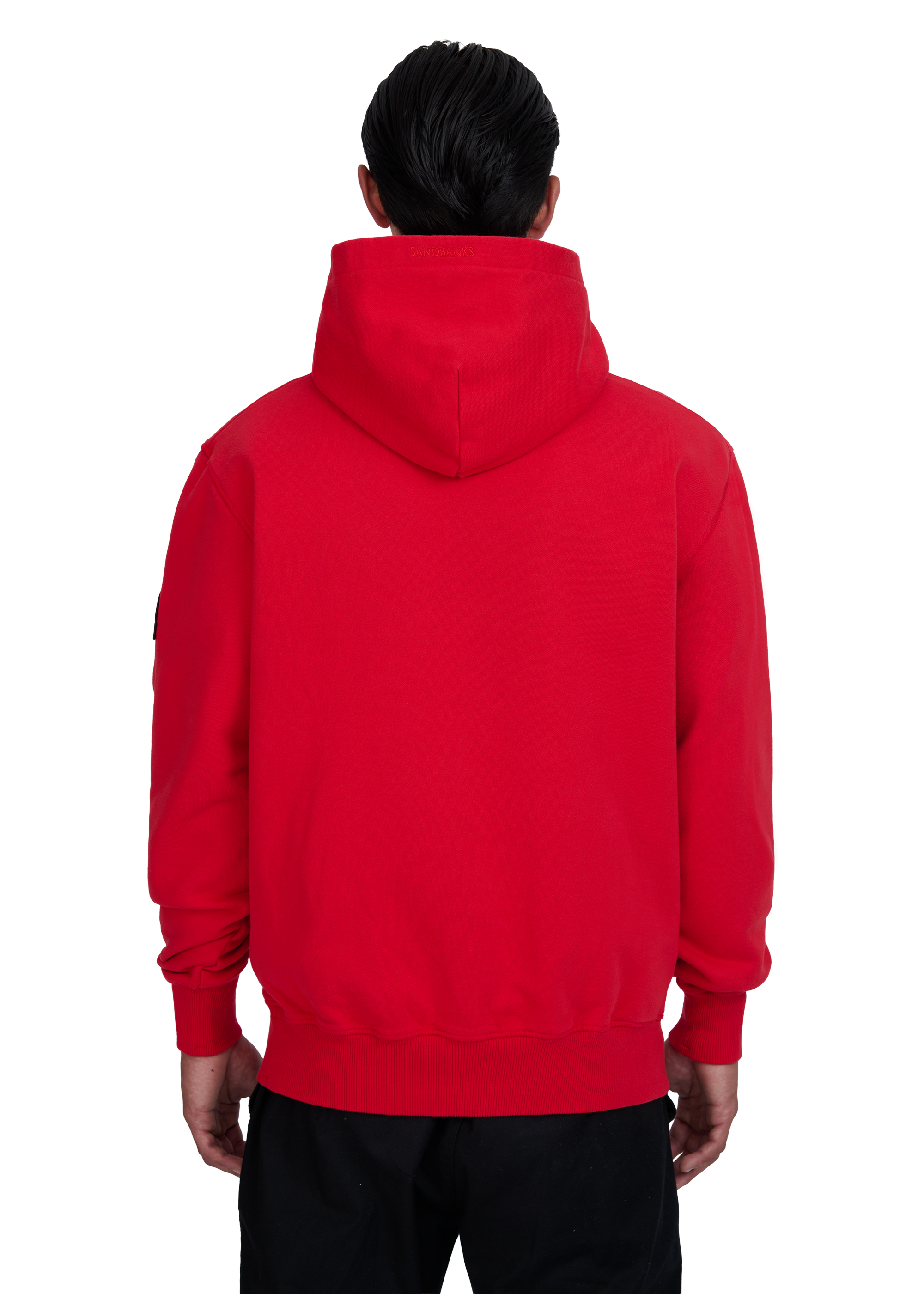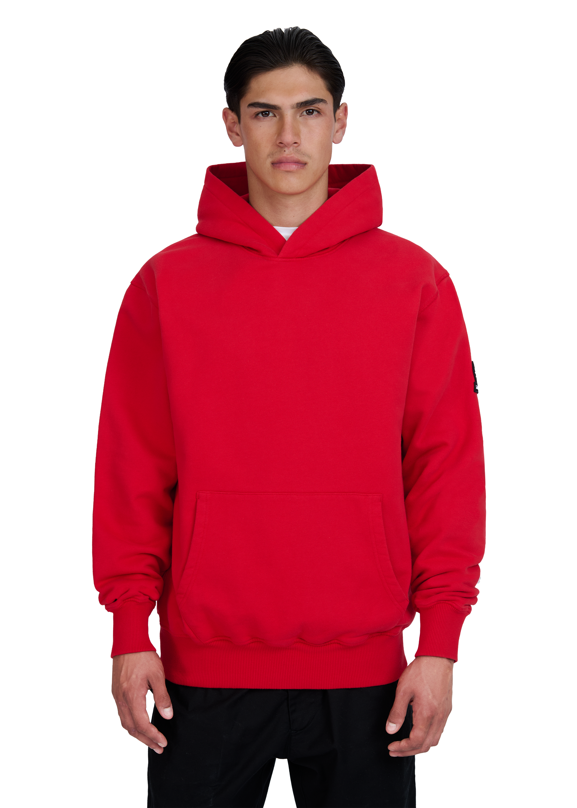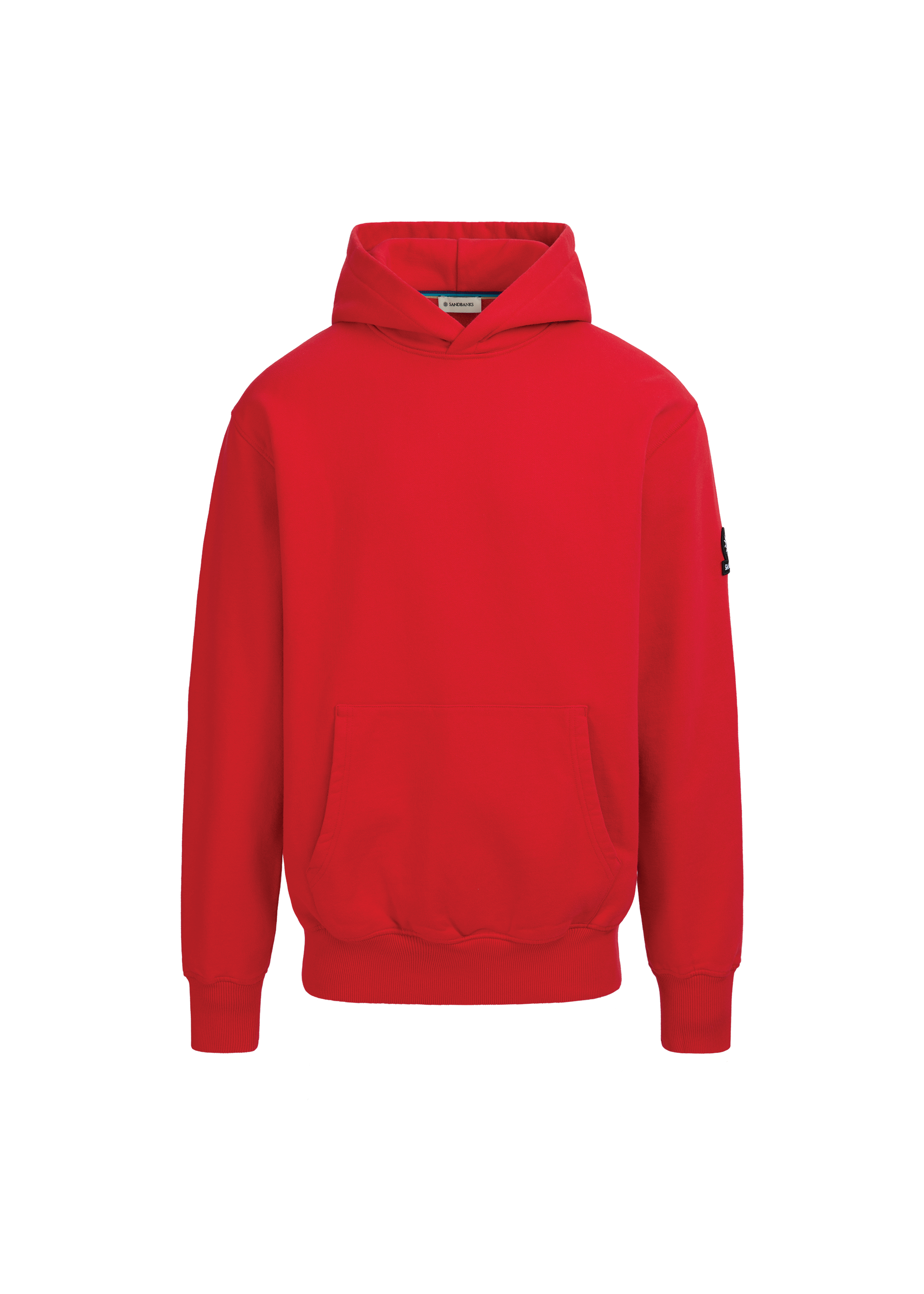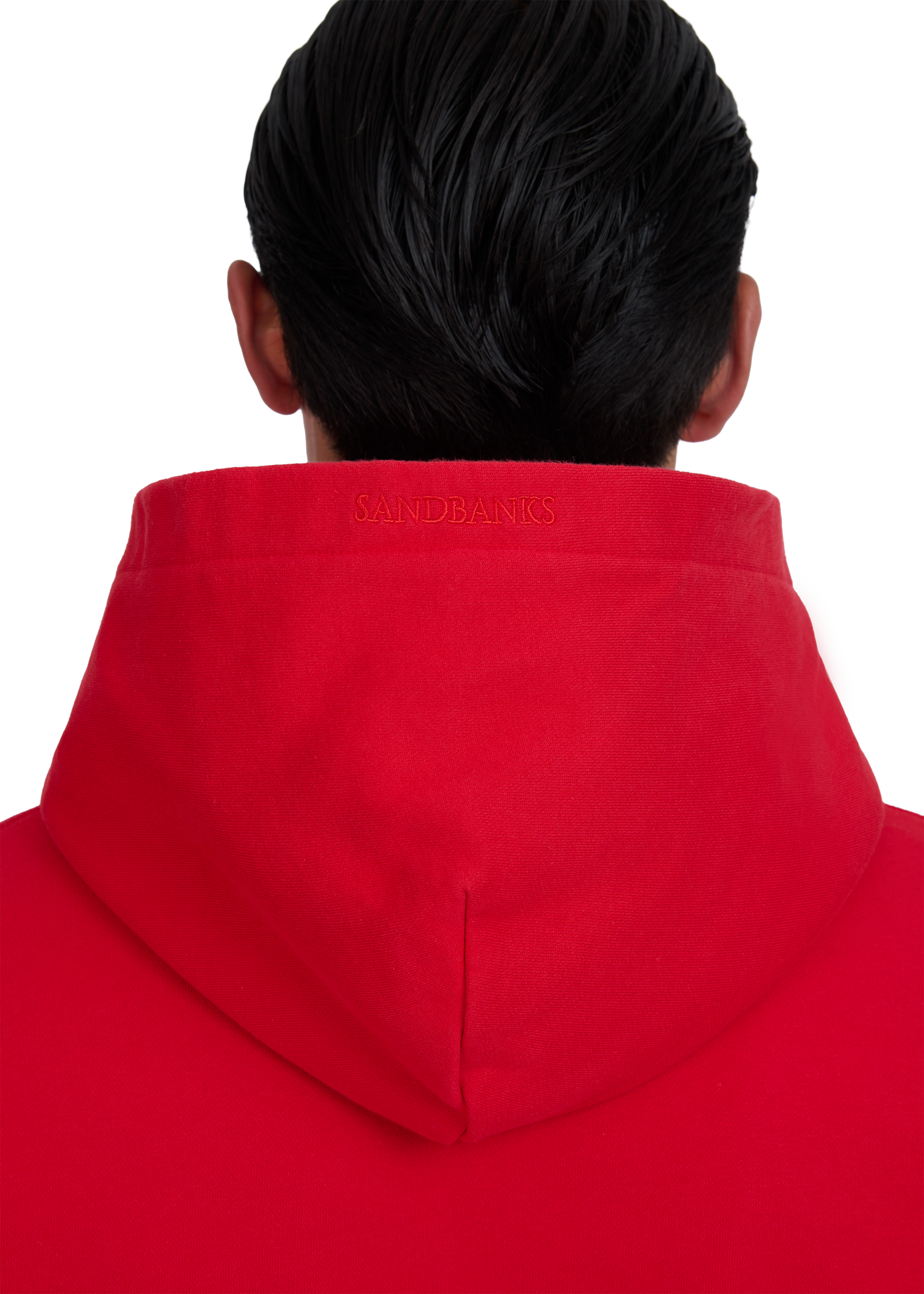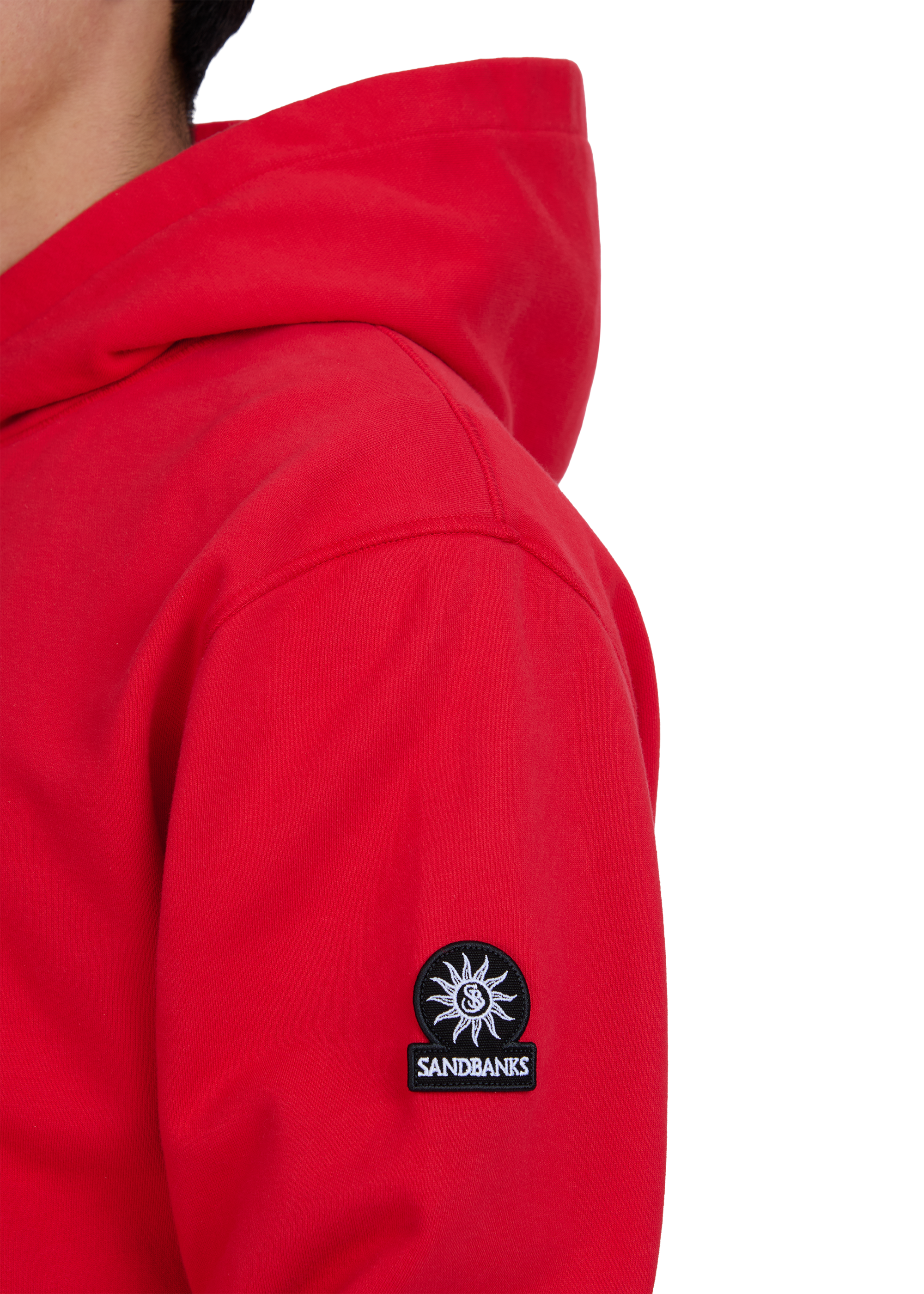 Our new and improved men's Sandbanks badge logo hoodie in red. This garment has been upgraded with a 400gsm diagonal knitted fabric that features a slight brushed back for a superior soft feeling and warmth, whilst remaining breathable. Made from 100% BCI Cotton with a sleeve embroidered badge logo and cover stitch details.