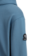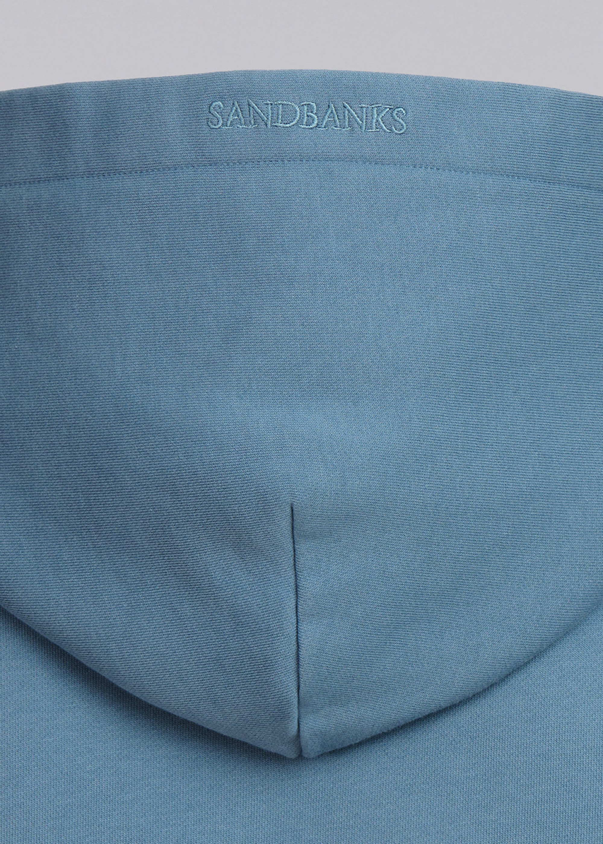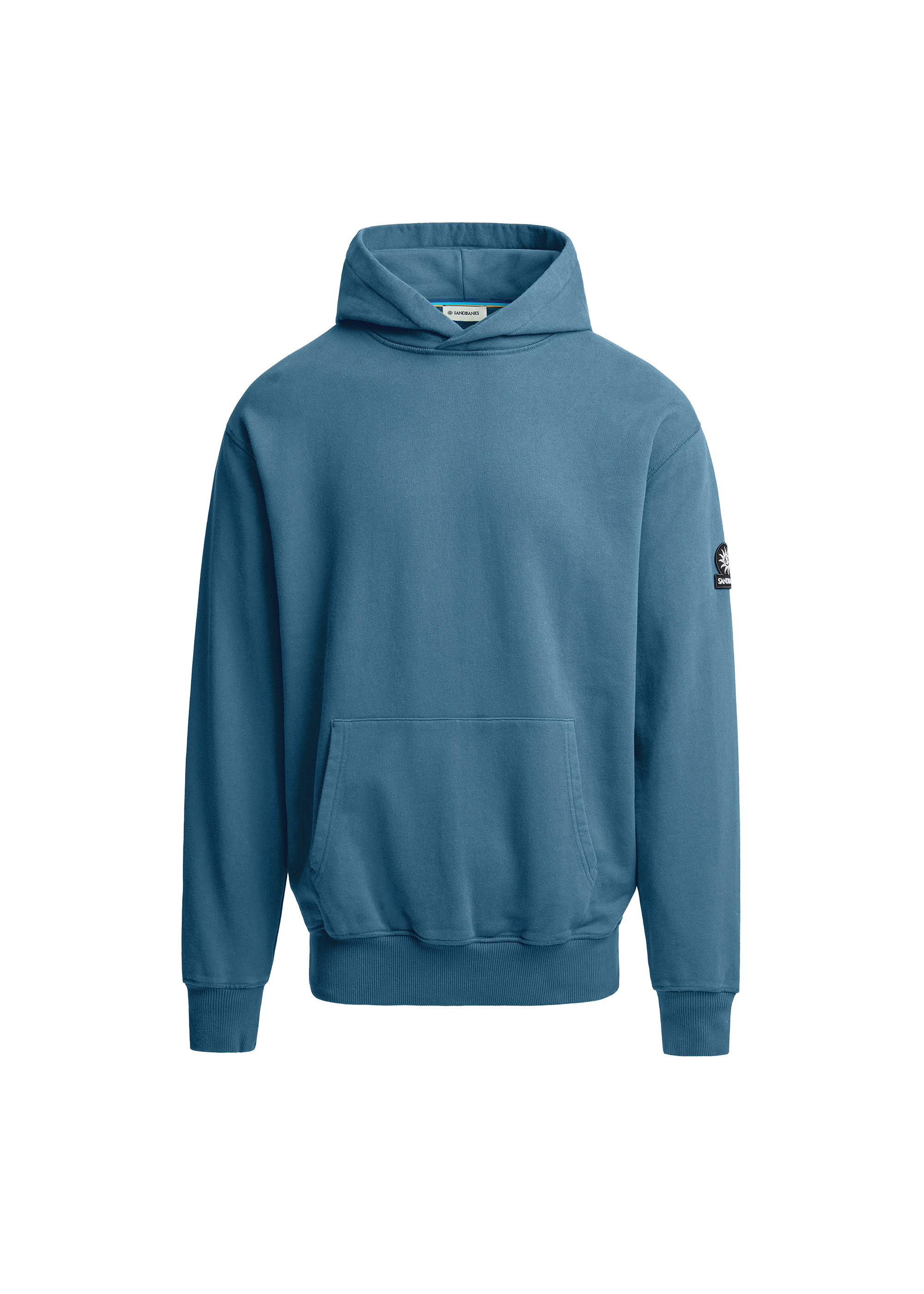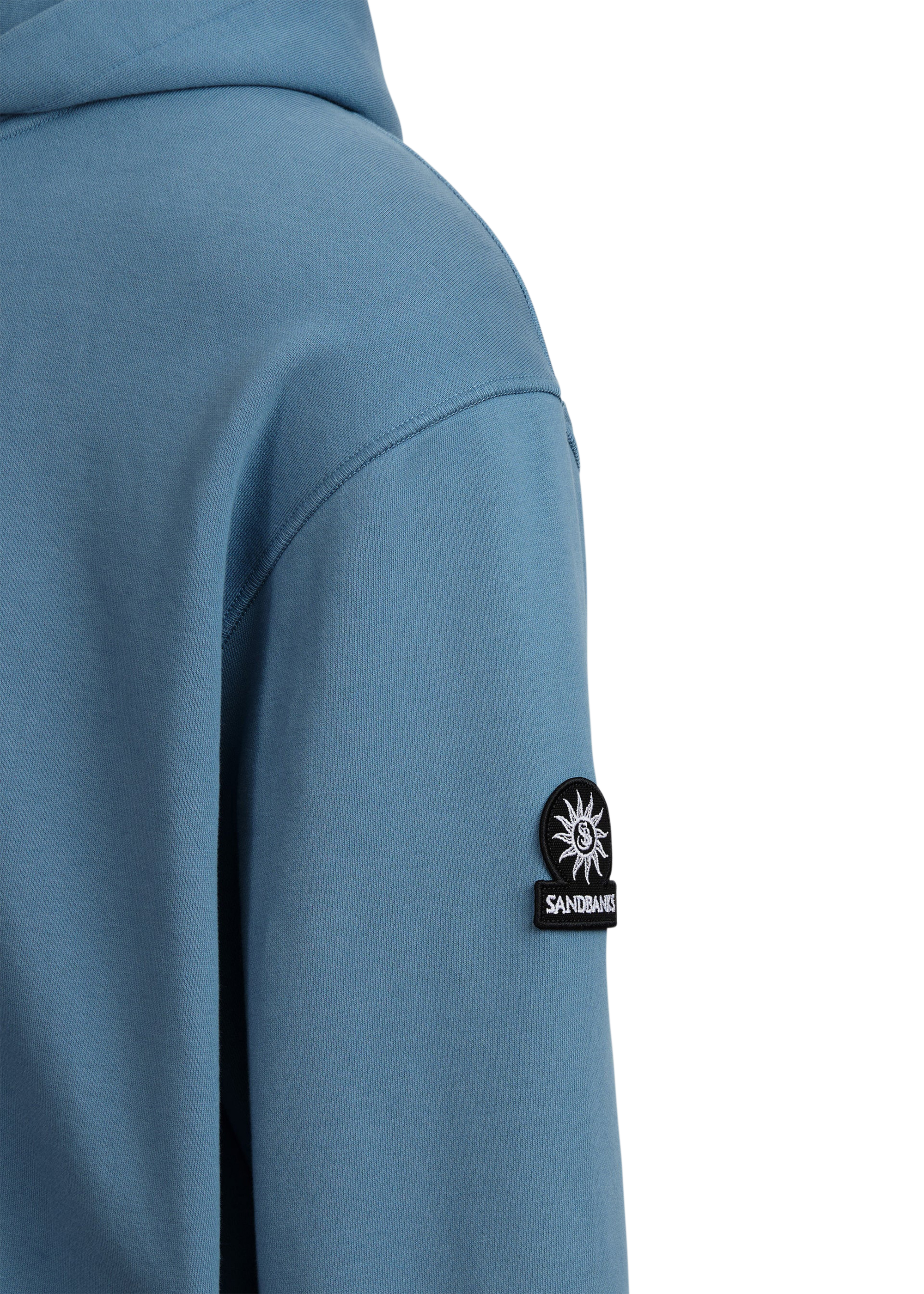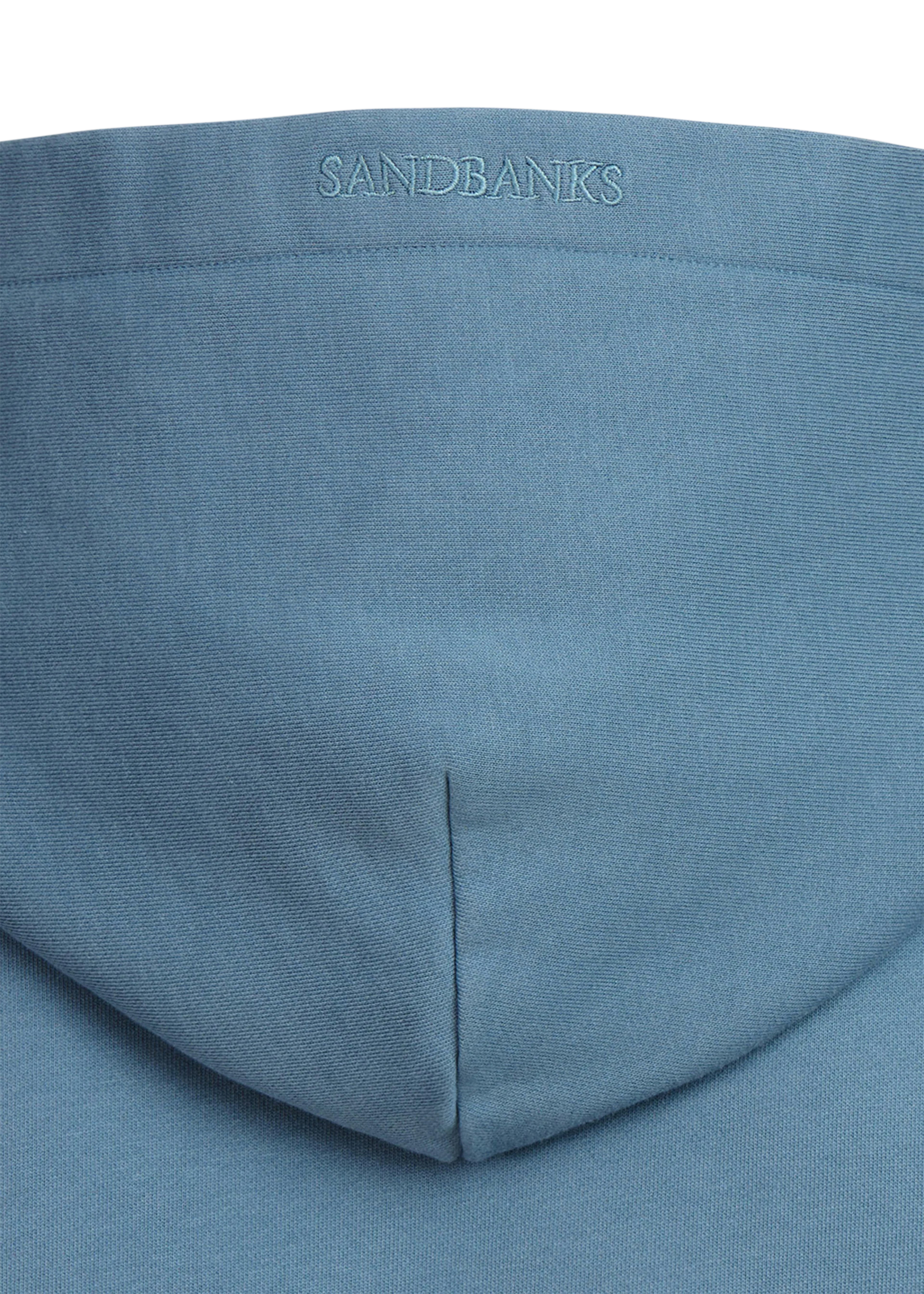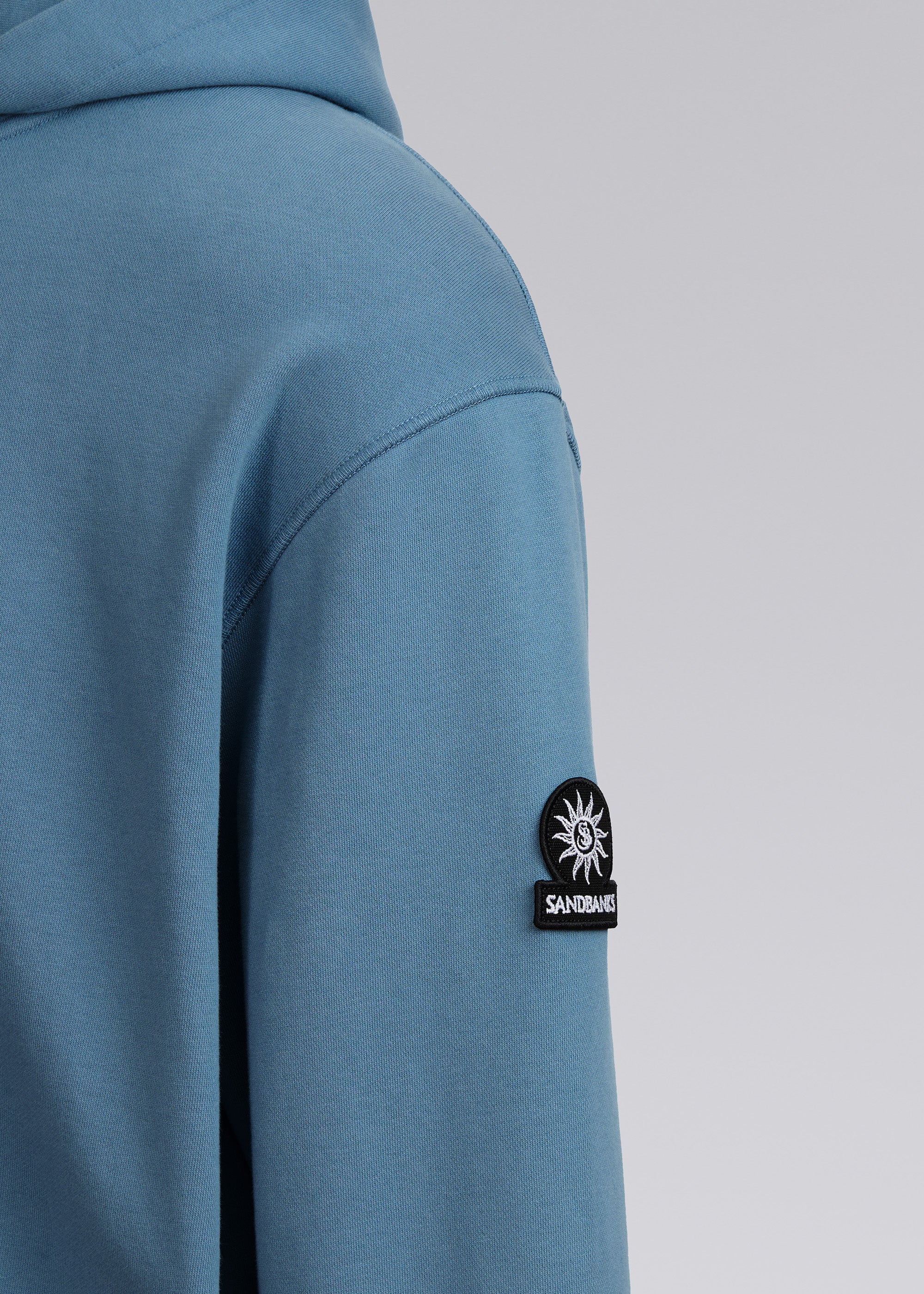 Our new and improved men's Sandbanks badge logo hoodie in teal. This garment has been upgraded with a 400gsm diagonal knitted fabric that features a slight brushed back for a superior soft feeling and warmth, whilst remaining breathable. Made from 100% BCI Cotton with a sleeve embroidered badge logo and cover stitch details.