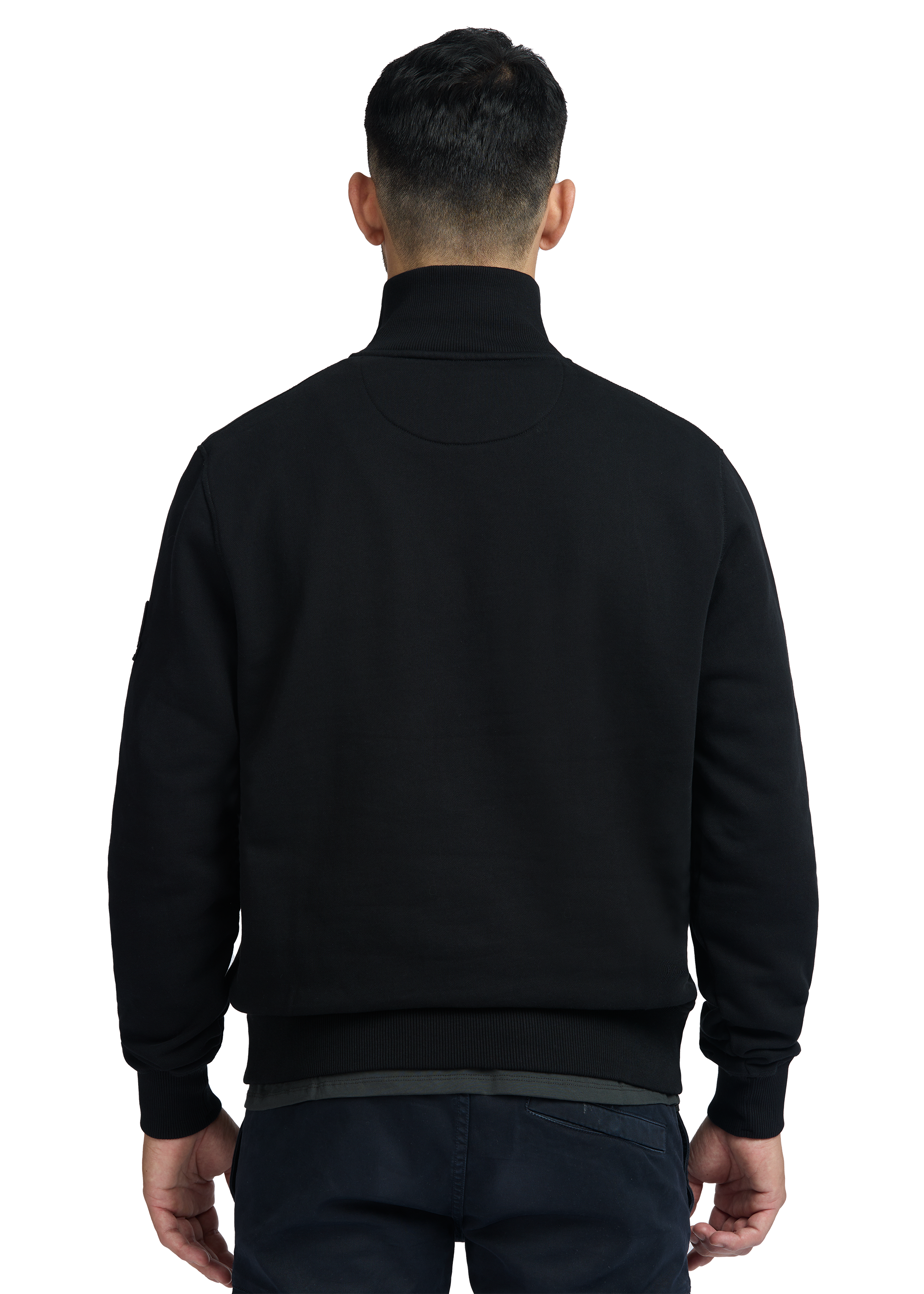 Sandbanks badge logo quarter zip sweatshirt in black, made from a 400gsm diagonal knitted 100% BCI cotton fabric that features a slight brushed back for a superior soft feeling and warmth, whilst remaining breathable. This quarter zip sweatshirt features a Lampo metal zip in silver with a ribbed neck.