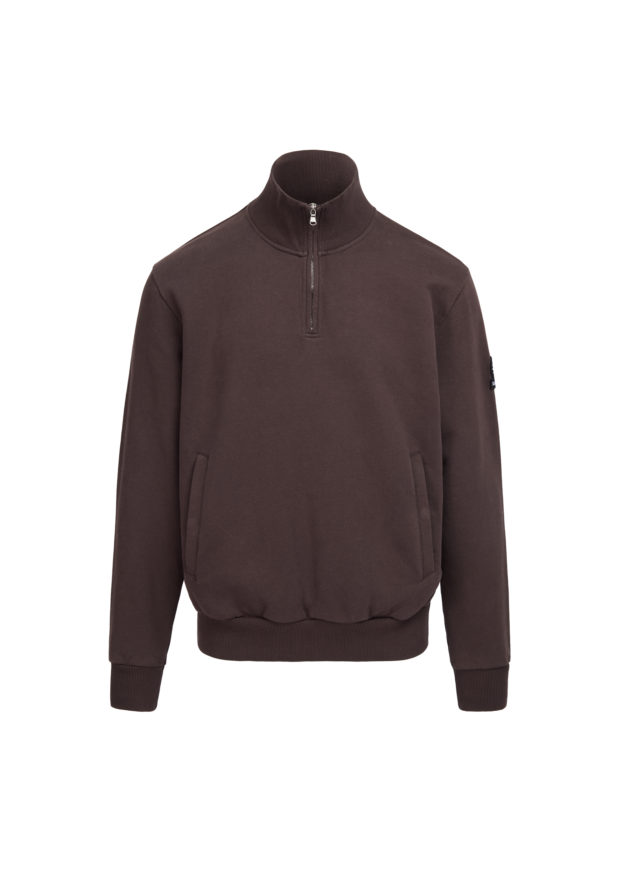 Sandbanks badge logo quarter zip sweatshirt in brown, made from a 400gsm diagonal knitted 100% BCI cotton fabric that features a slight brushed back for a superior soft feeling and warmth, whilst remaining breathable. This quarter zip sweatshirt features a Lampo metal zip in silver with a ribbed neck.