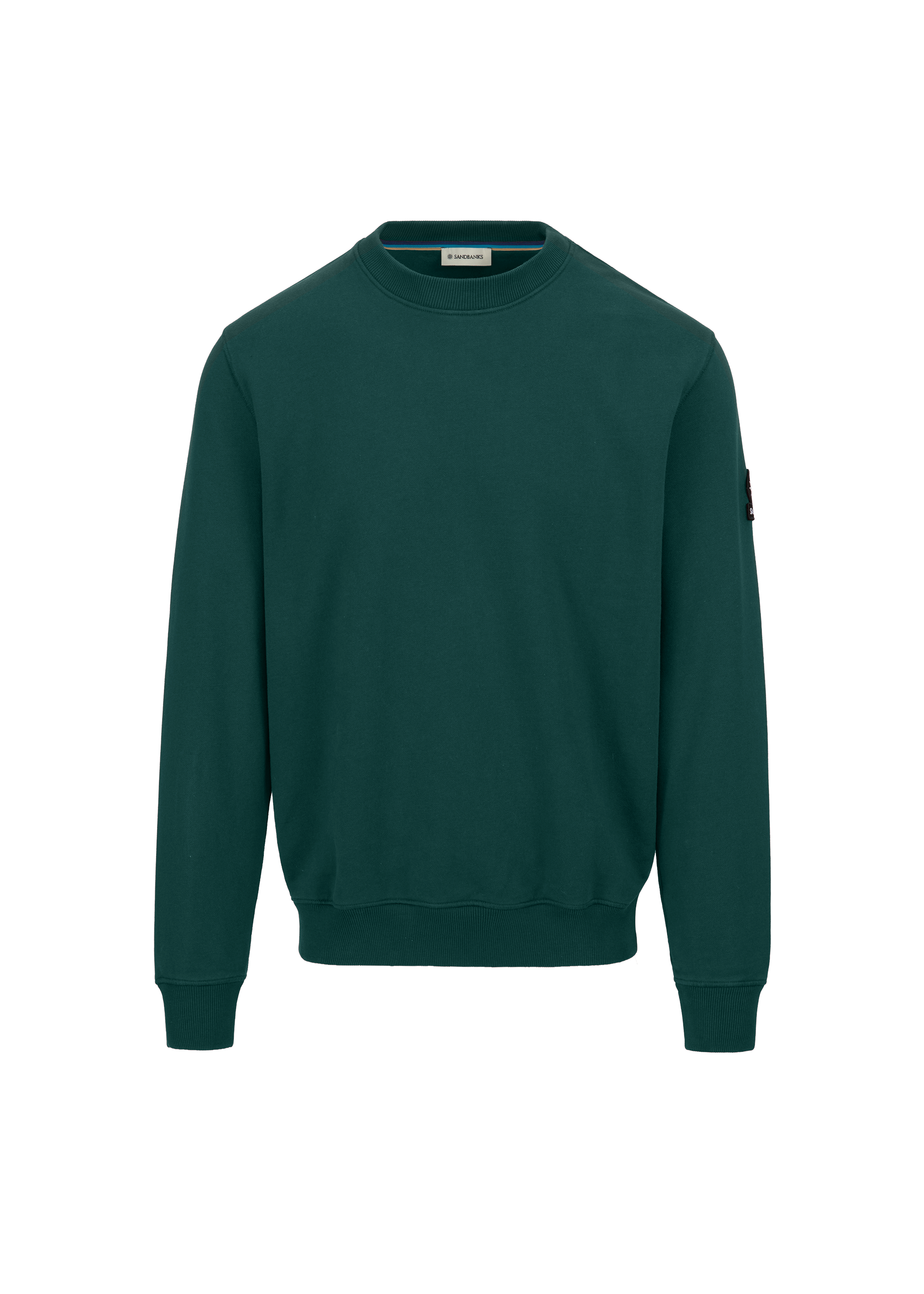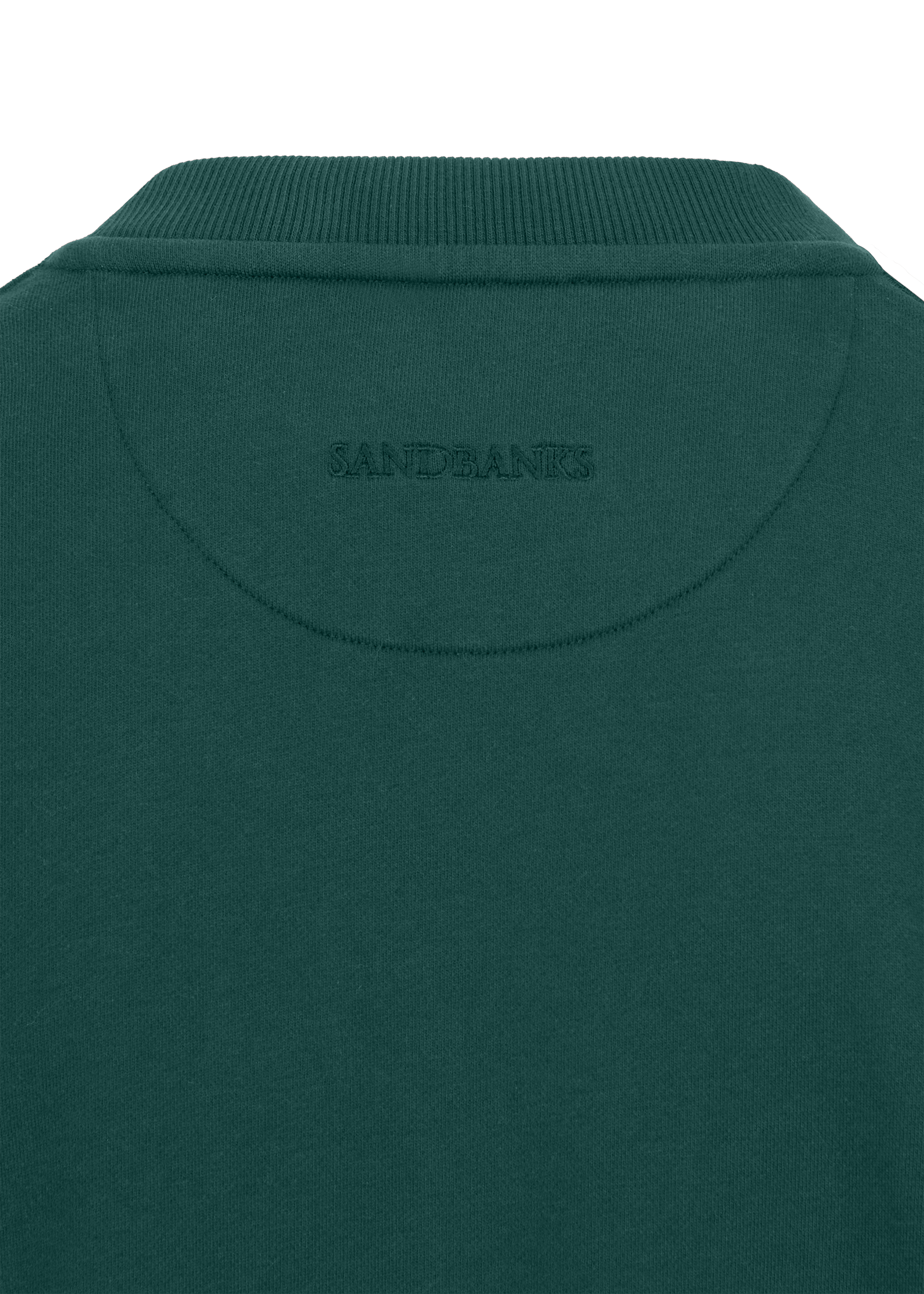Sandbanks badge logo sweatshirt in emerald green. This garment has been upgraded with a 380gsm diagonal knitted fabric that features a slight brushed back for a superior soft feeling and warmth, whilst remaining breathable. Made from a 95% cotton 5% elastane for improved feel, shape retention and finished with a sleeve embroidered badge logo and cover stitch details.