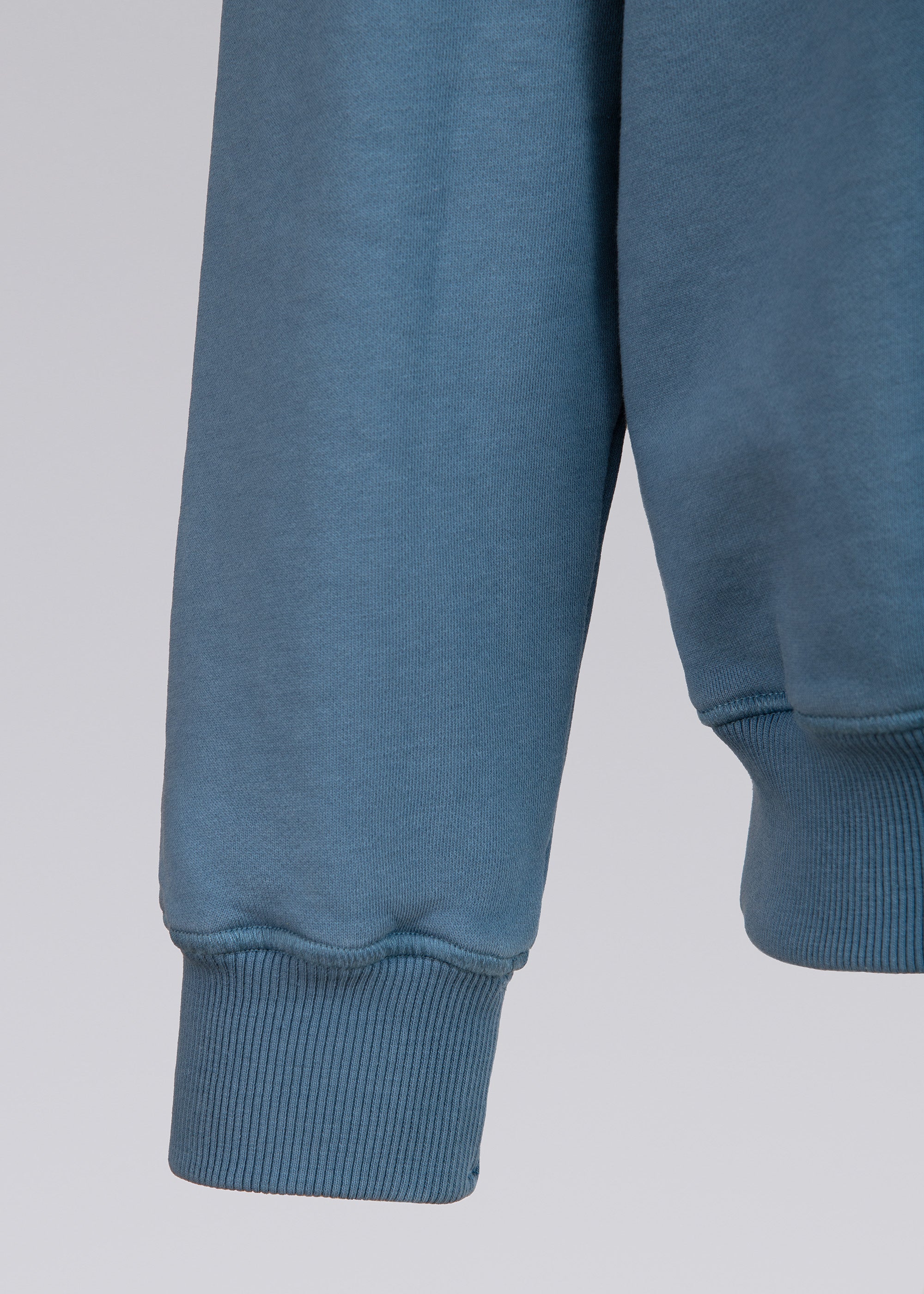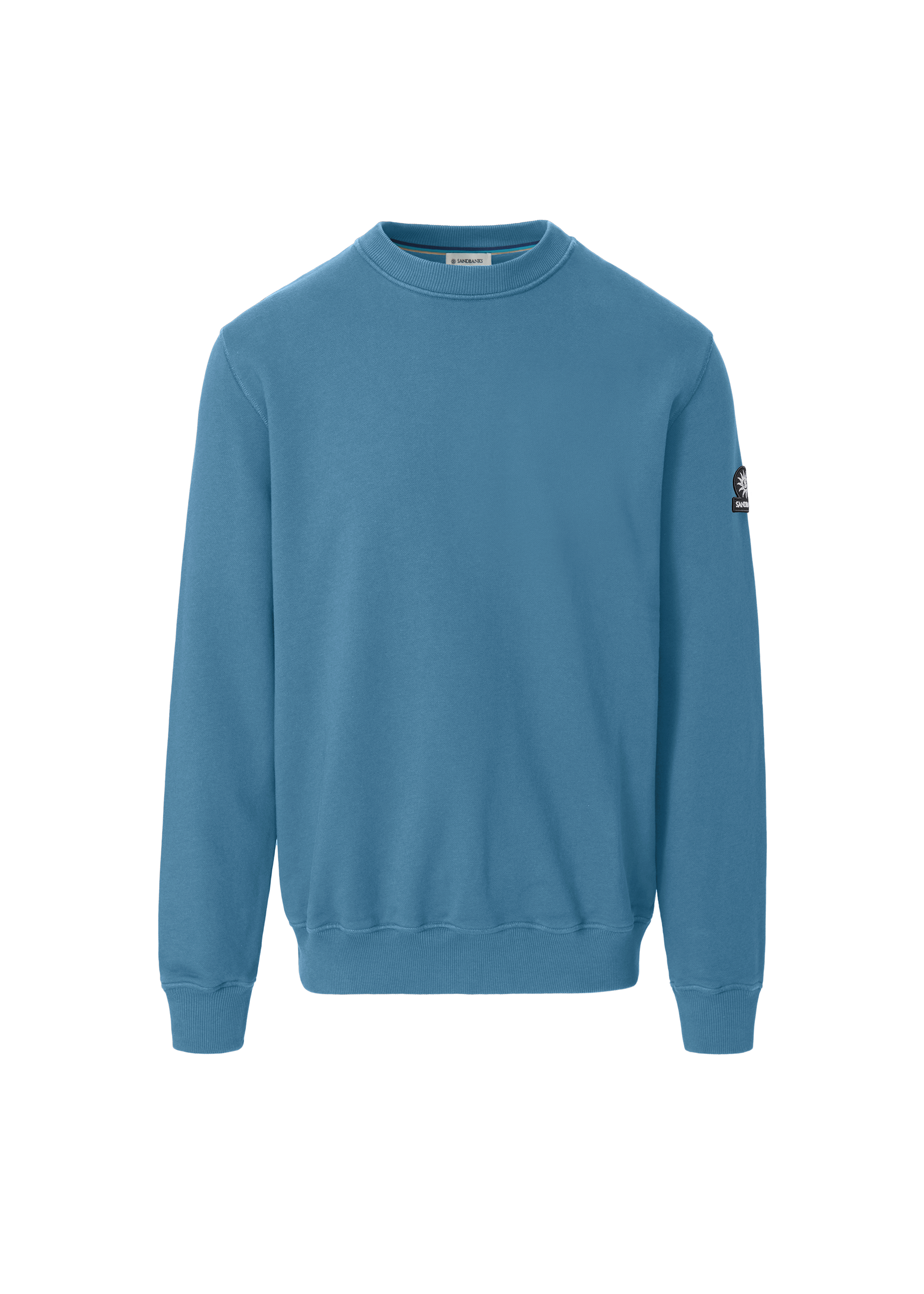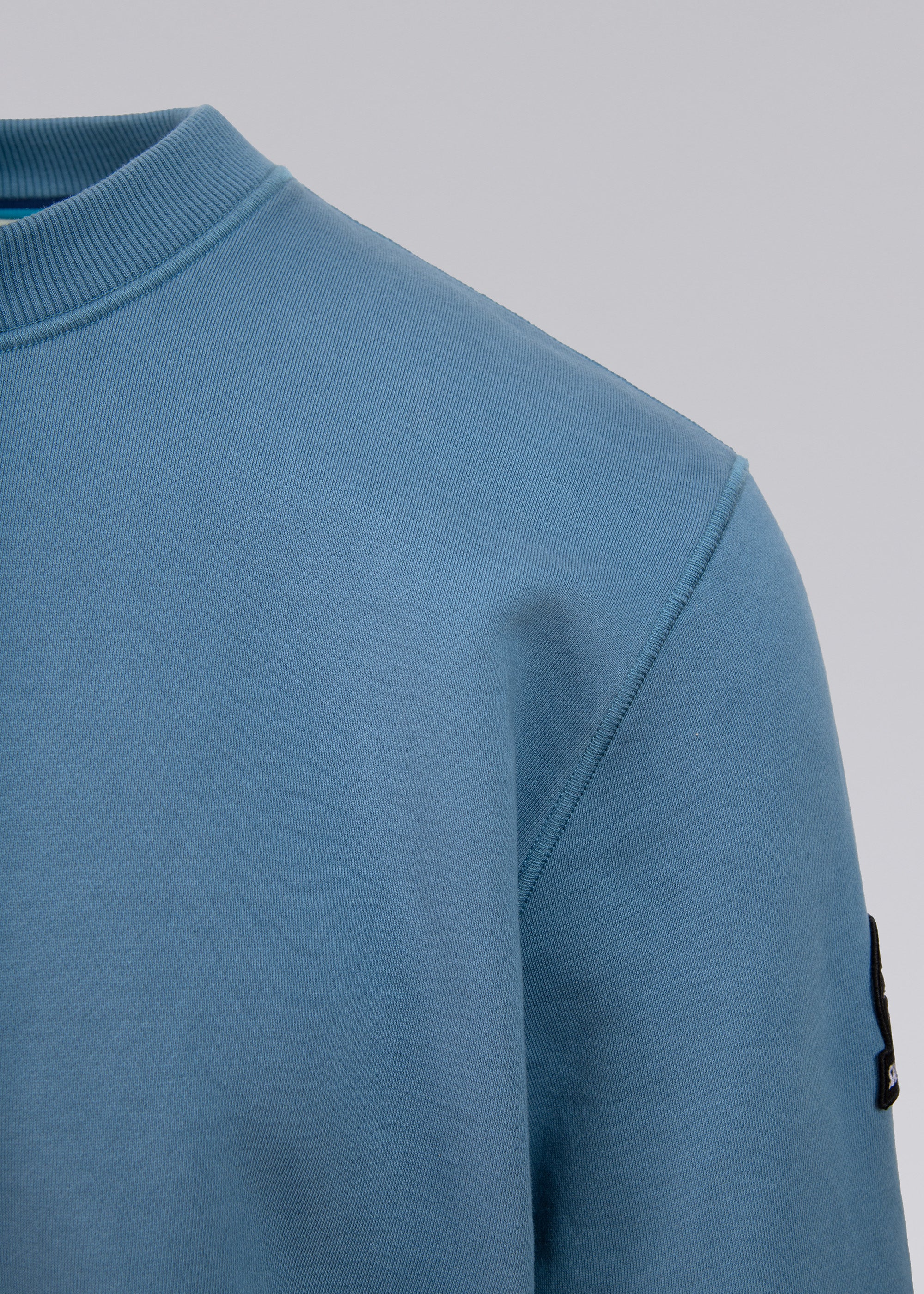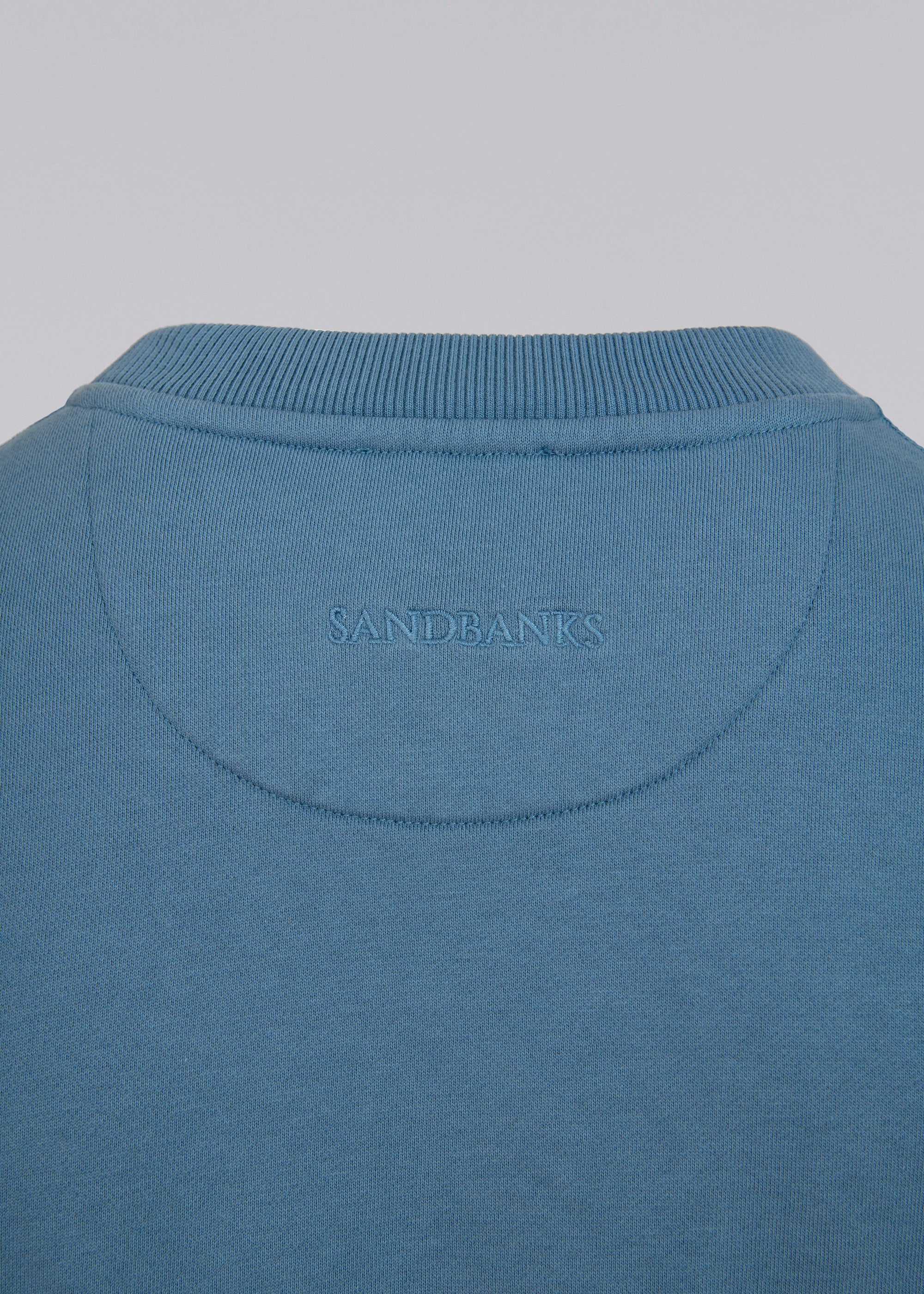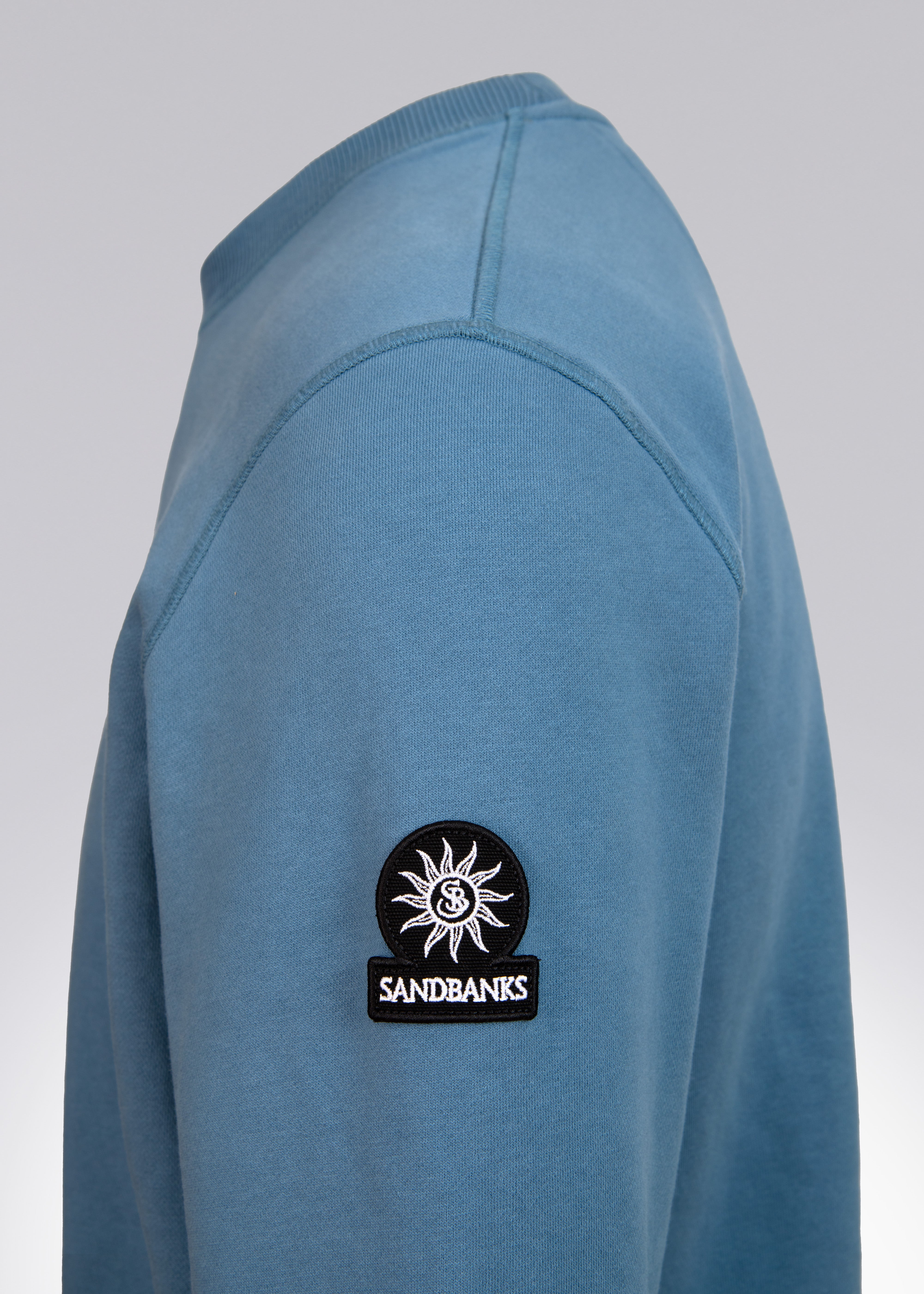 Our new and improved men's Sandbanks badge logo sweatshirt in teal. This garment has been upgraded with a 400gsm diagonal knitted fabric that features a slight brushed back for a superior soft feeling and warmth, whilst remaining breathable. Made from 100% BCI Cotton with a sleeve embroidered badge logo and cover stitch details.