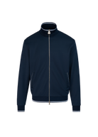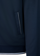 Sandbanks men's tricot track jacket in navy. Crafted from smooth 360 GSM tricot fabric with a clean, structured finish, it features a rib with contrast stripe and a high-shine eco-silver branded Lampo metal zip. Finished with welt pockets with concealed snap closures and subtle Sandbanks embroidery at the neckline, the design combines function with signature detailing. Designed to pair with the matching track pant.
