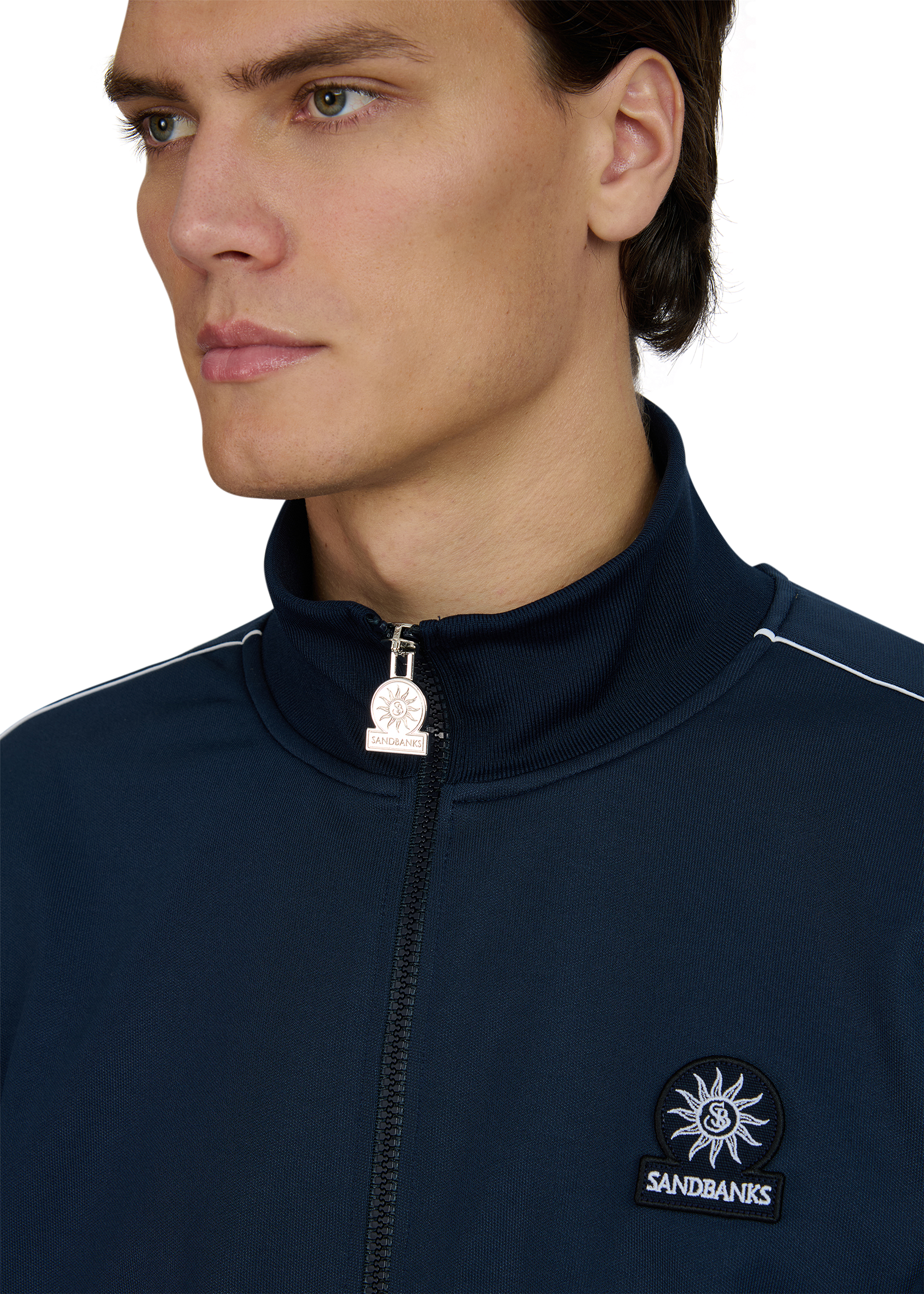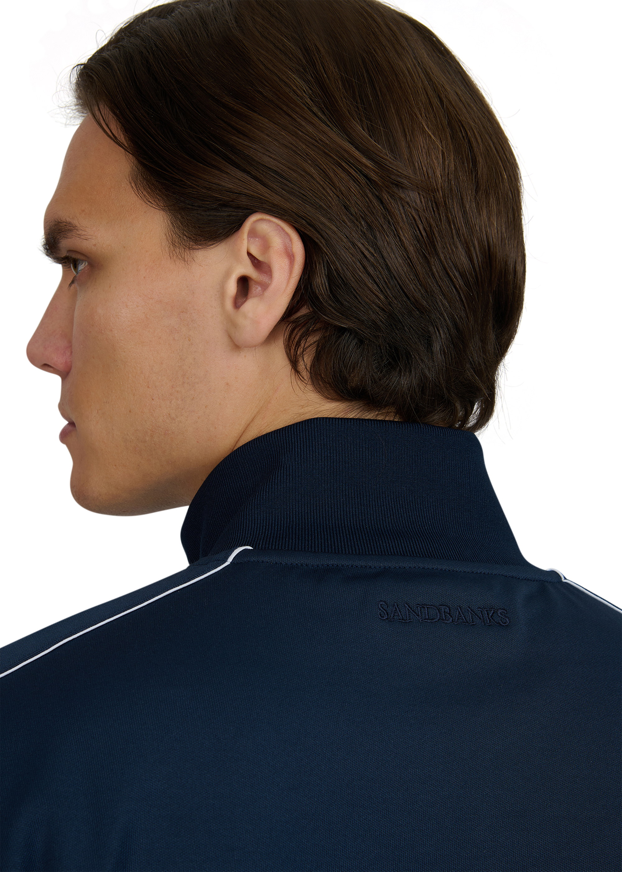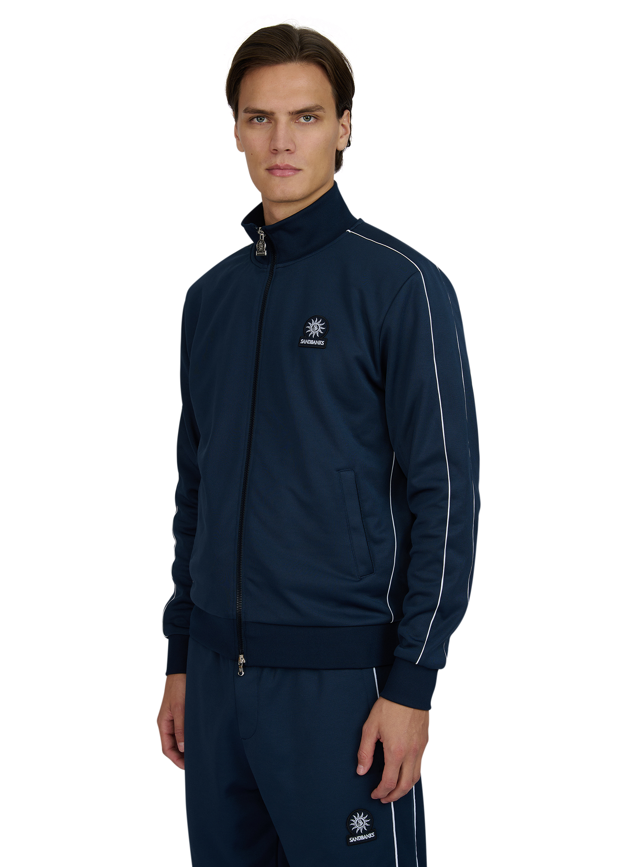 Sandbanks men's piped track jacket in navy. Crafted from smooth 360 GSM tricot fabric, it features white contrast piping that accentuates the lines of the silhouette. Detailed with a high-shine eco-silver Lampo logo puller, welt pockets with concealed snap closures, and tonal Sandbanks embroidery at the neckline, the design combines function with signature detailing. Designed to pair with the matching track pant.