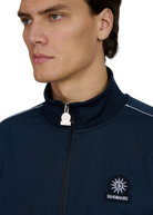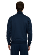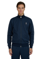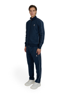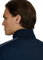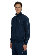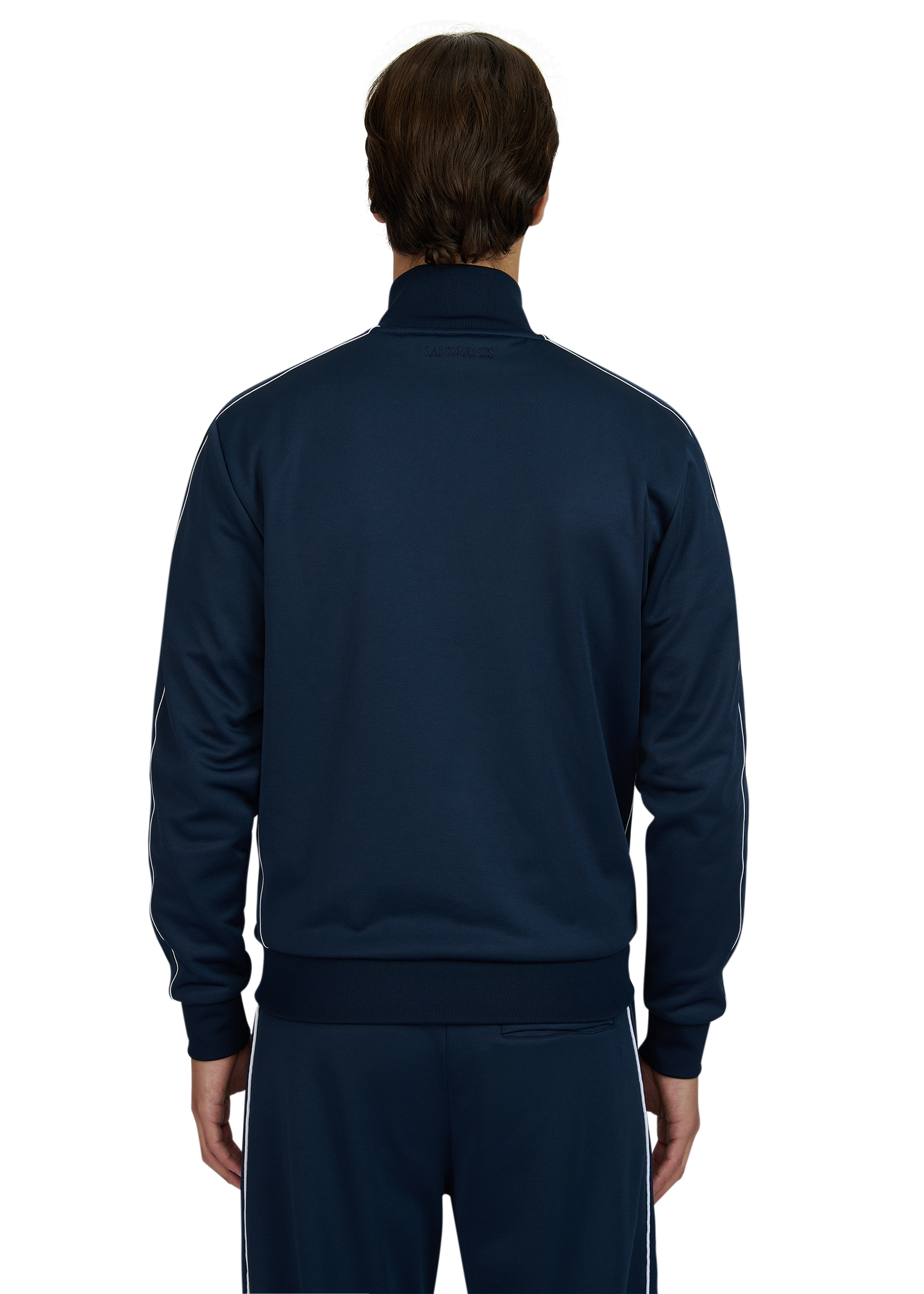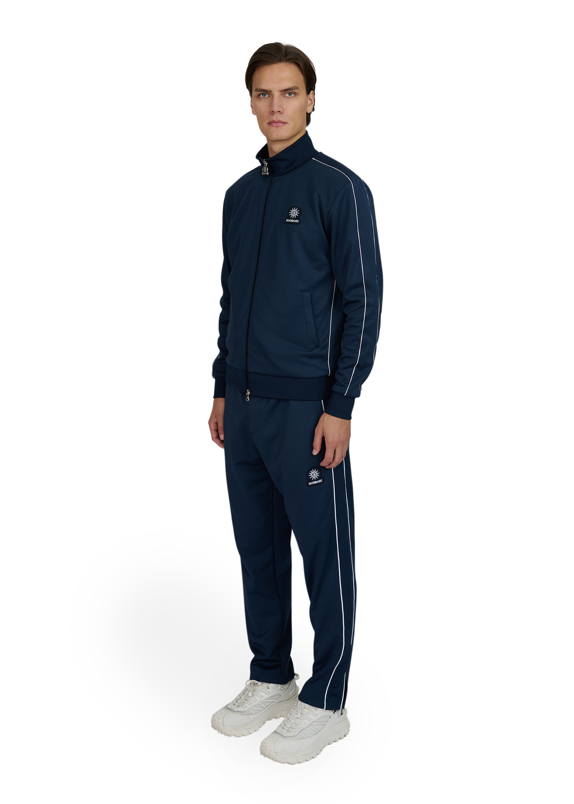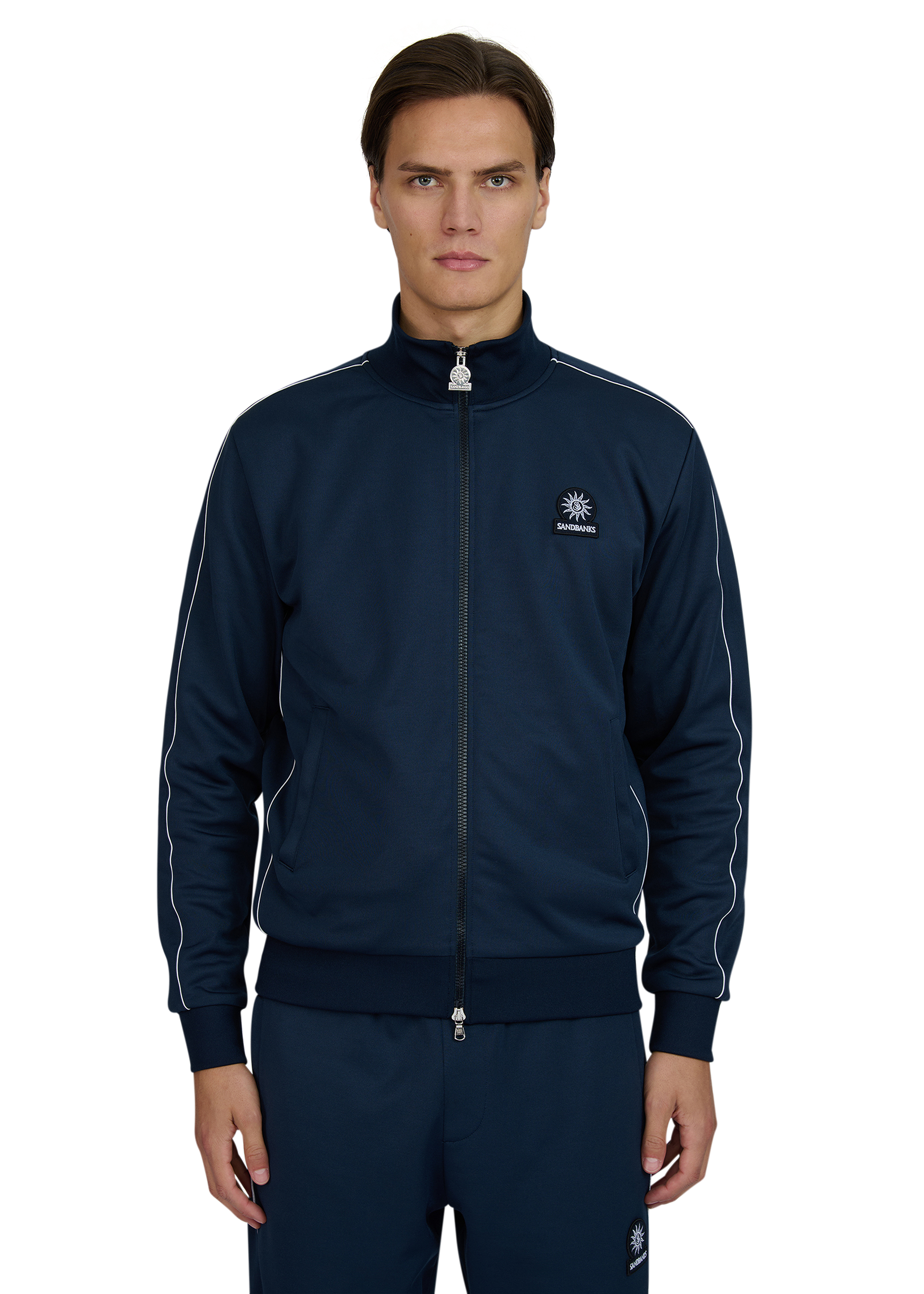 Sandbanks men's piped track jacket in navy. Crafted from smooth 360 GSM tricot fabric, it features white contrast piping that accentuates the lines of the silhouette. Detailed with a high-shine eco-silver Lampo logo puller, welt pockets with concealed snap closures, and tonal Sandbanks embroidery at the neckline, the design combines function with signature detailing. Designed to pair with the matching track pant.