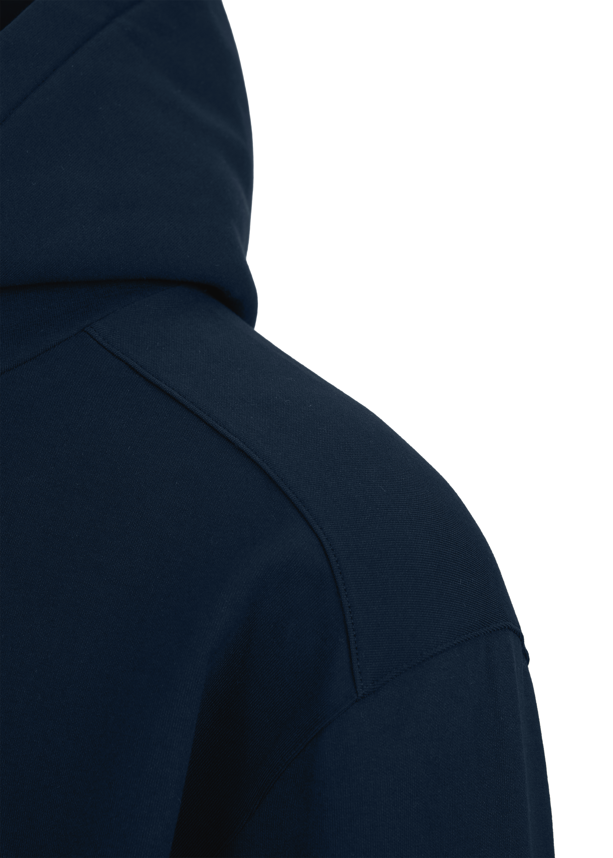 Sandbanks zip pocket hoodie in navy, crafted from premium 350gsm cotton interlock. Designed with a functional zip pocket highlighted by a contrasting embroidered Sandbanks badge logo, and finished with a signature tri-colour back neck binding.