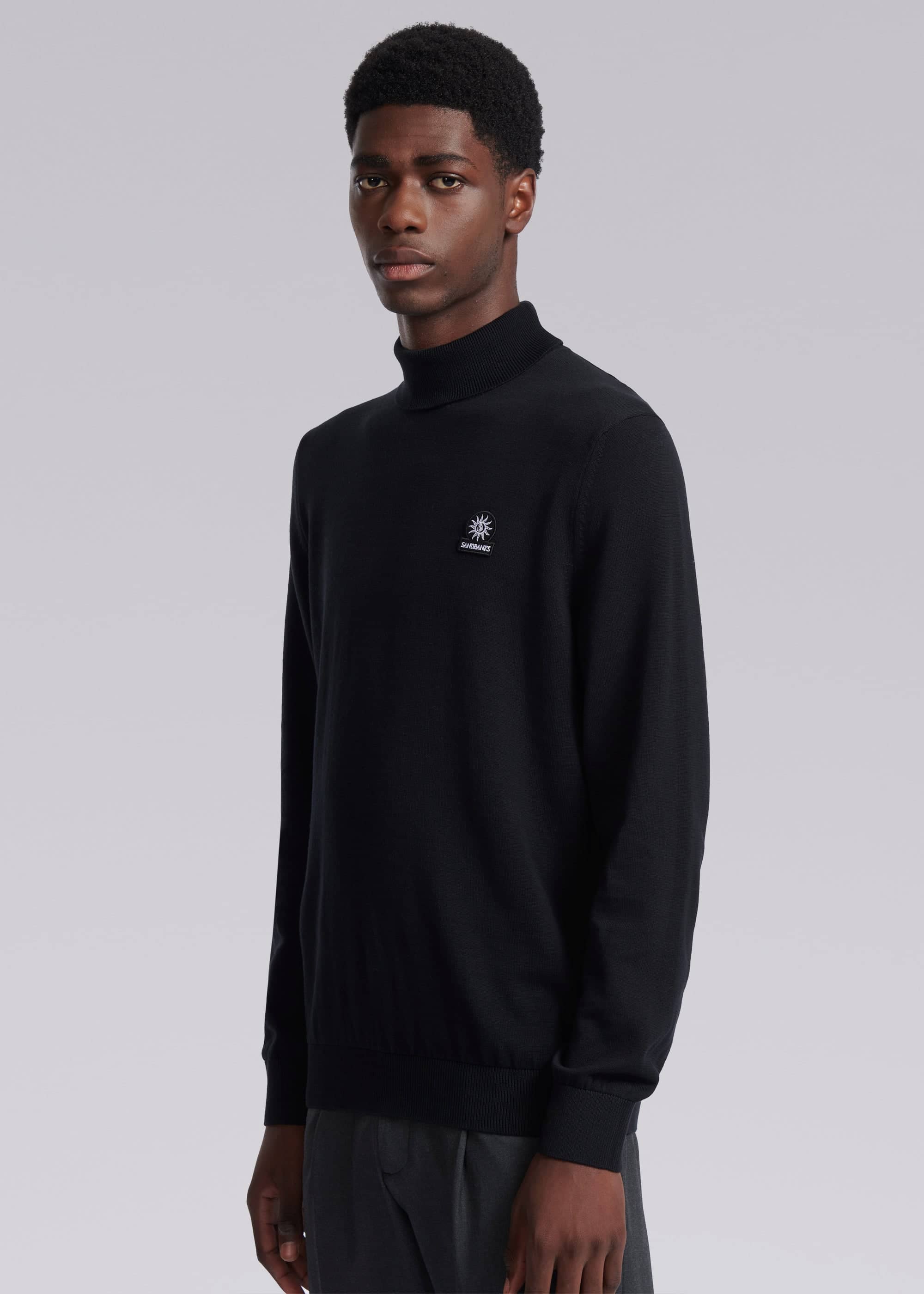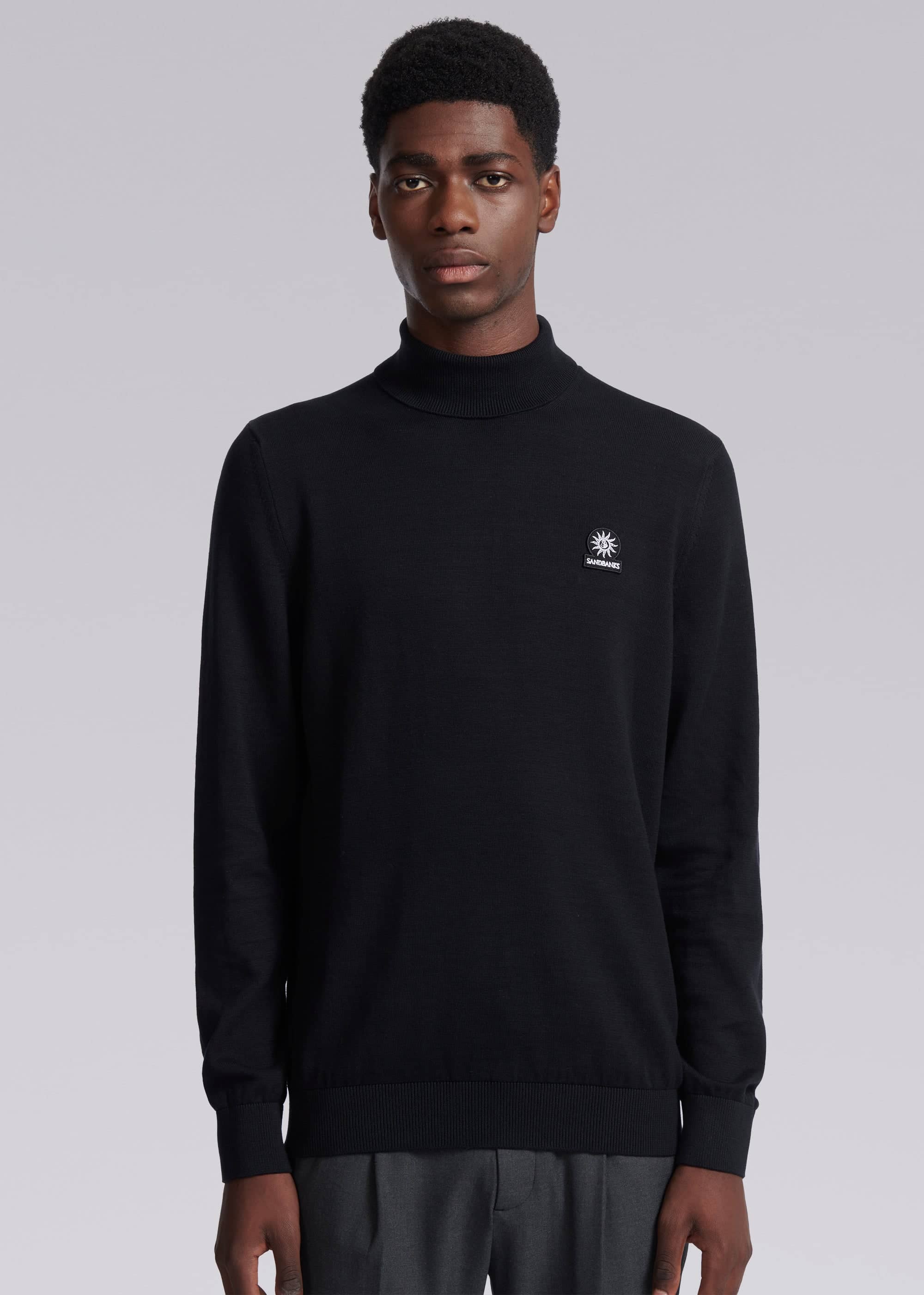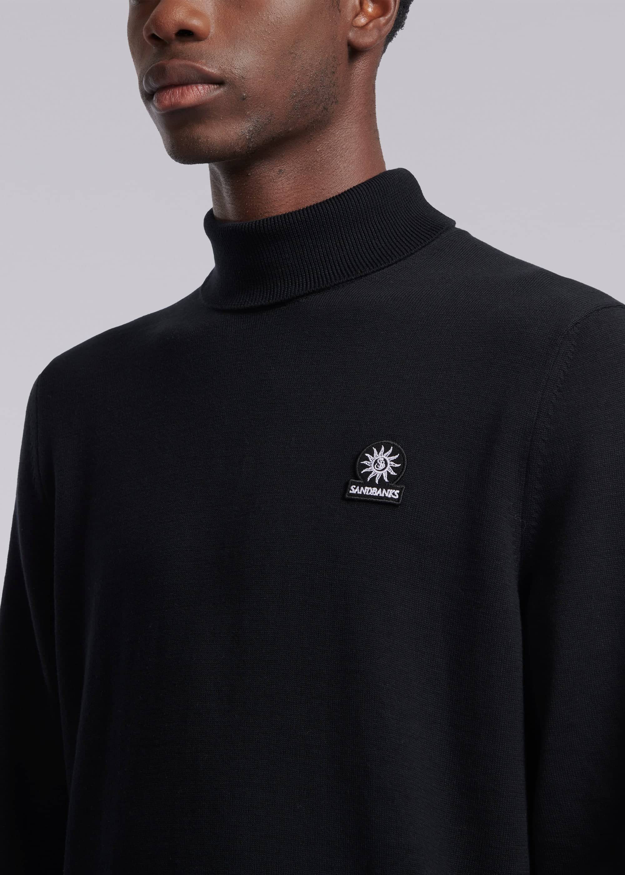 Sandbanks men's fine gauge knitted roll neck in black, made from 100% organic cotton for a soft and luxurious feel. This sweatshirt features a Sandbanks logo badge embroidery on the chest, roll neck and tri-colour neck binding.