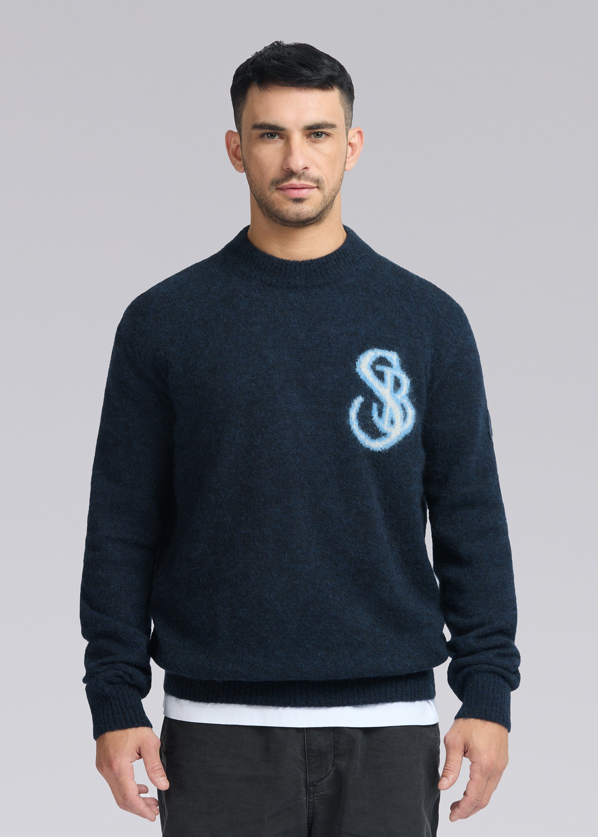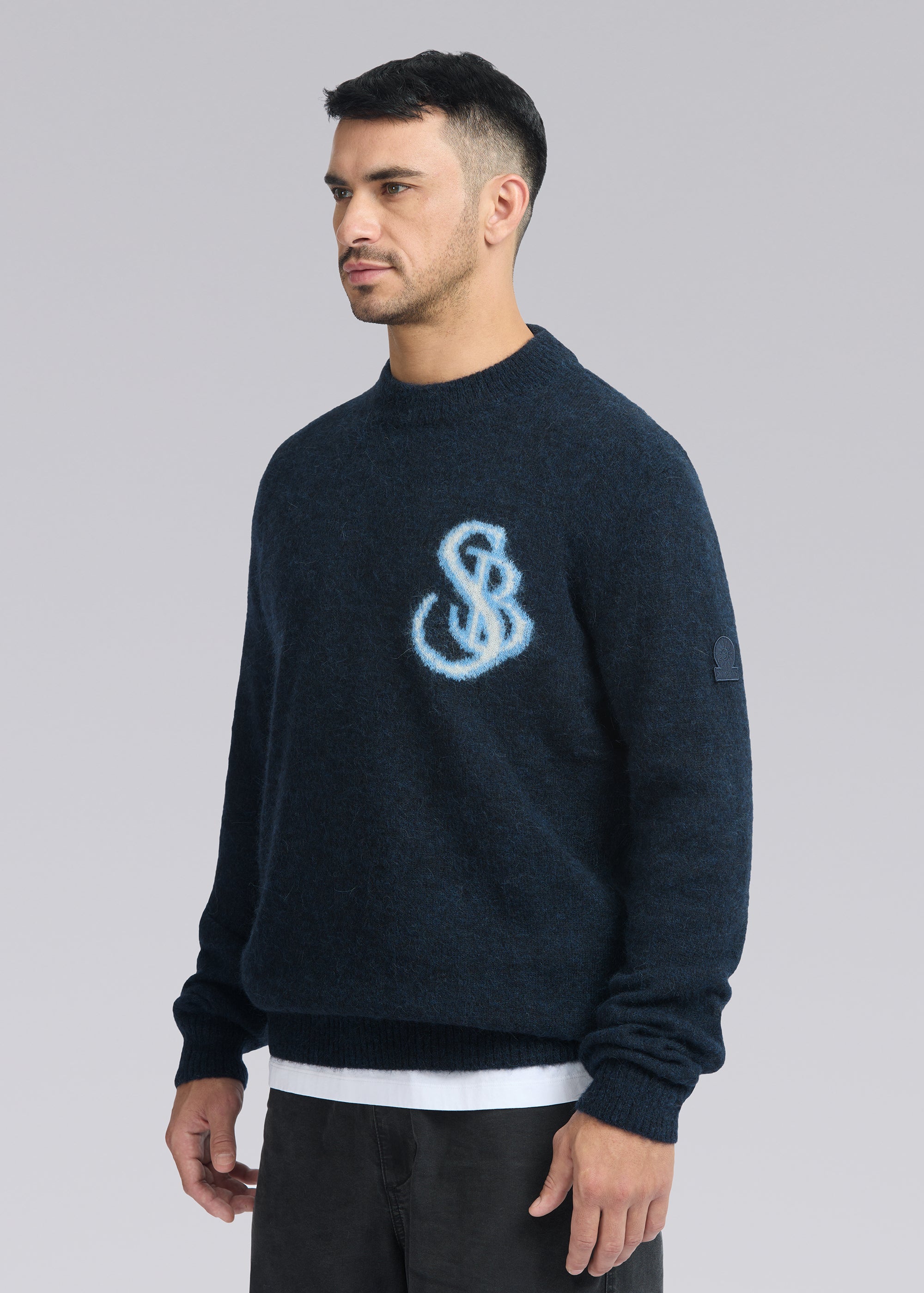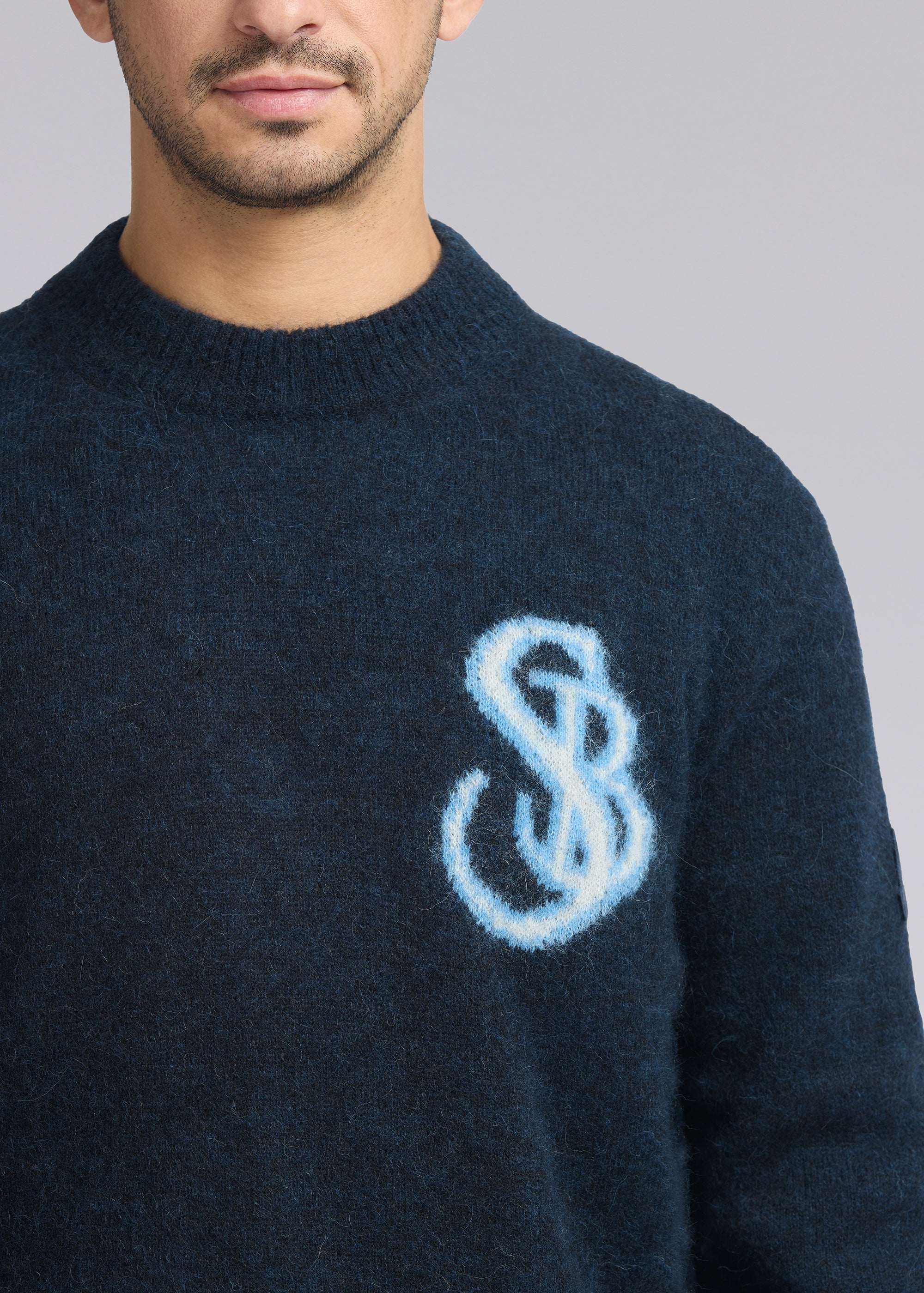 Sandbanks SB Intarsia knitted jumper in navy, made from an Alpaca and Merino wool blend with a brushed finish in a relaxed fit for a cosy wintery feel. This luxury jumper features an intarsia knitted SB logo design, tonal embroidered sleeve badge logo, double layered neck and elasticated ribbed hem and cuffs.