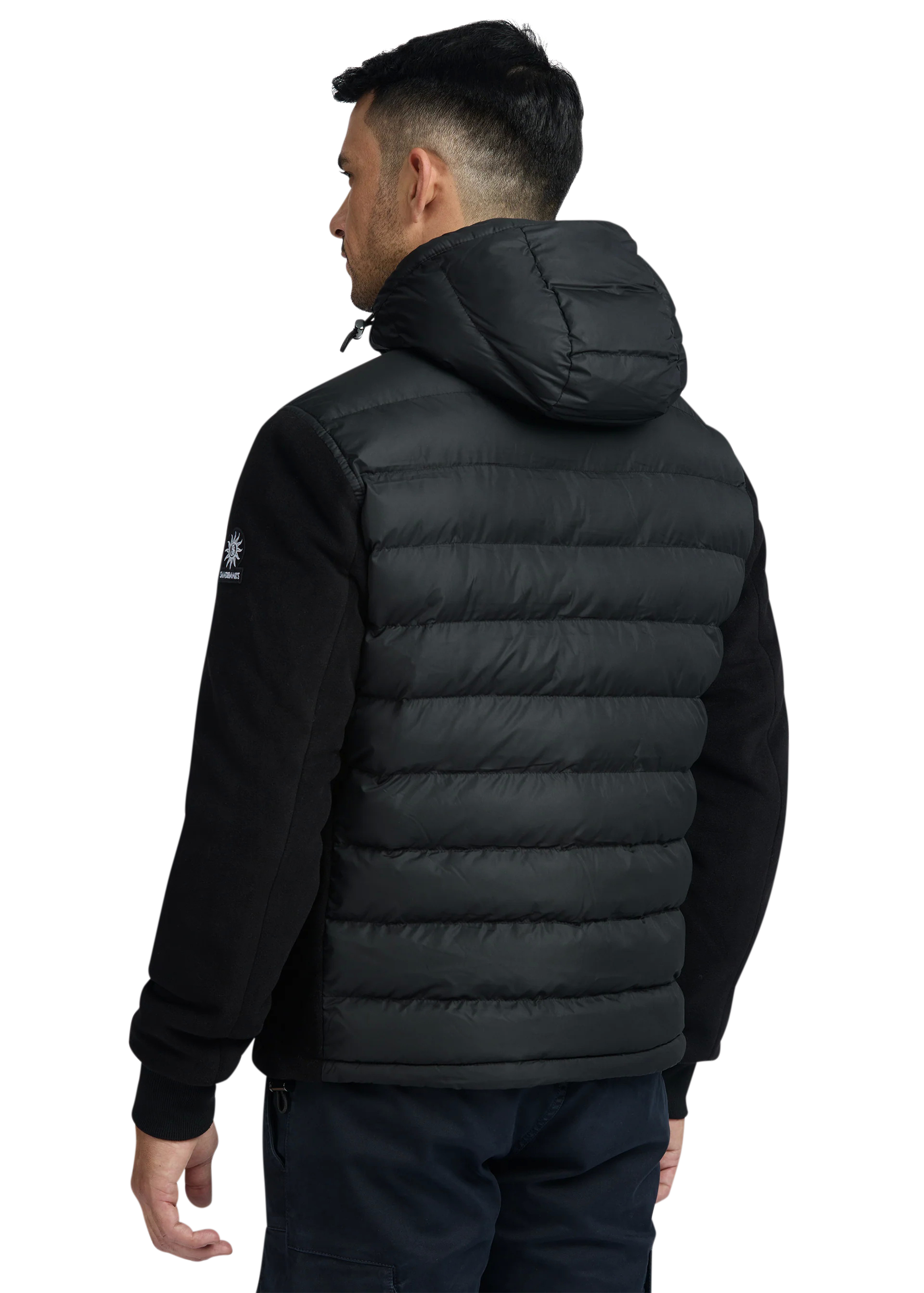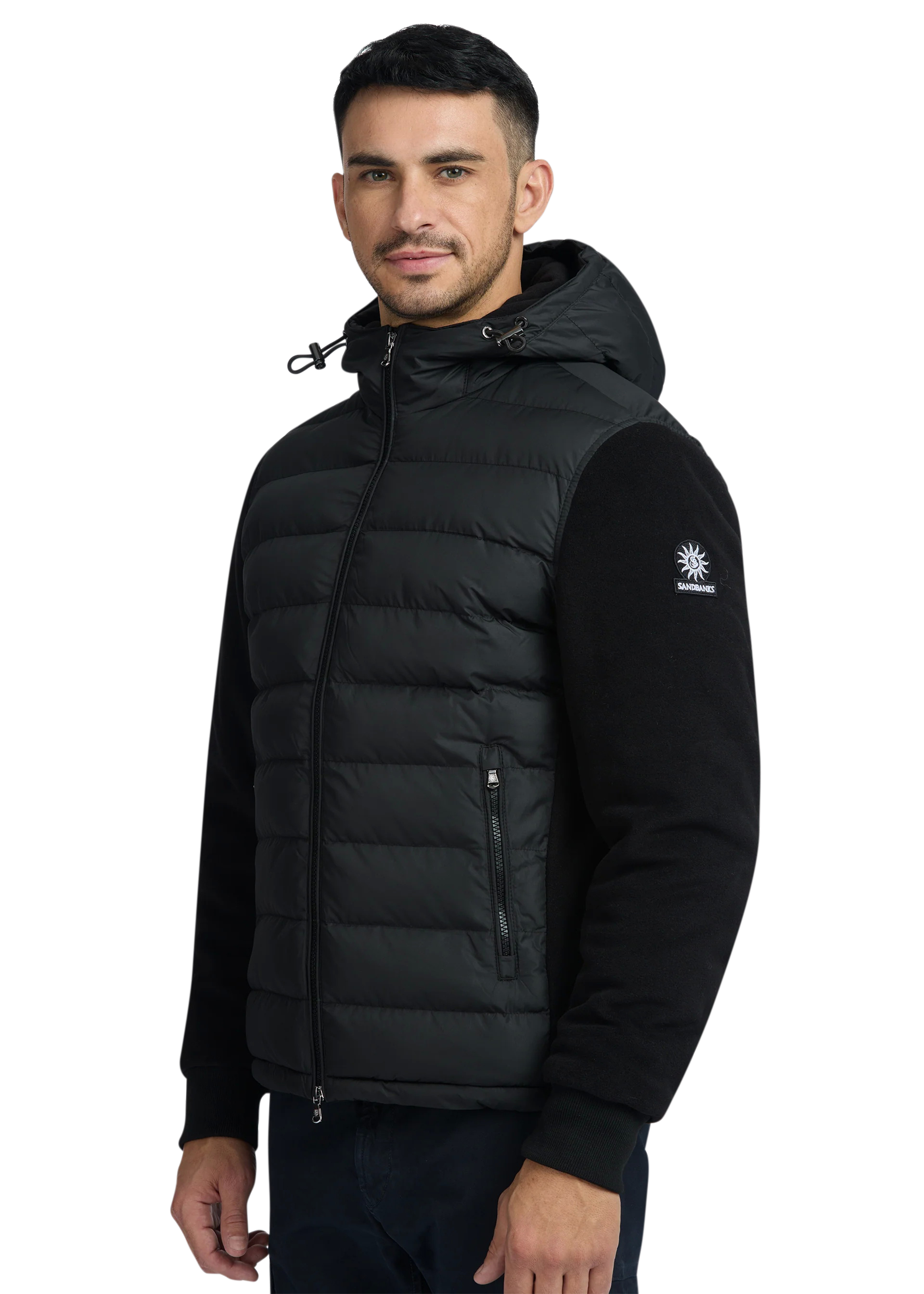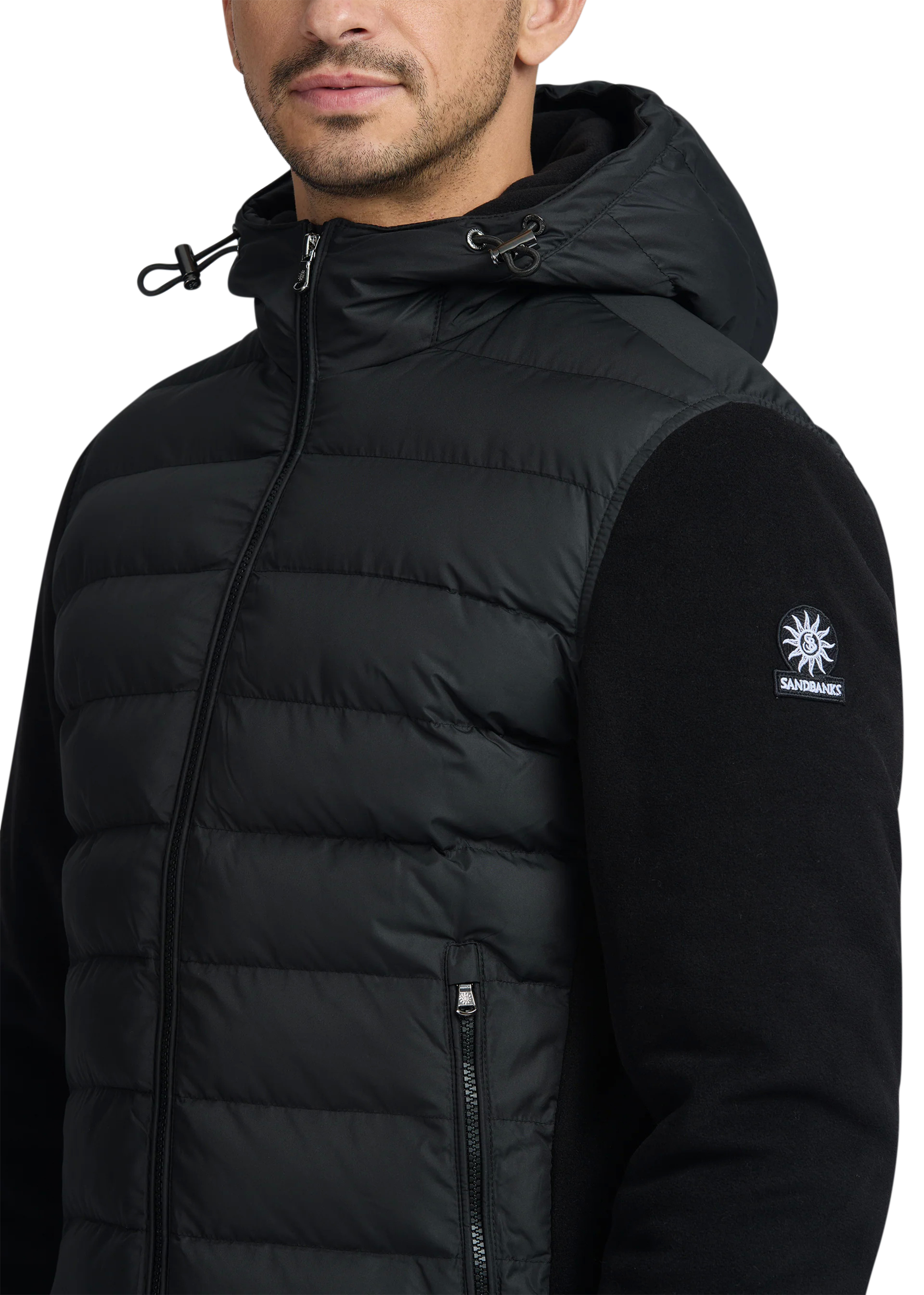Sandbanks Outlander polar fleece hooded hybrid jacket in black, a warm and lightweight everyday casual jacket. This style features a warm eco-down puffer filled front and rear, polar fleece sleeves, hood internal and pockets for comfort and warmth, YKK 2-Way Vislon front zip and side zip pockets, embroidered logo badge and finished with gun metal branded cord adjusters and eyelets.