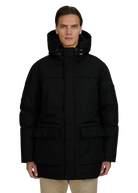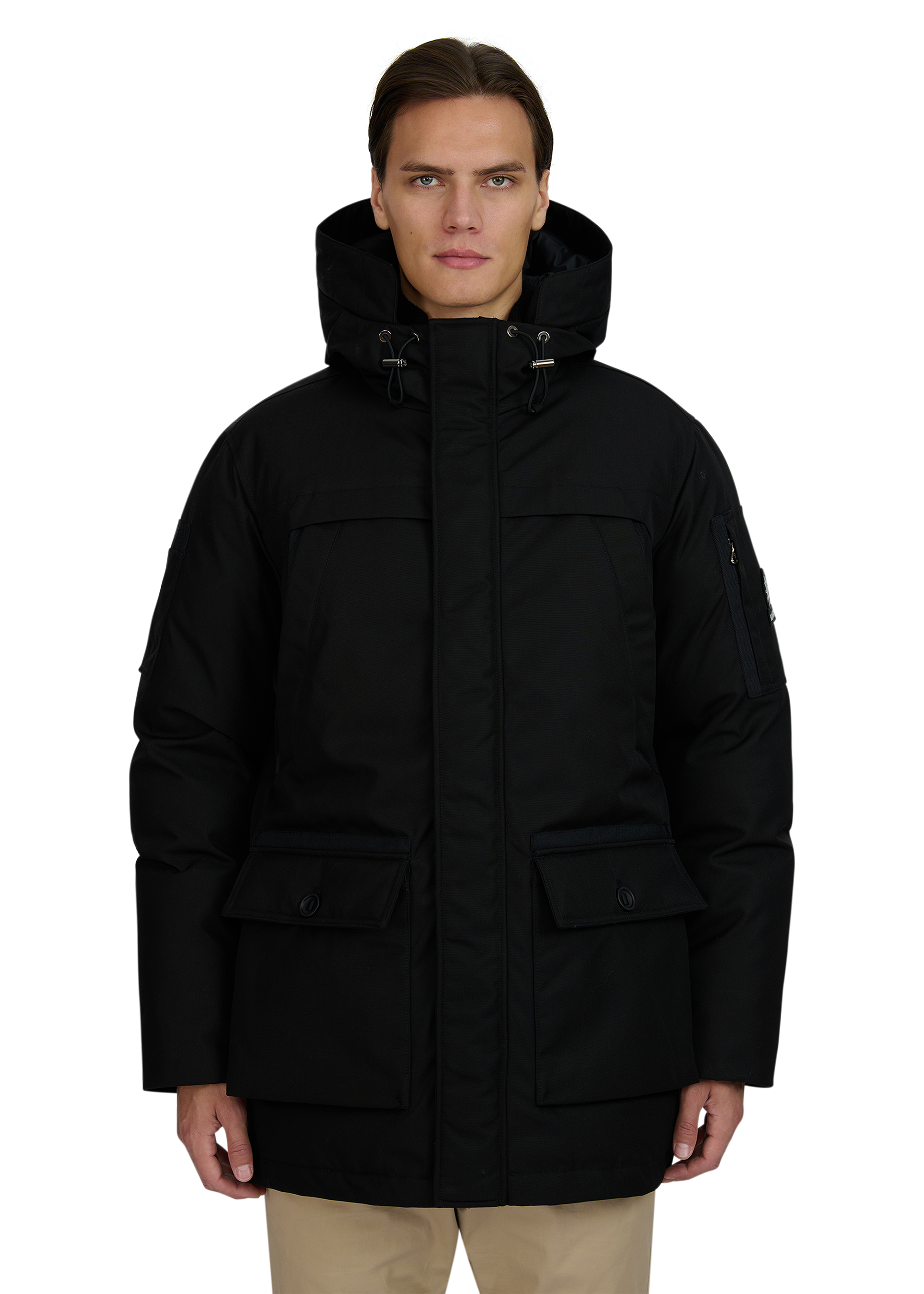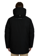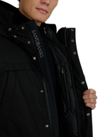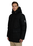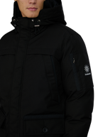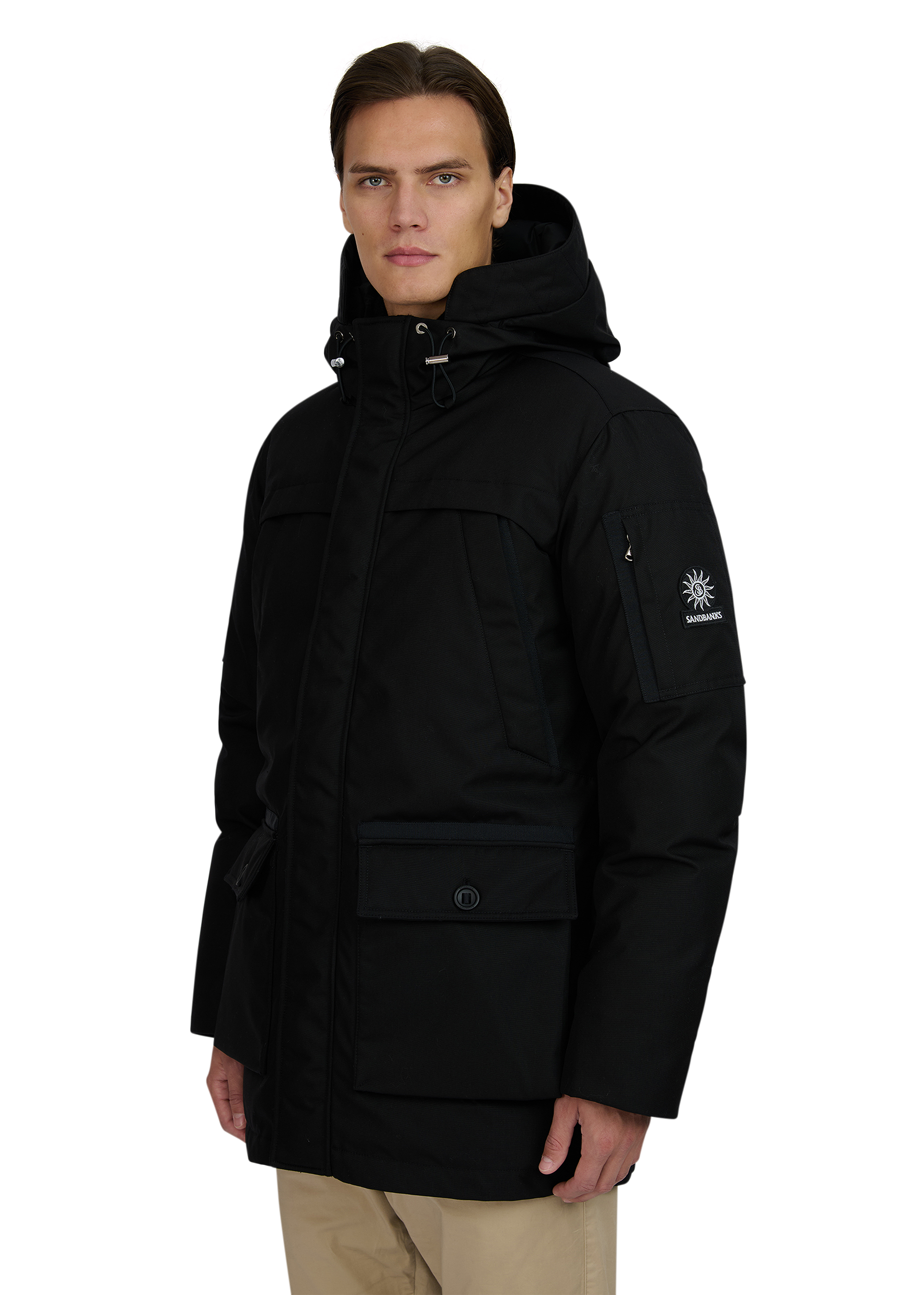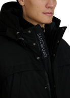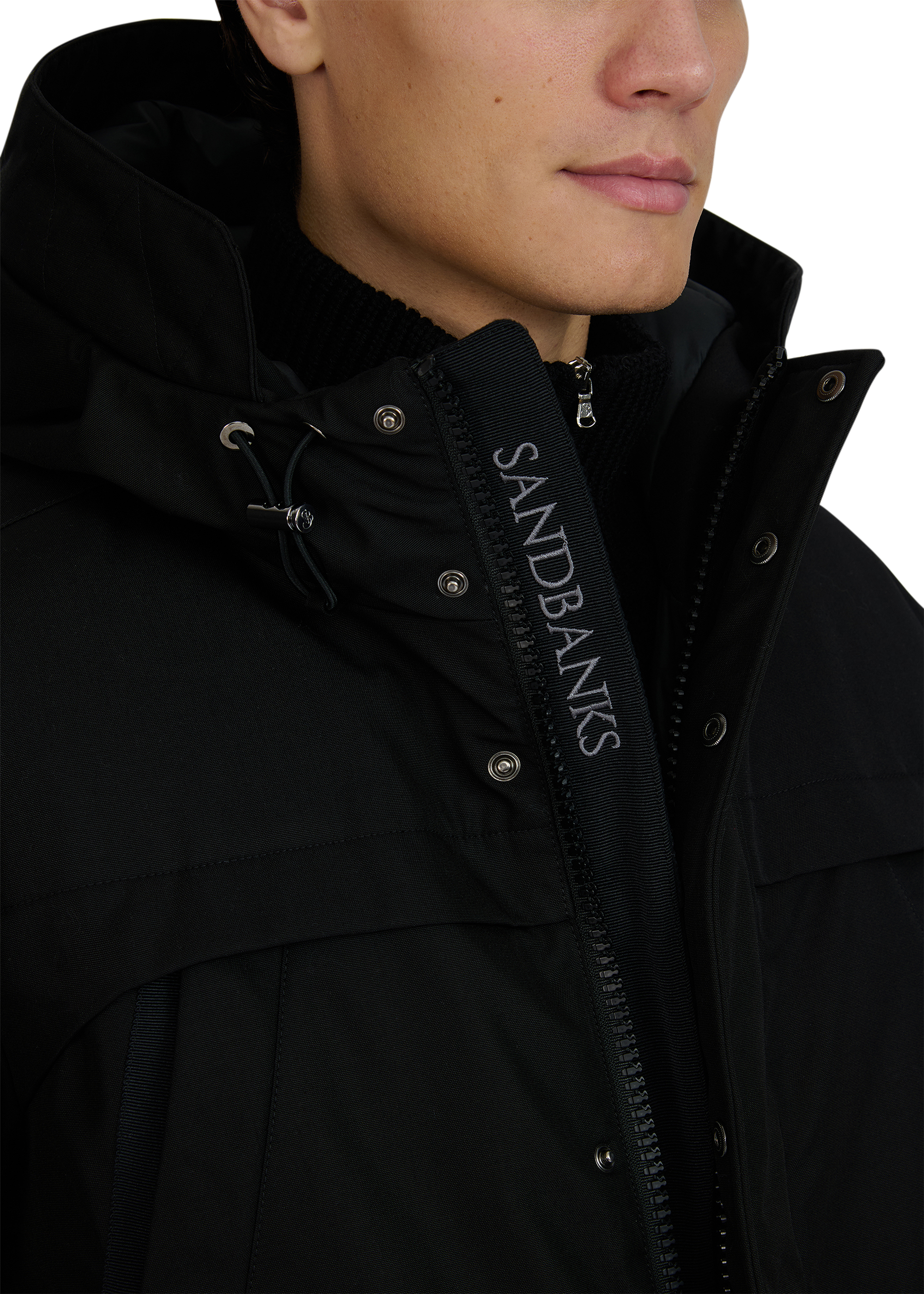 The Sandbanks Dura Parka Jacket in black is crafted from a technical Cordura shell fabric known for high-strength, durability, and being abrasion-resistant. This high-tenacity nylon fabric was chosen for its ruggedness, water resistance, and tear strength. This parka features premium hardware and precision details including; a sleeve zip pocket with an embroidered Sandbanks badge, a branded rear grab handle, fleece-lined mouth guard, utility styled front lower pockets and fleece lined upper zip pockets for warmth. A baffled hood with stitched logo and adjustable buckle provides adaptable coverage, while premium Lampo zips, gunmetal eyelets, and laser-engraved hardware elevate the finish. Complete with a protective storm flap, inner rib cuffs, and sustainable RPET ribbon trims, this structured silhouette embodies Sandbanks’ signature balance of performance and luxury.