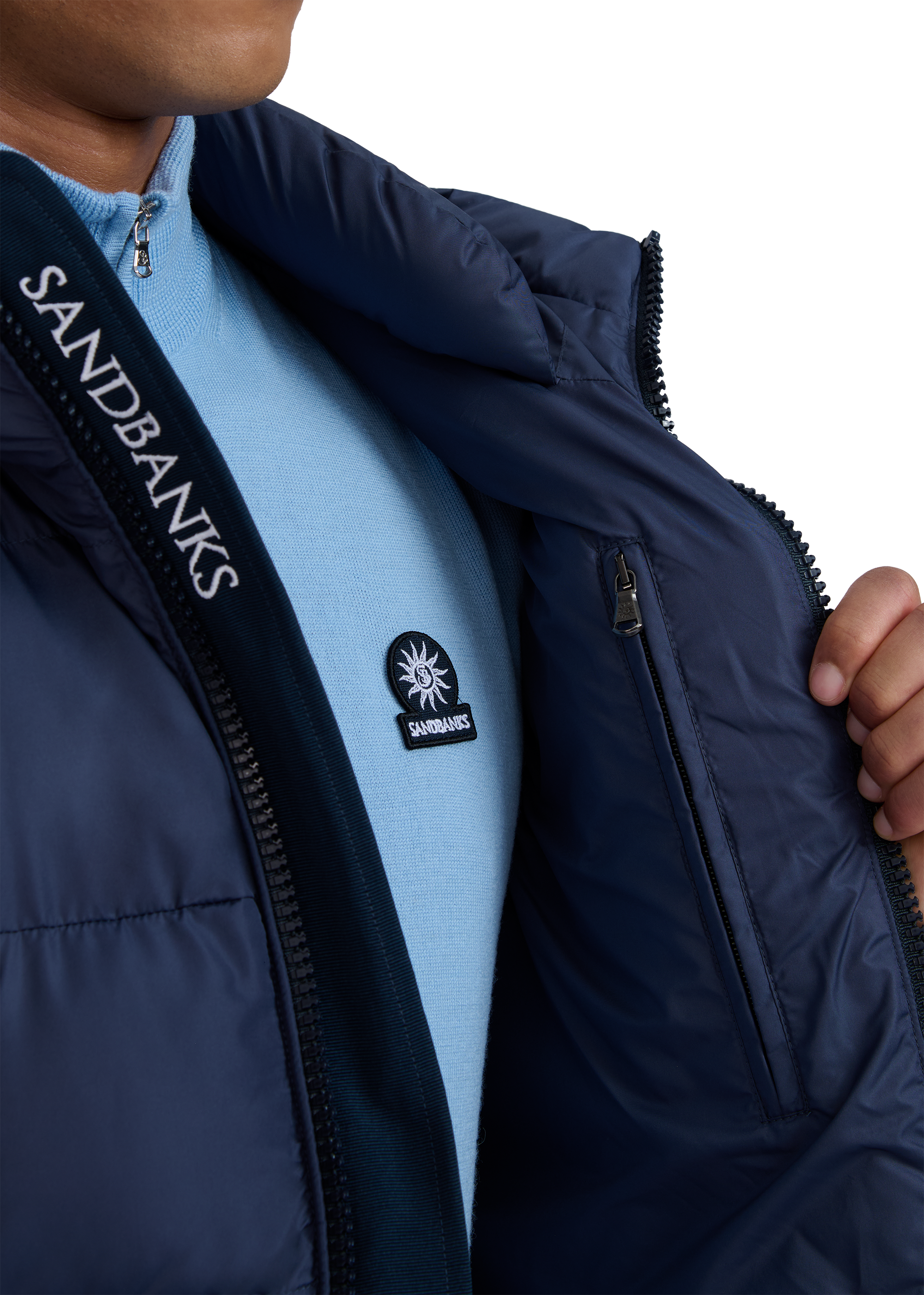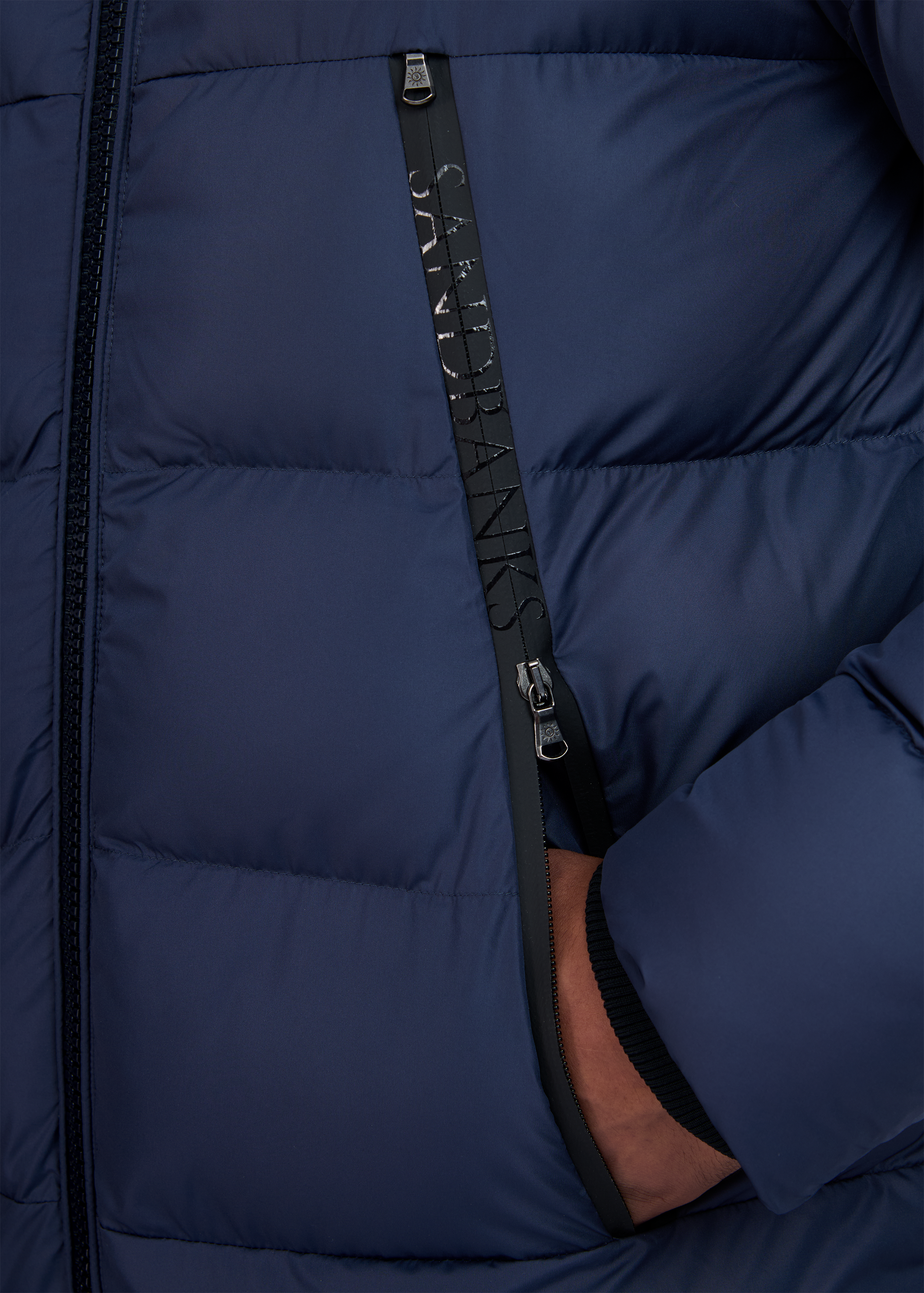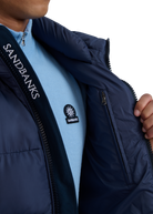 Sandbanks Ravine mid puffer is made almost entirely from recycled plastic bottles. With a navy shell fabric, this jacket has high thermal retention and features; Lampo silicone zips with Sandbanks print and embroidered badges.