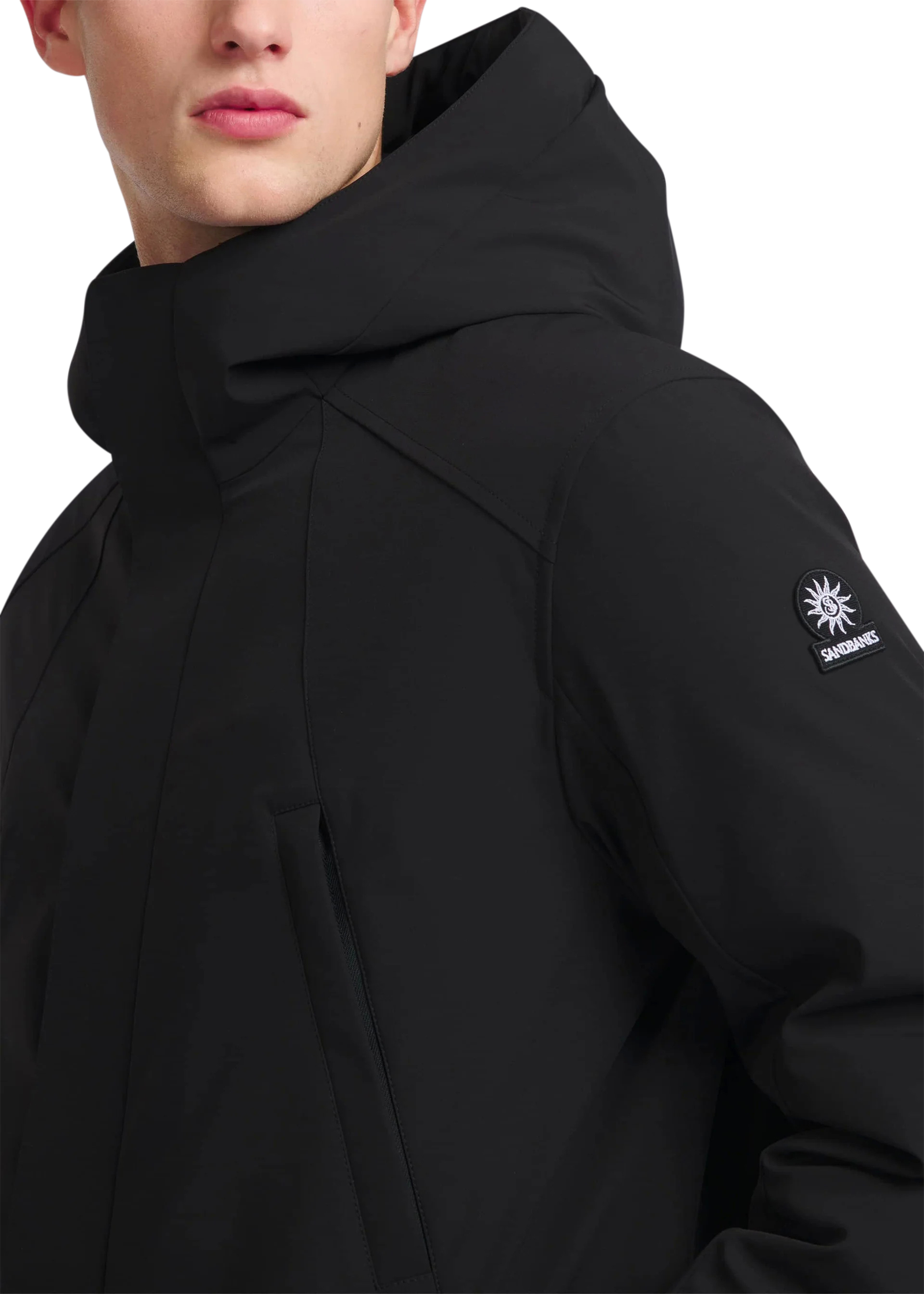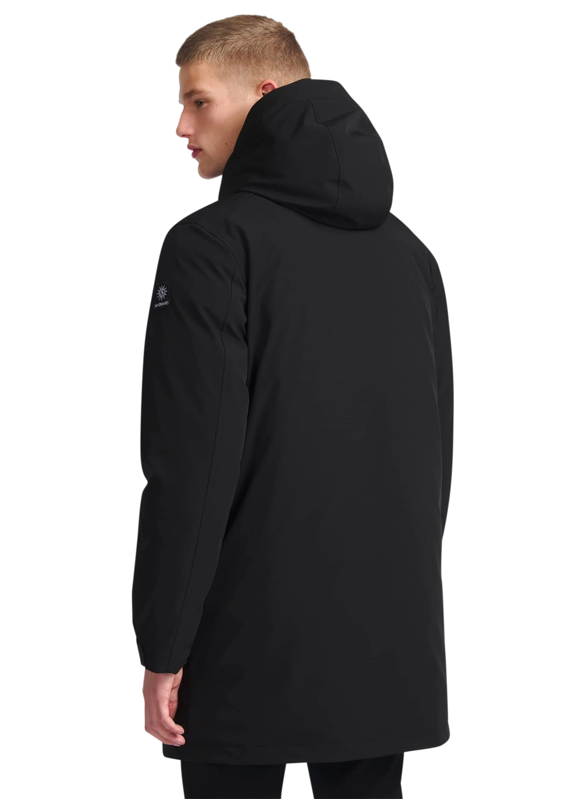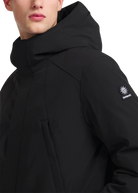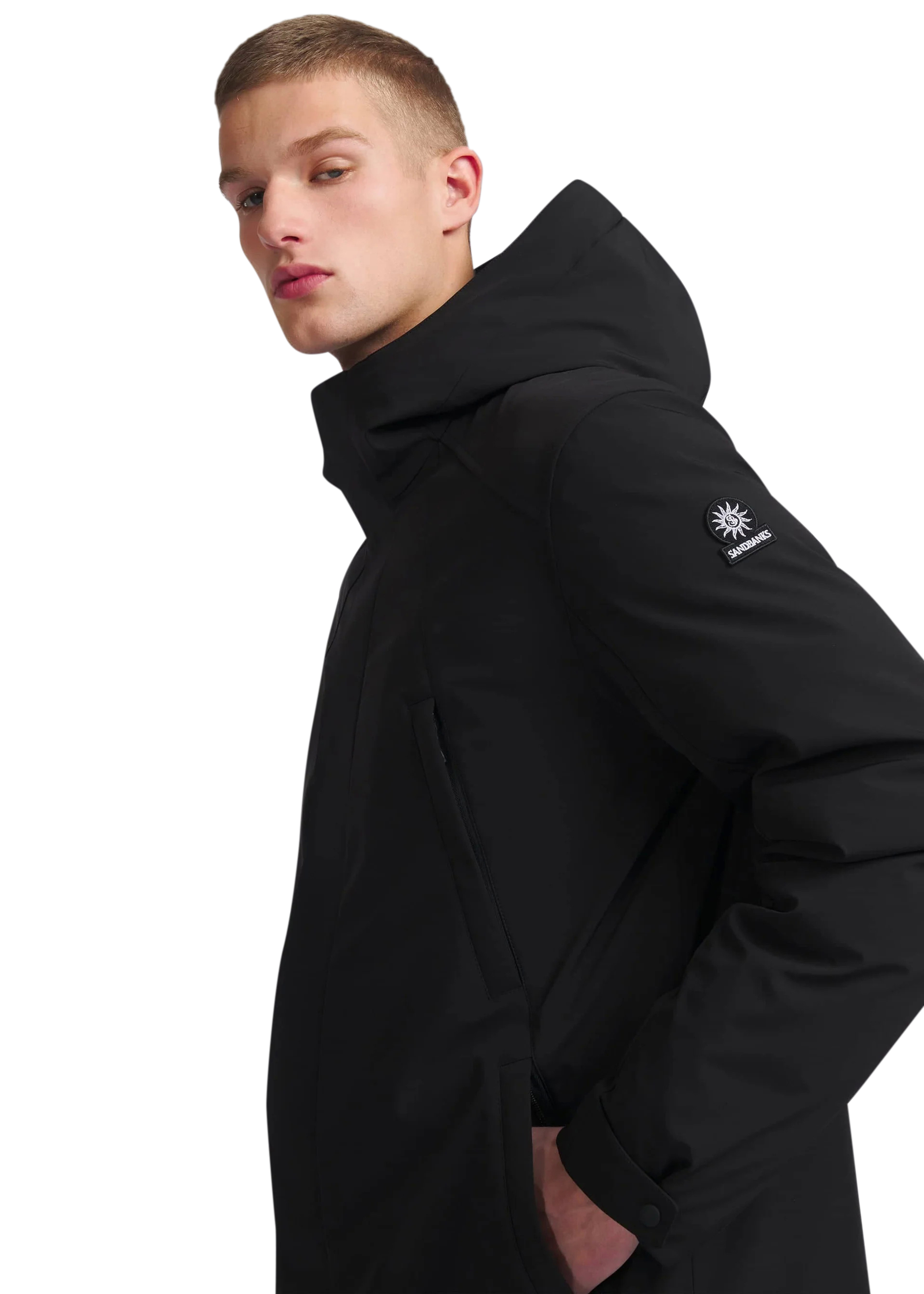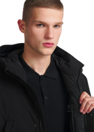 The Sandbanks Salterns jacket, a clean and contemporary looking jacket that features a black outer shell with eco-down puffer internal. This jacket has high thermal retention and featuring an adjustable hood, embroidered logo badges, engraved black rubberised components and zip pocket details.