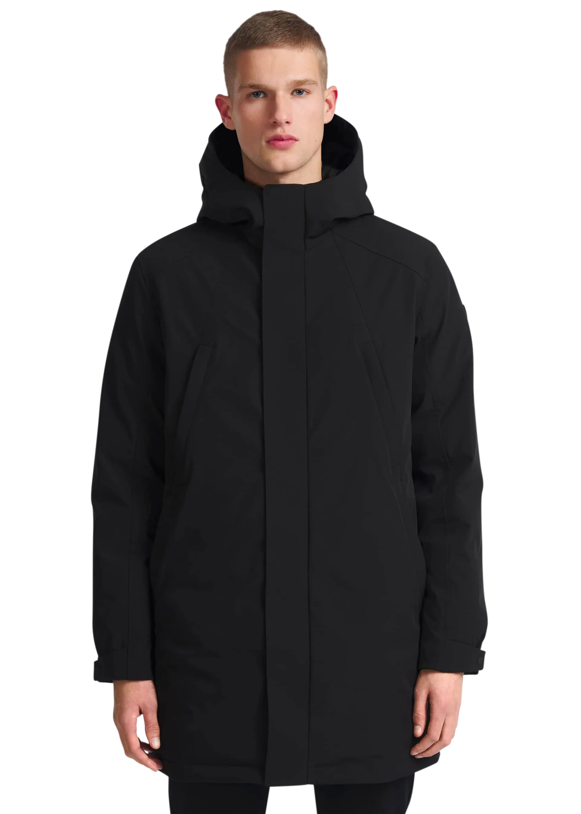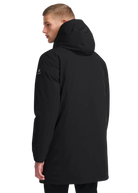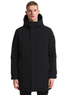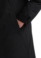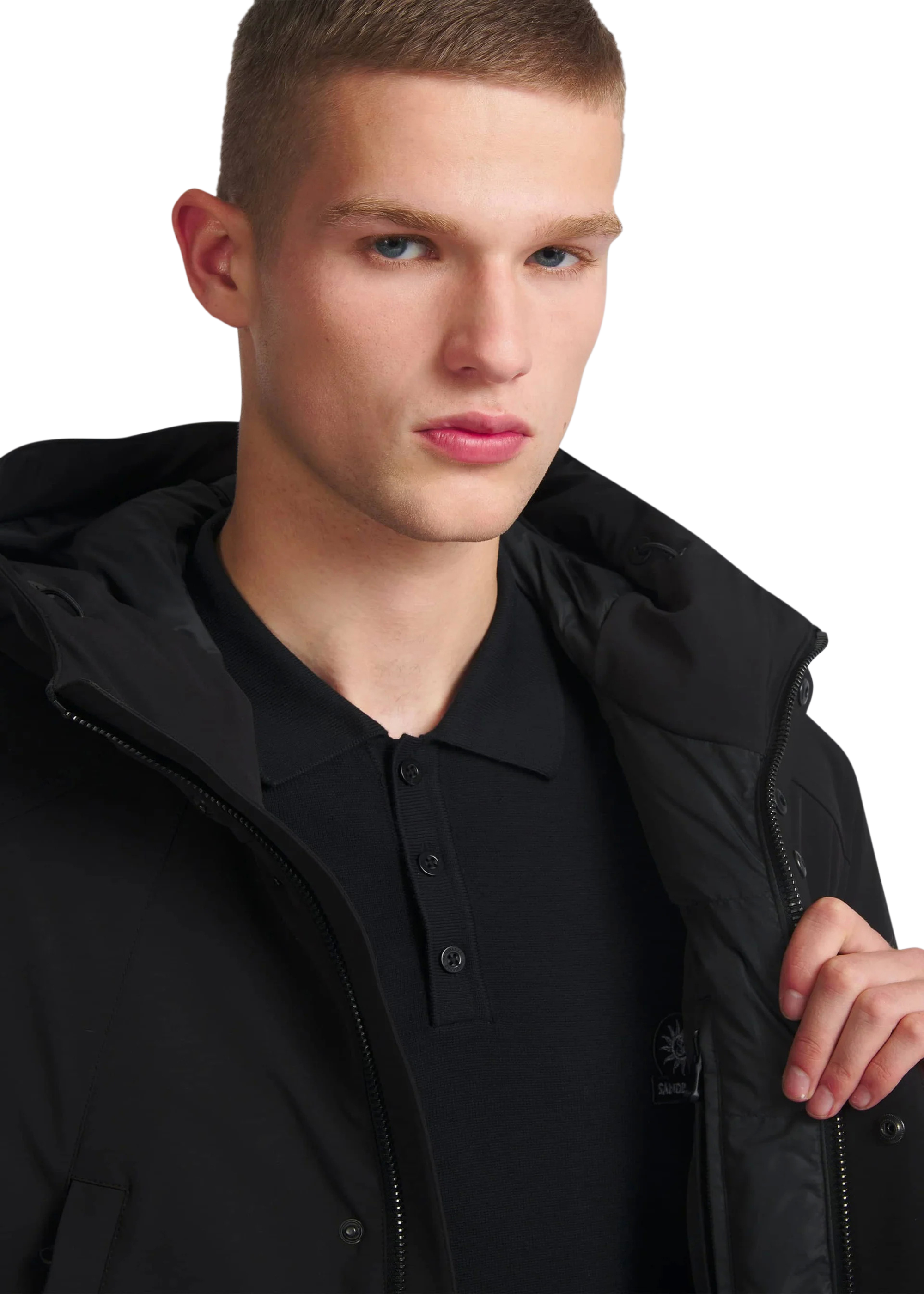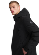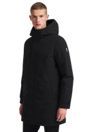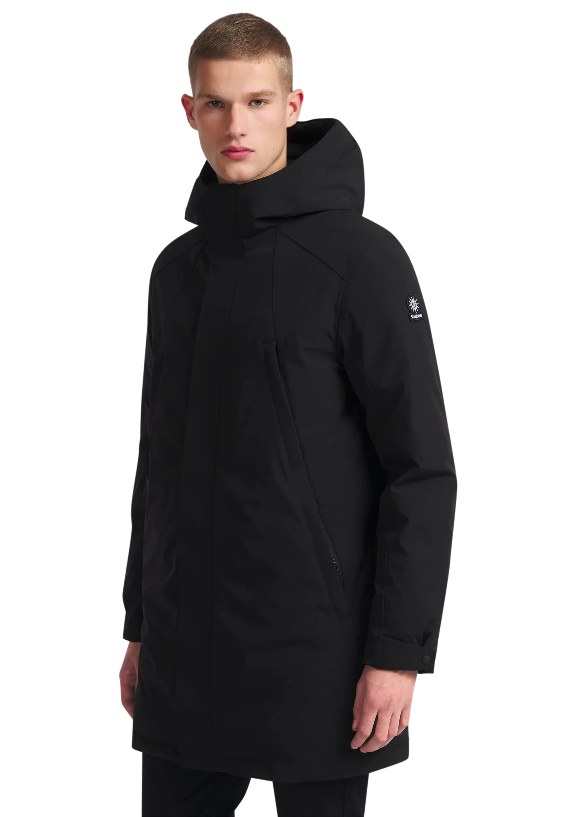 The Sandbanks Salterns jacket, a clean and contemporary looking jacket that features a black outer shell with eco-down puffer internal. This jacket has high thermal retention and featuring an adjustable hood, embroidered logo badges, engraved black rubberised components and zip pocket details.