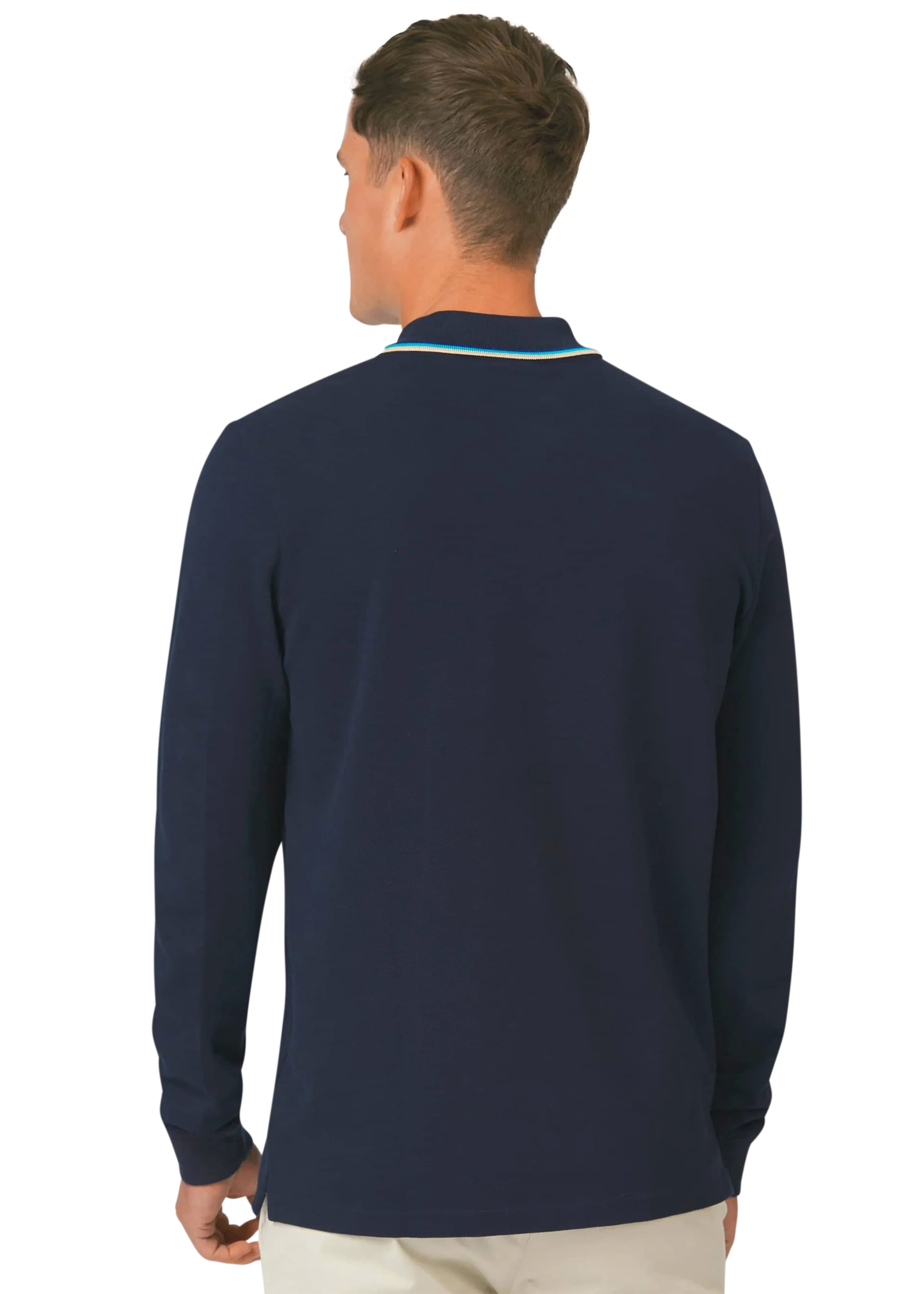 - Tri-colour tipped collar, cuff and back neck binding