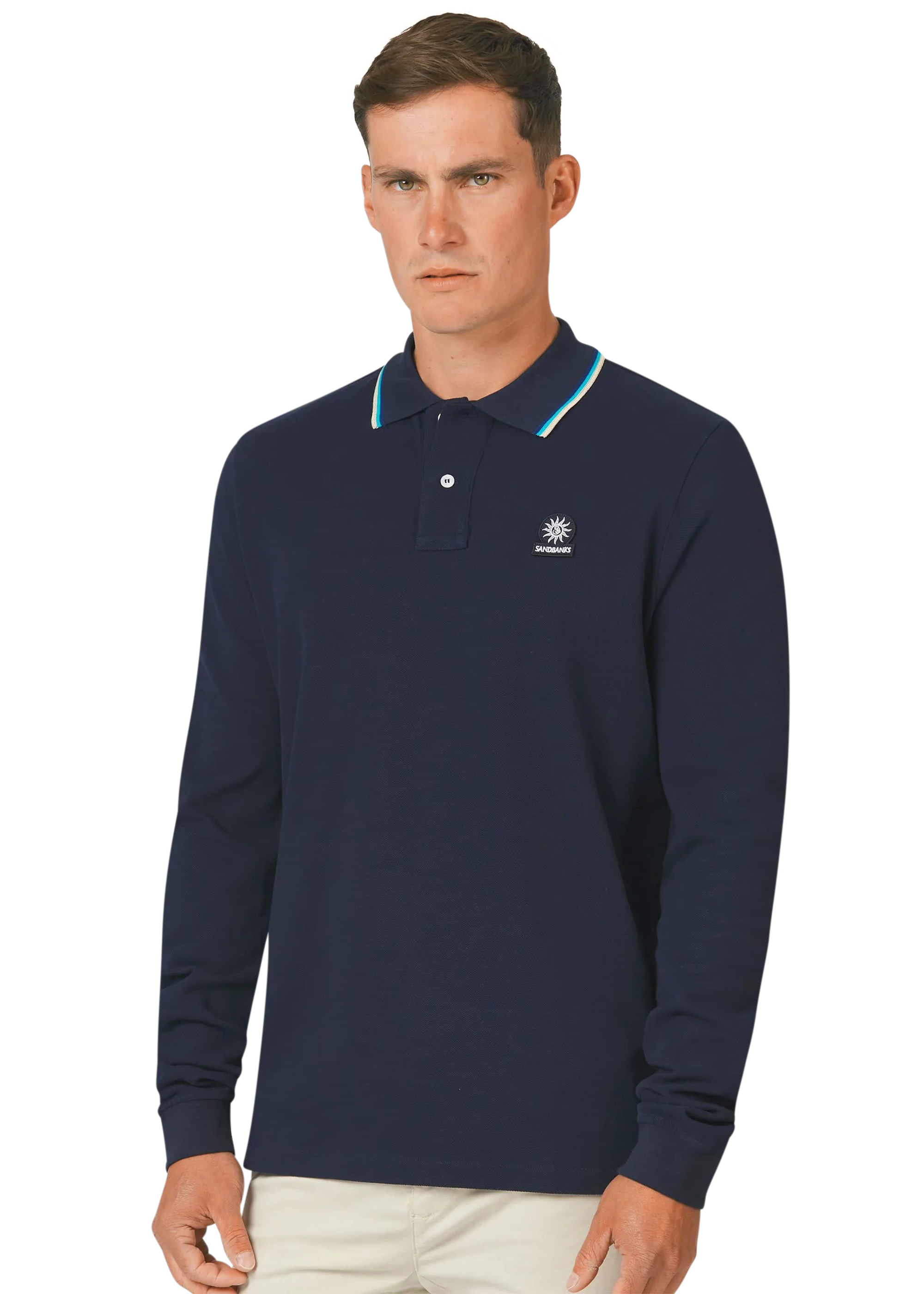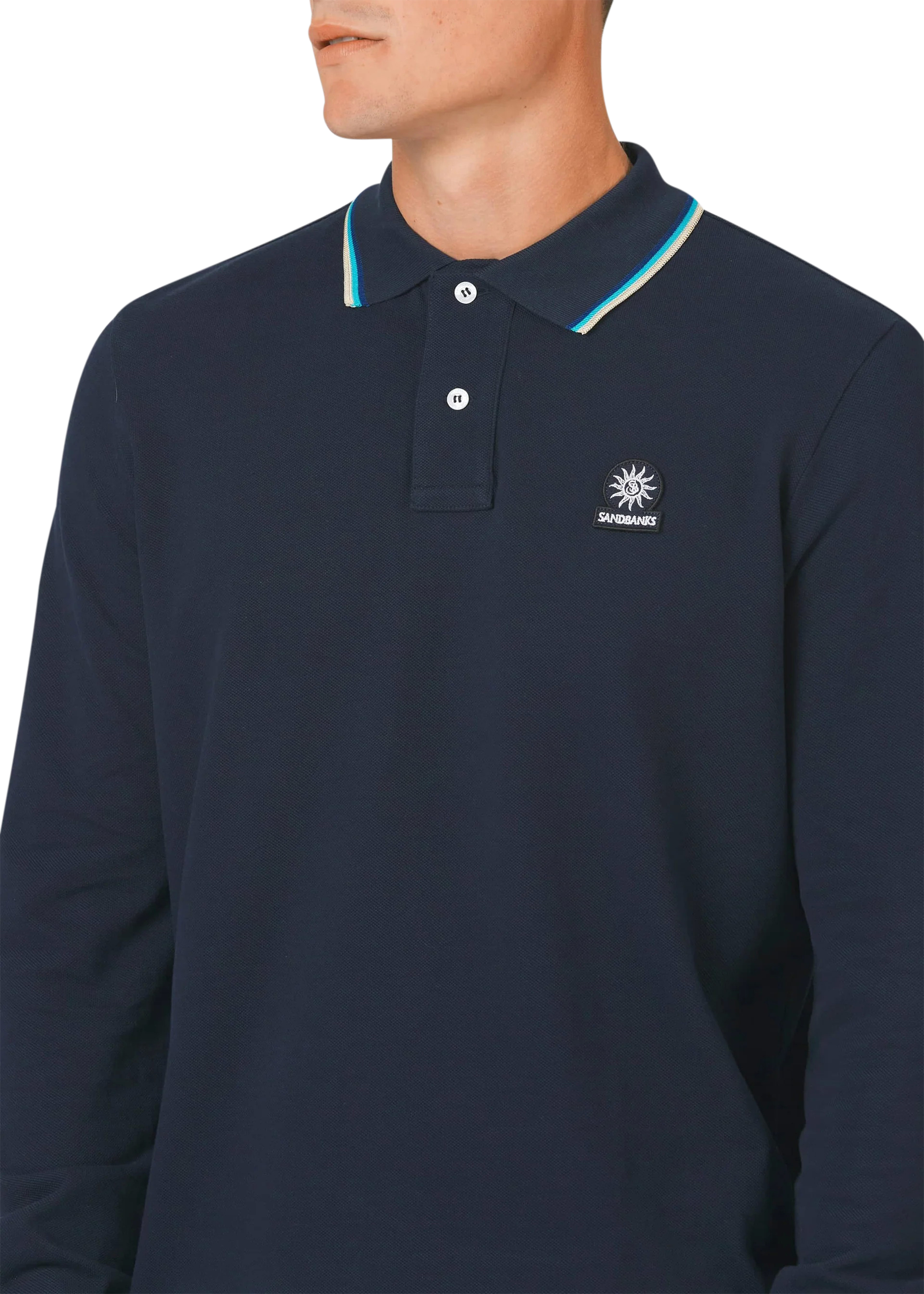Sandbanks men's badge logo long sleeve polo shirt in navy, made from 100% organic cotton. This classic fitting 2 button polo shirt features an embroidered badge logo on the chest, tri-colour tipped ribbed collar, cuff and back neck binding.