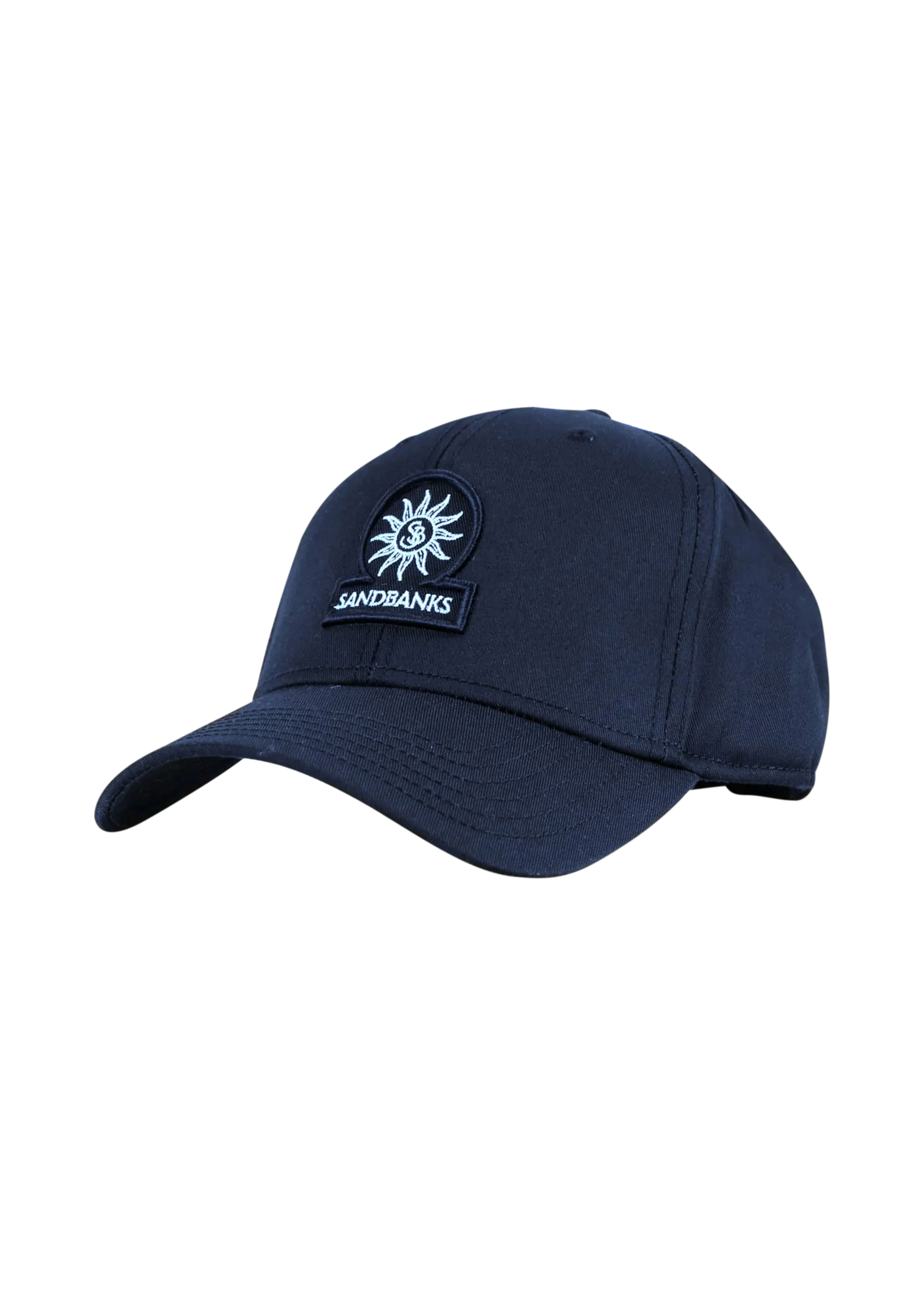 Sandbanks Badge Logo strap-back cap in navy made from 100% recycled polyester and features navy badge with white embroidery, knitted tri-colour rear strap and laser engraved SB logo fastener in gun metal.
