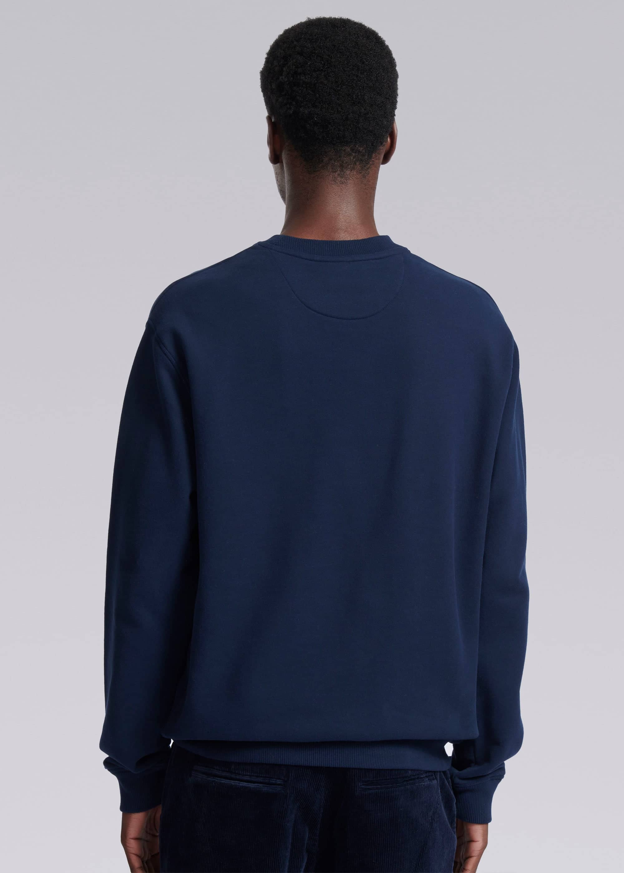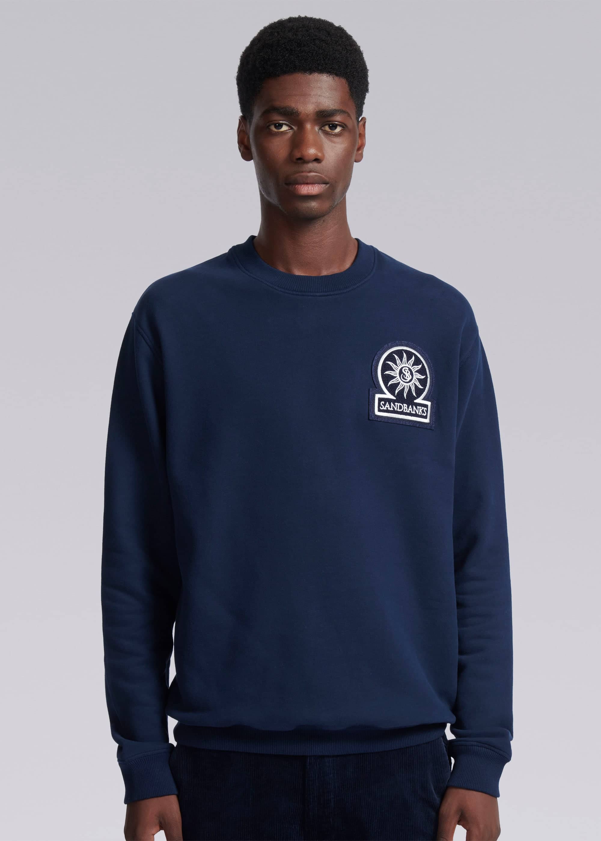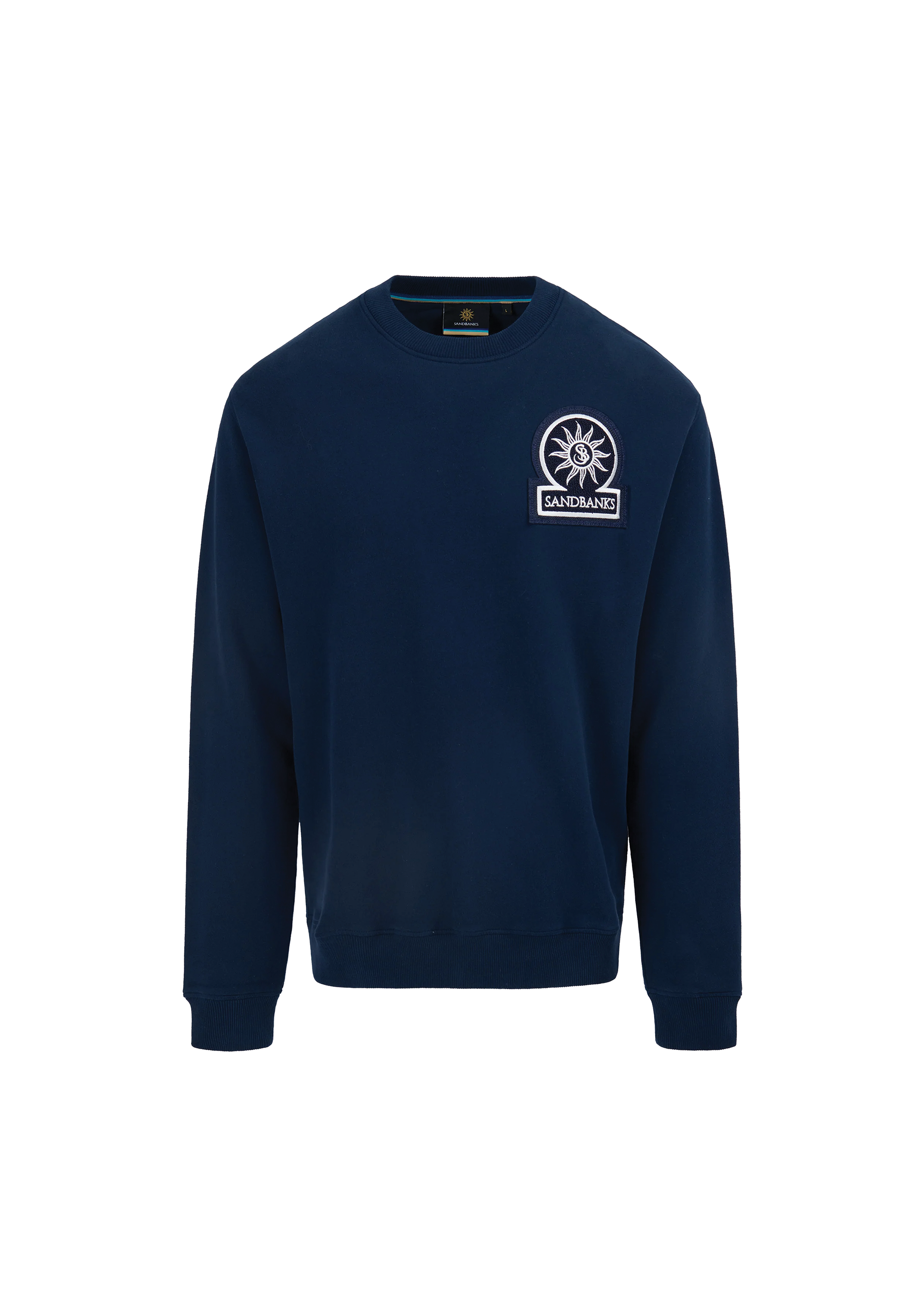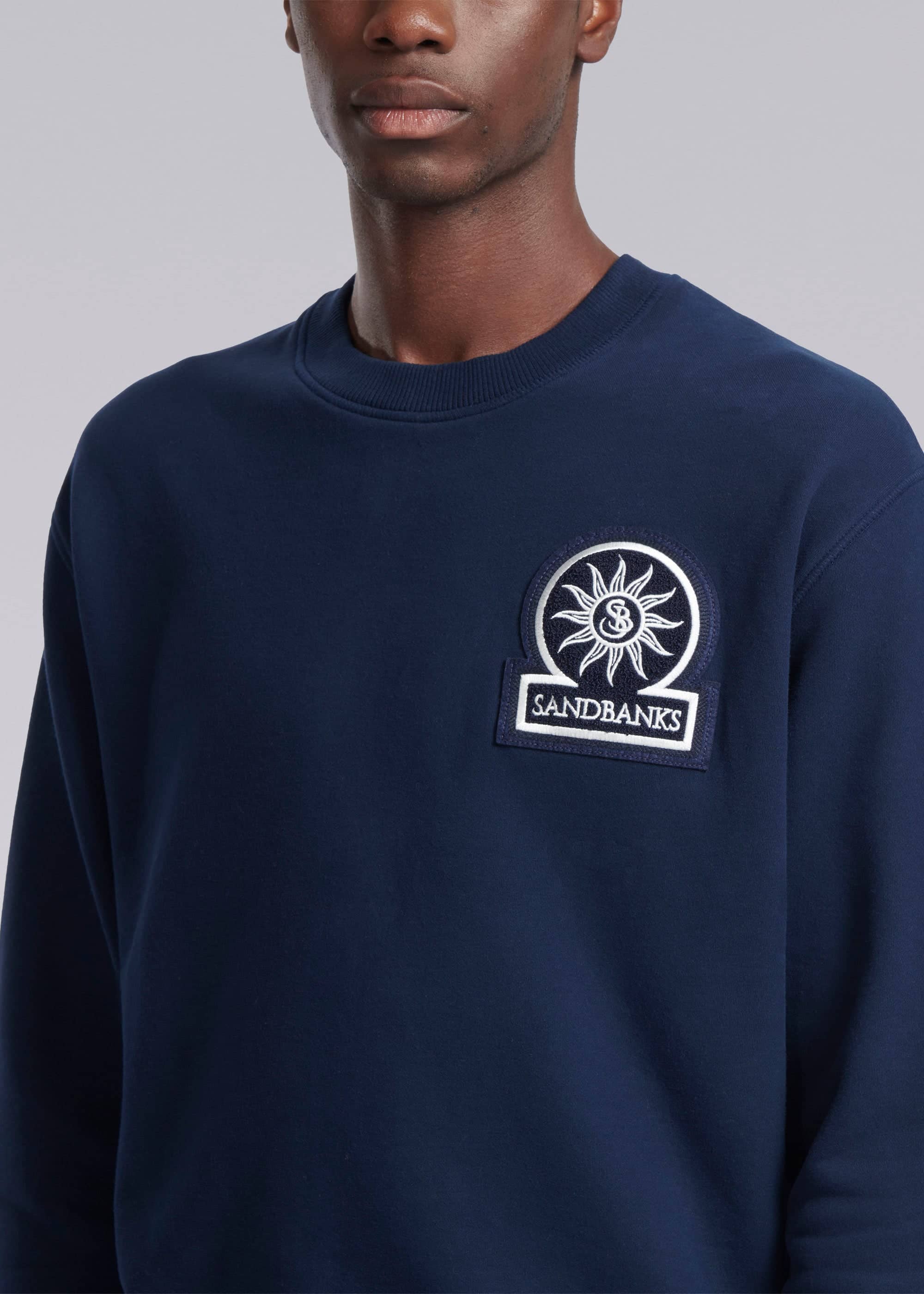 Sandbanks men's boucle badge sweatshirt in navy, made from 100% organic cotton diagonal weave knit that is brushed internally for a soft and warm feel. This sweatshirt features a Sandbanks large boucle badge logo on chest (chenille), tri-colour neck binding, ribbed cuff and hem.