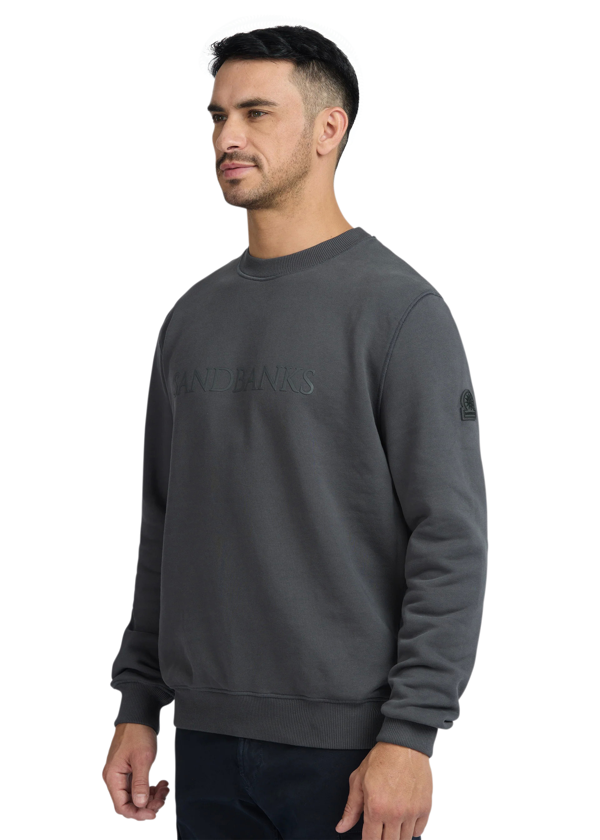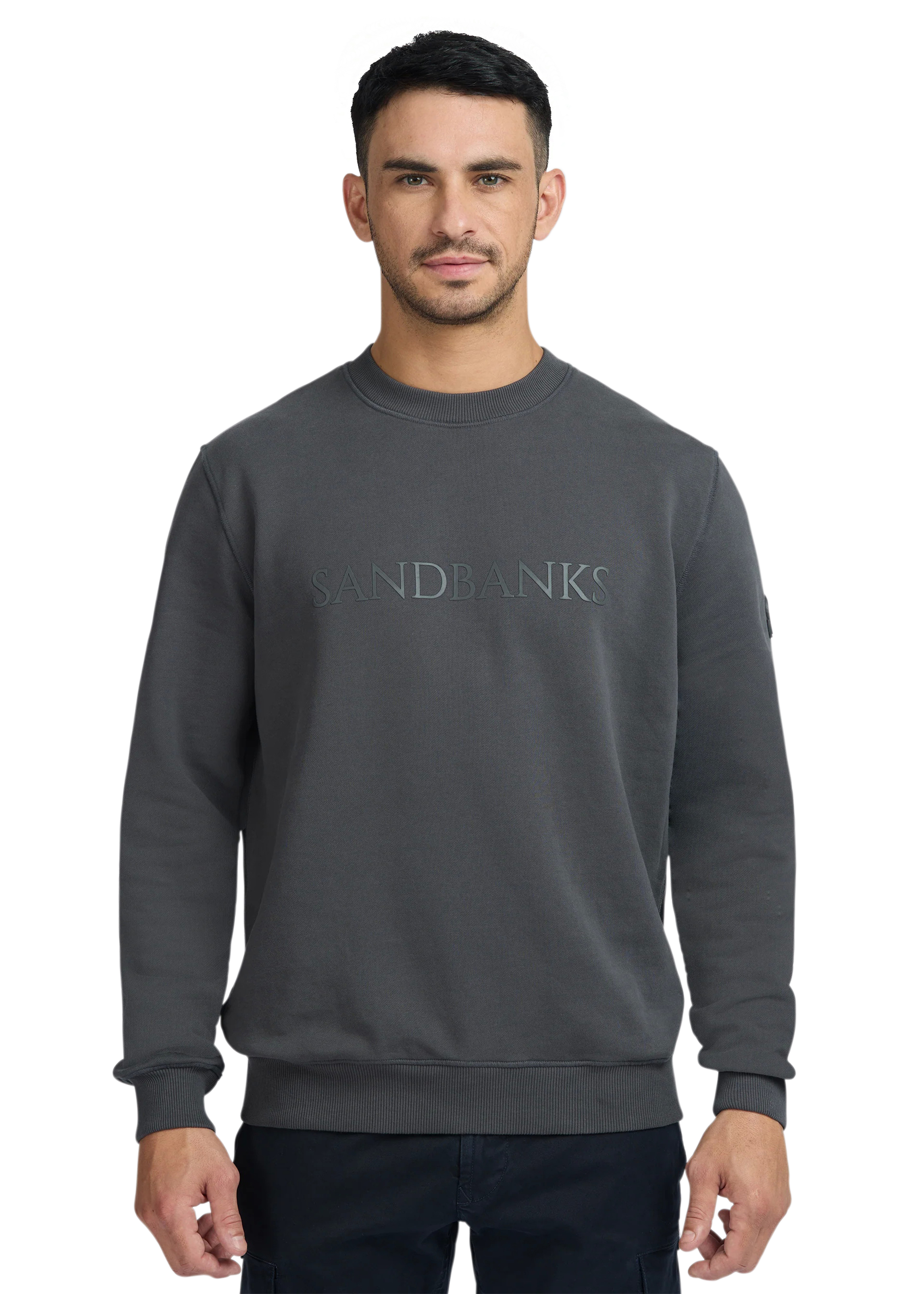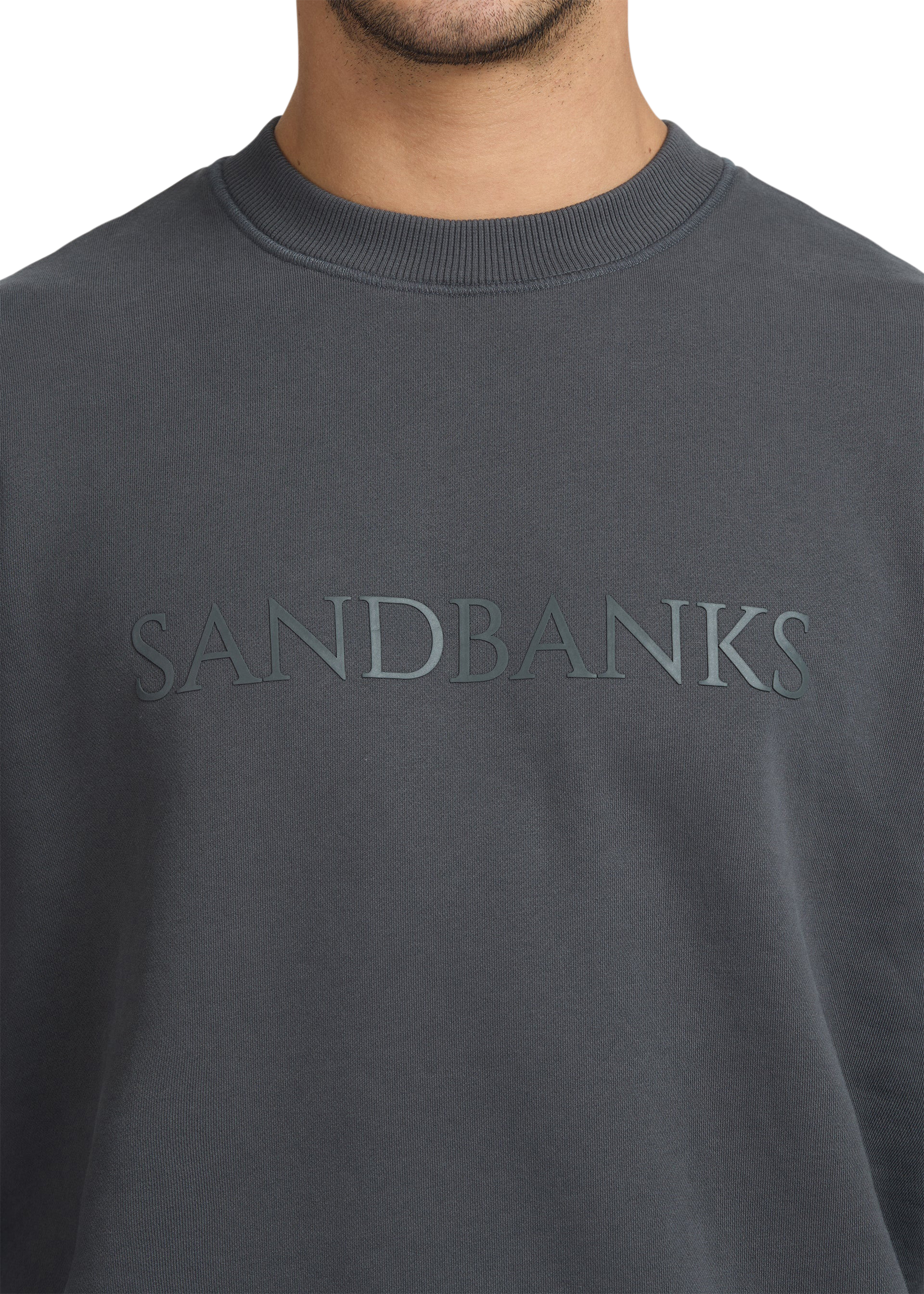 Our Sandbanks Raised Rubber Logo sweatshirt in anthracite is constructed with a 400gsm diagonal knitted fabric that features a slight brushed back for a superior soft feeling and warmth, whilst remaining breathable. Made from 100% BCI Cotton with tonal sleeve rubber badge logo and raised rubber Sandbanks chest print.