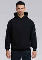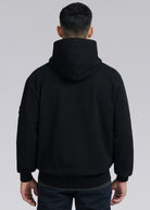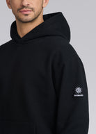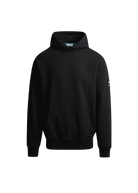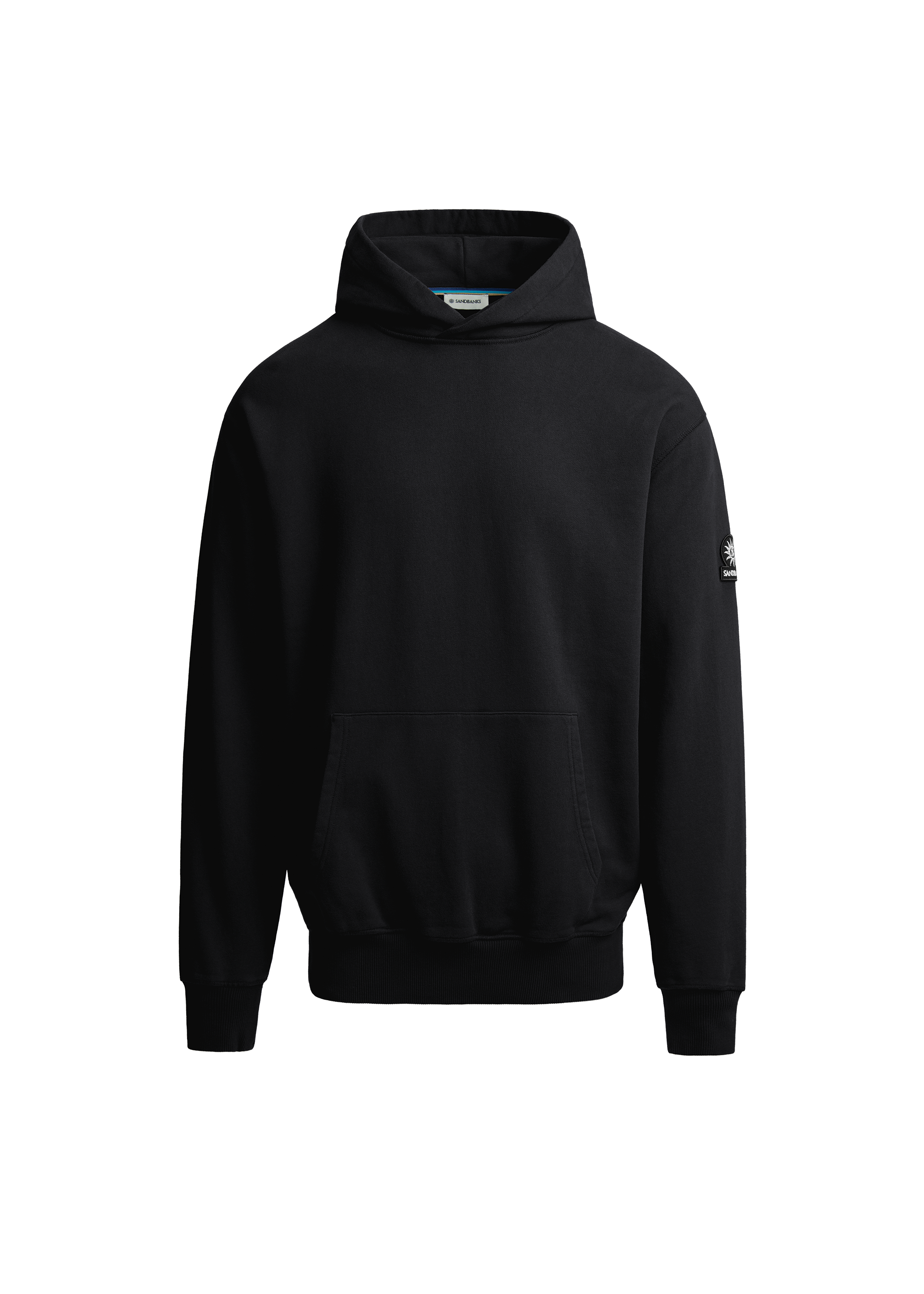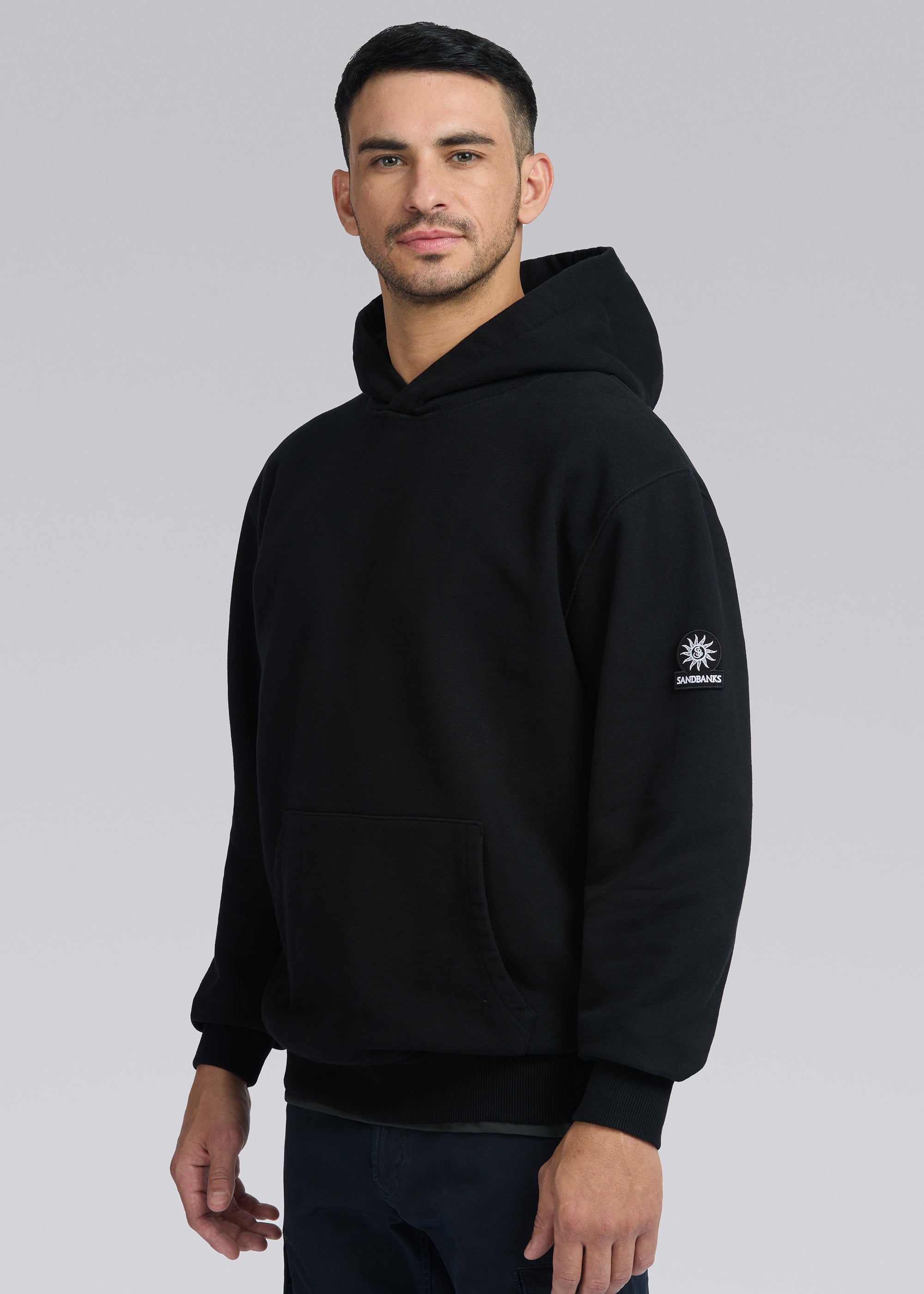 Our new and improved men's Sandbanks badge logo hoodie in black. This garment has been upgraded with a 400gsm diagonal knitted fabric that features a slight brushed back for a superior soft feeling and warmth, whilst remaining breathable. Made from 100% BCI Cotton with a sleeve embroidered badge logo and cover stitch details.
