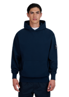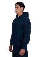 Our new and improved men's Sandbanks badge logo hoodie in navy. This garment has been upgraded with a 380gsm diagonal knitted fabric that features a slight brushed back for a superior soft feeling and warmth, whilst remaining breathable. Made from a 97% cotton 3% elastane for improved feel, shape retention and finished with a sleeve embroidered badge logo and cover stitch details.