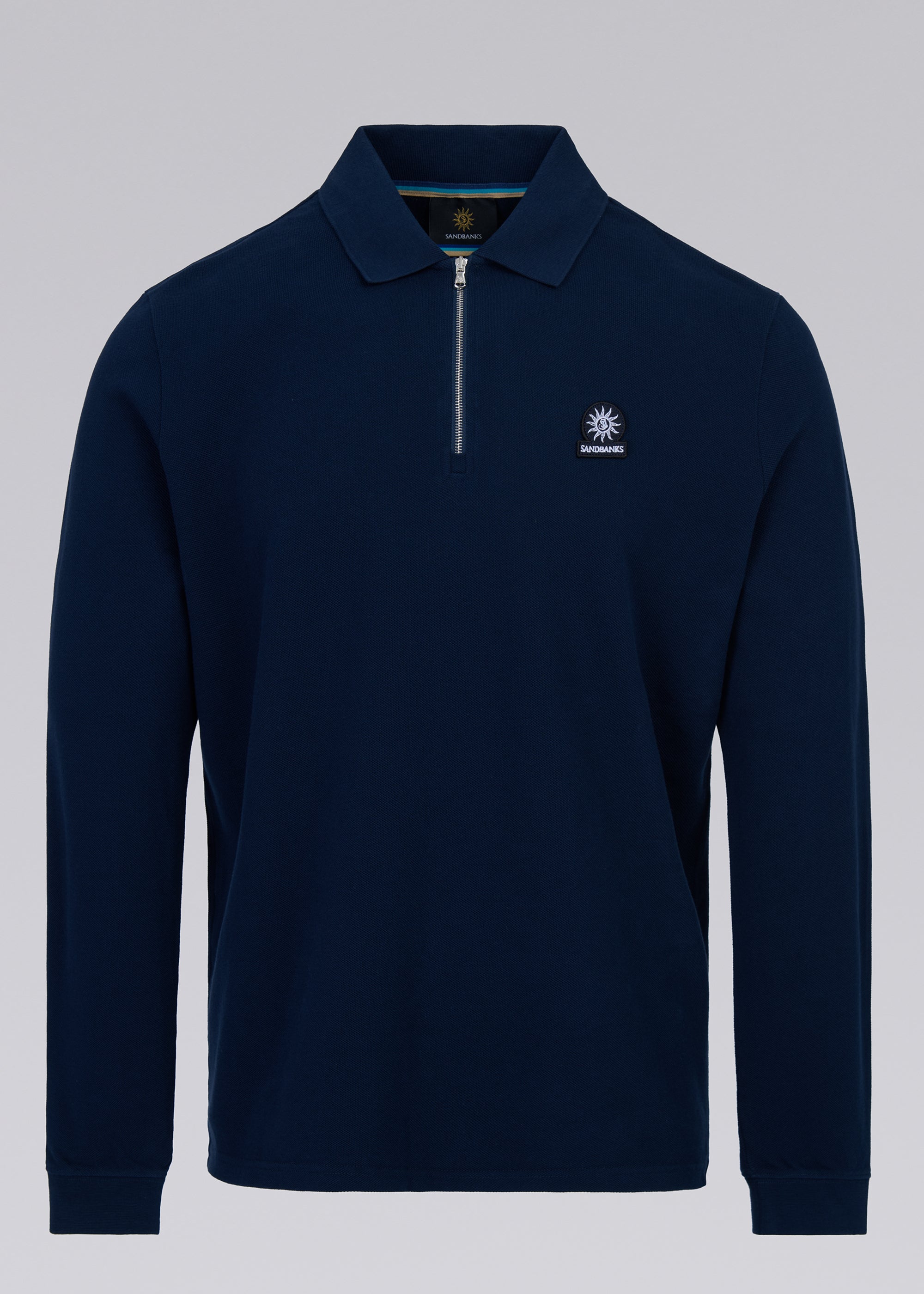 Sandbanks men's badge logo long sleeve polo shirt in navy, made from 100% organic cotton. This classic fitting zip polo shirt features an embroidered badge logo on the chest, tri-colour tipped ribbed collar, cuff and back neck binding.