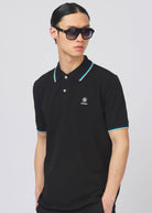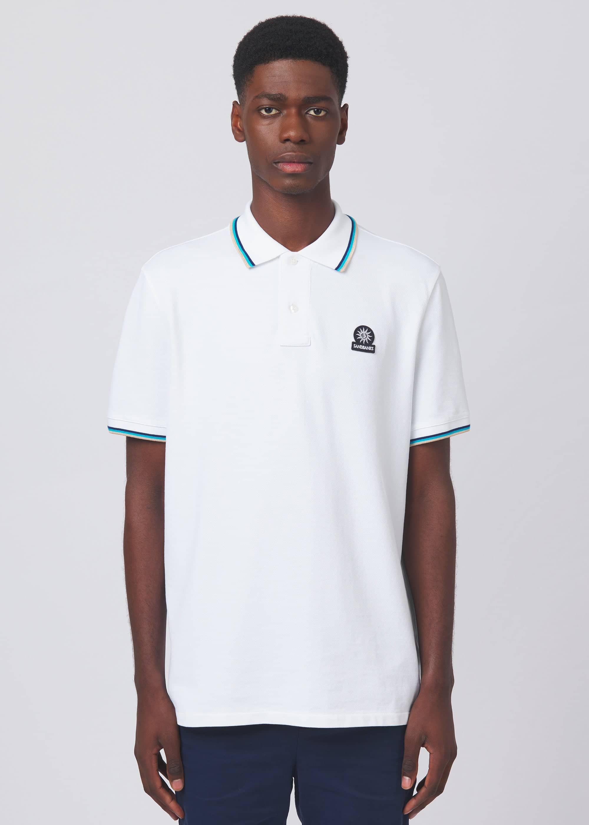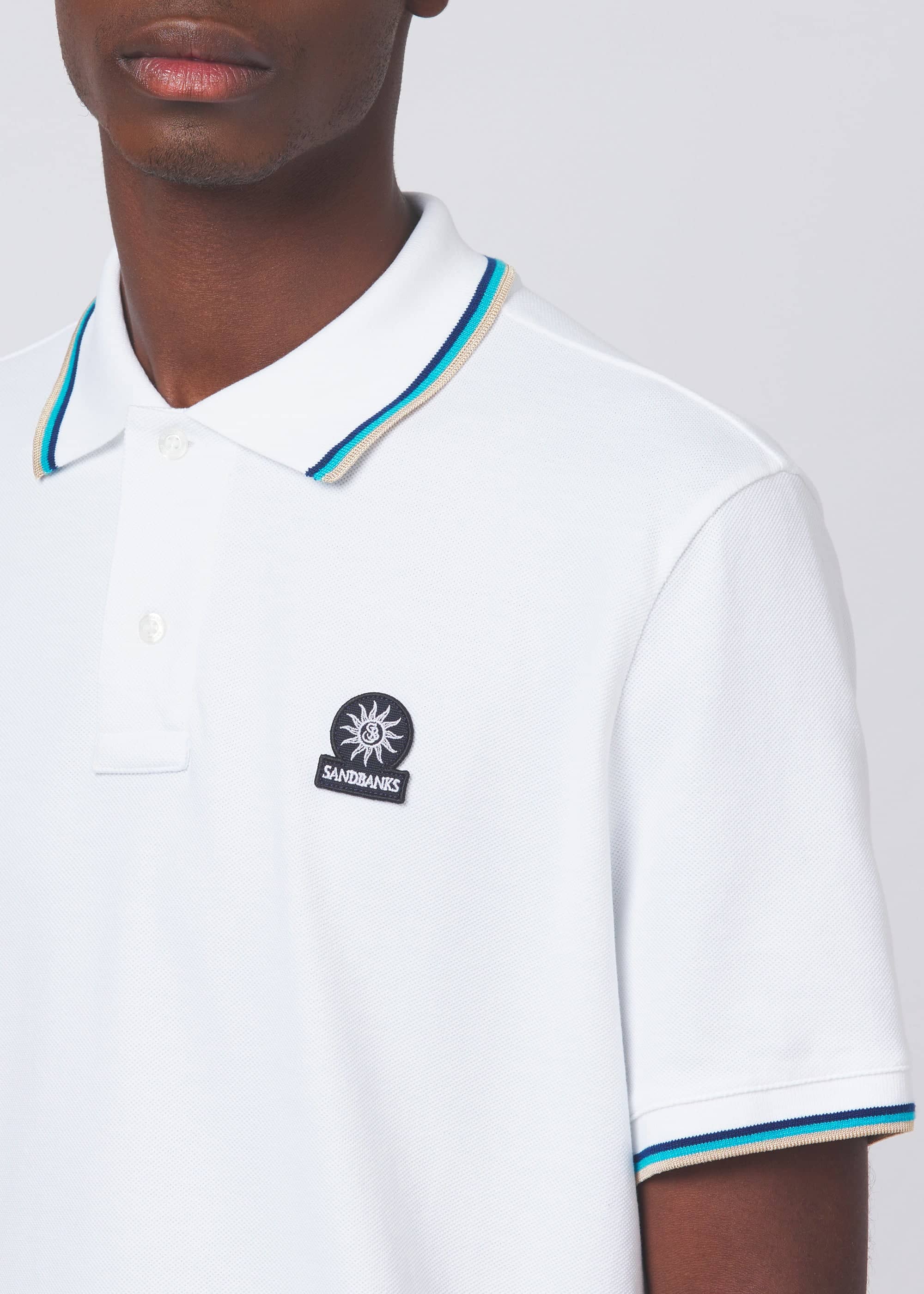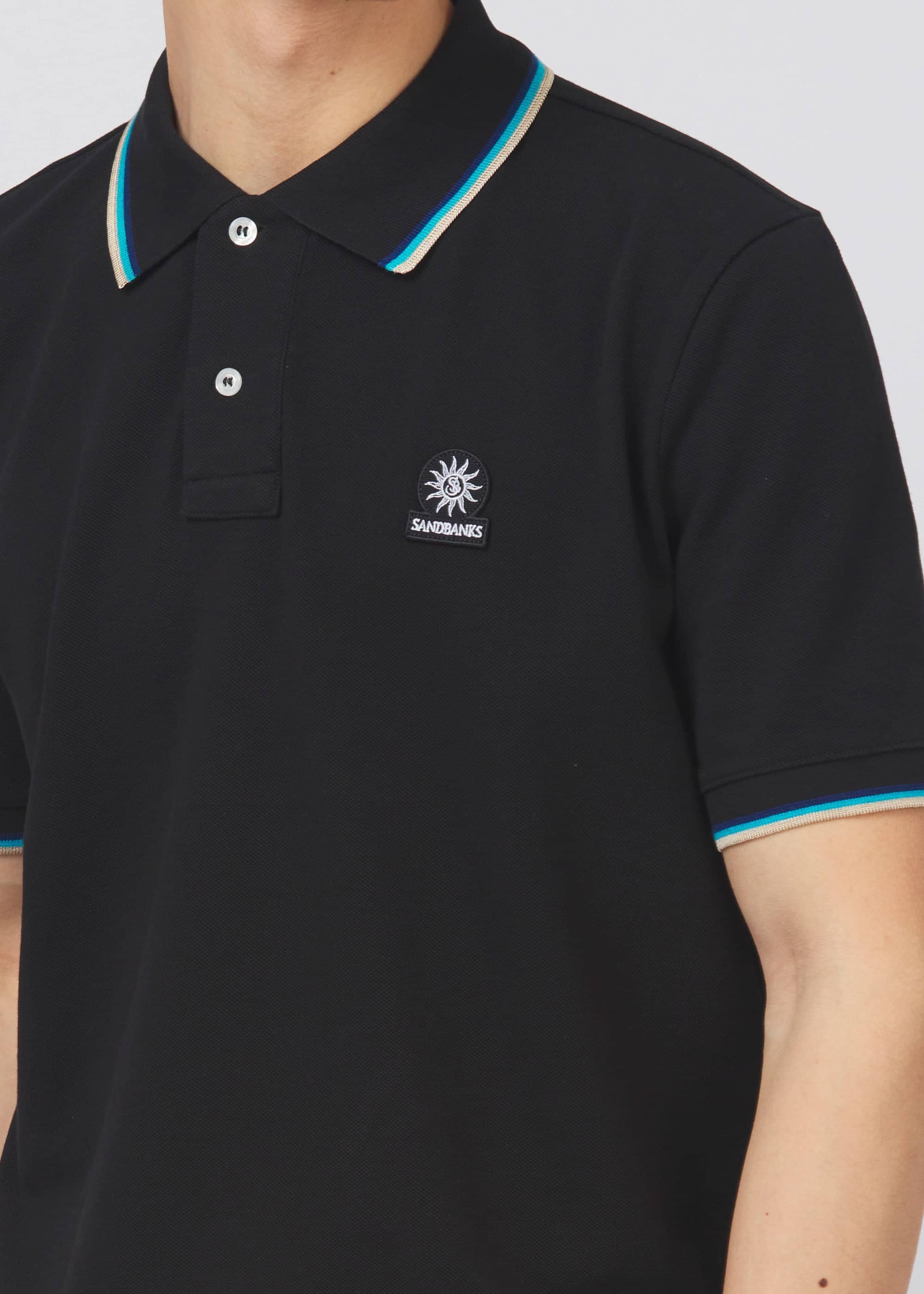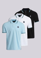 Pack of 3 Sandbanks Badge Logo Polo Shirts in core colours; Black, White, and Crystal Blue. These classic fitting polo shirts are made from 100% organic cotton for a luxurious feel, feature an embroidered badge logo on the chest and tri-colour tipped sleeve cuffs.