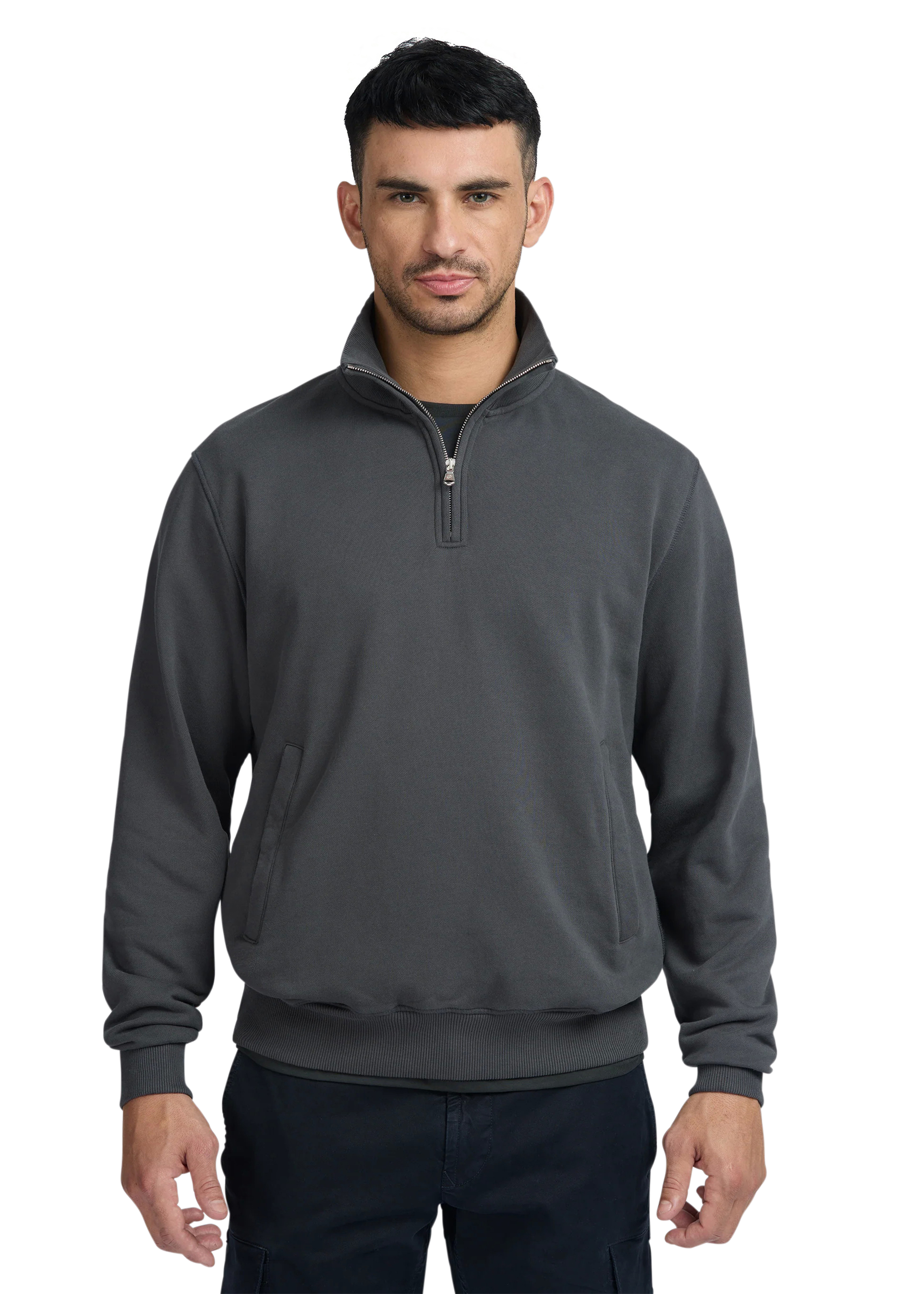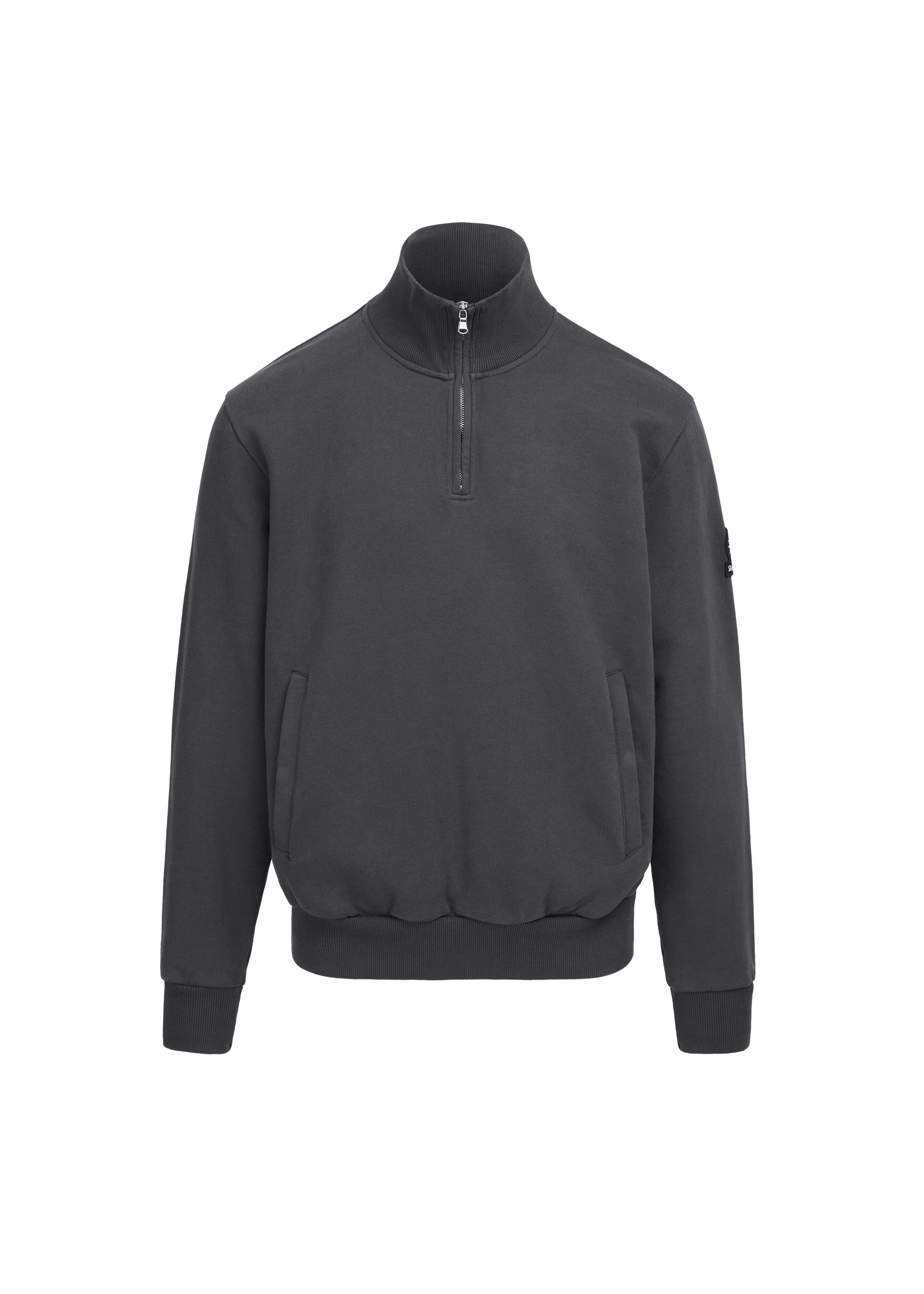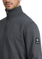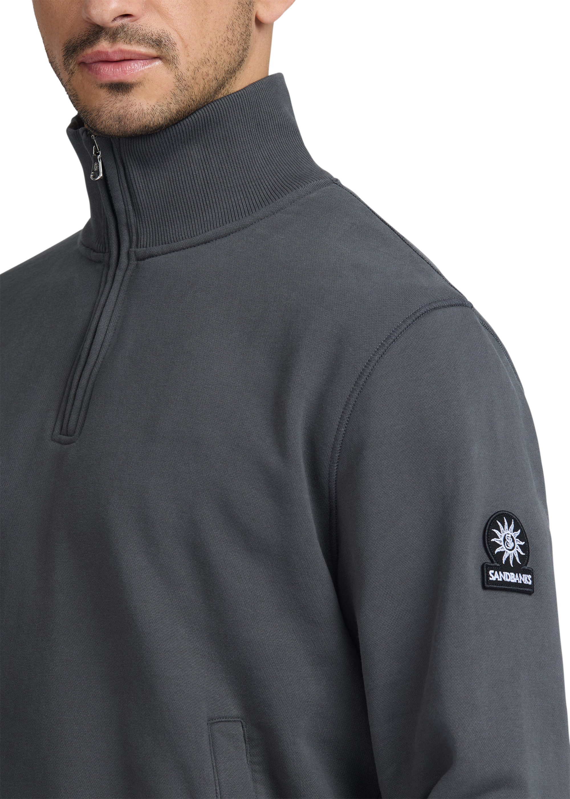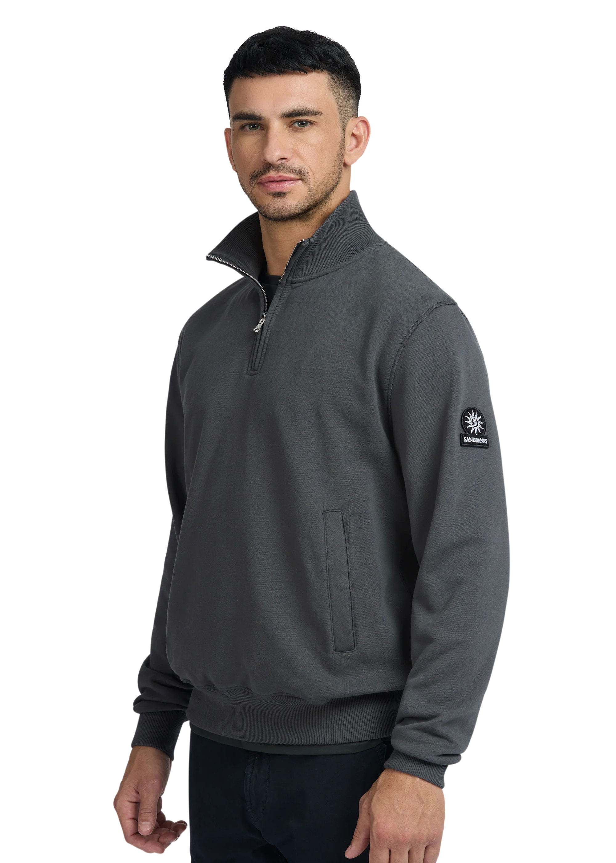 Sandbanks badge logo quarter zip sweatshirt in anthracite, made from a 400gsm diagonal knitted 100% BCI cotton fabric that features a slight brushed back for a superior soft feeling and warmth, whilst remaining breathable. This quarter zip sweatshirt features a Lampo metal zip in silver with a ribbed neck.