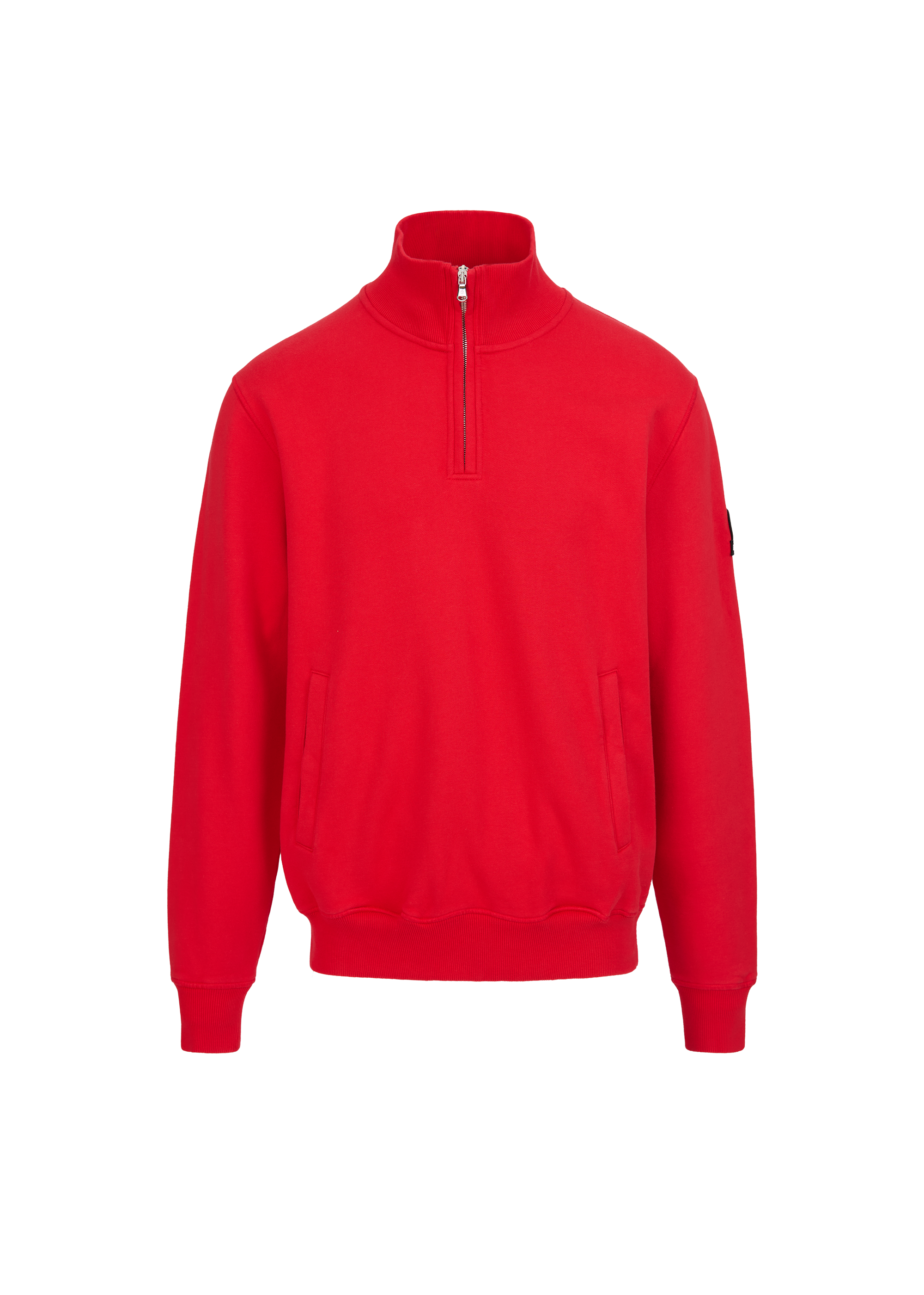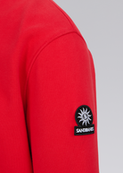Sandbanks badge logo quarter zip sweatshirt in red, made from a 400gsm diagonal knitted 100% BCI cotton fabric that features a slight brushed back for a superior soft feeling and warmth, whilst remaining breathable. This quarter zip sweatshirt features a Lampo metal zip in silver with a ribbed neck.