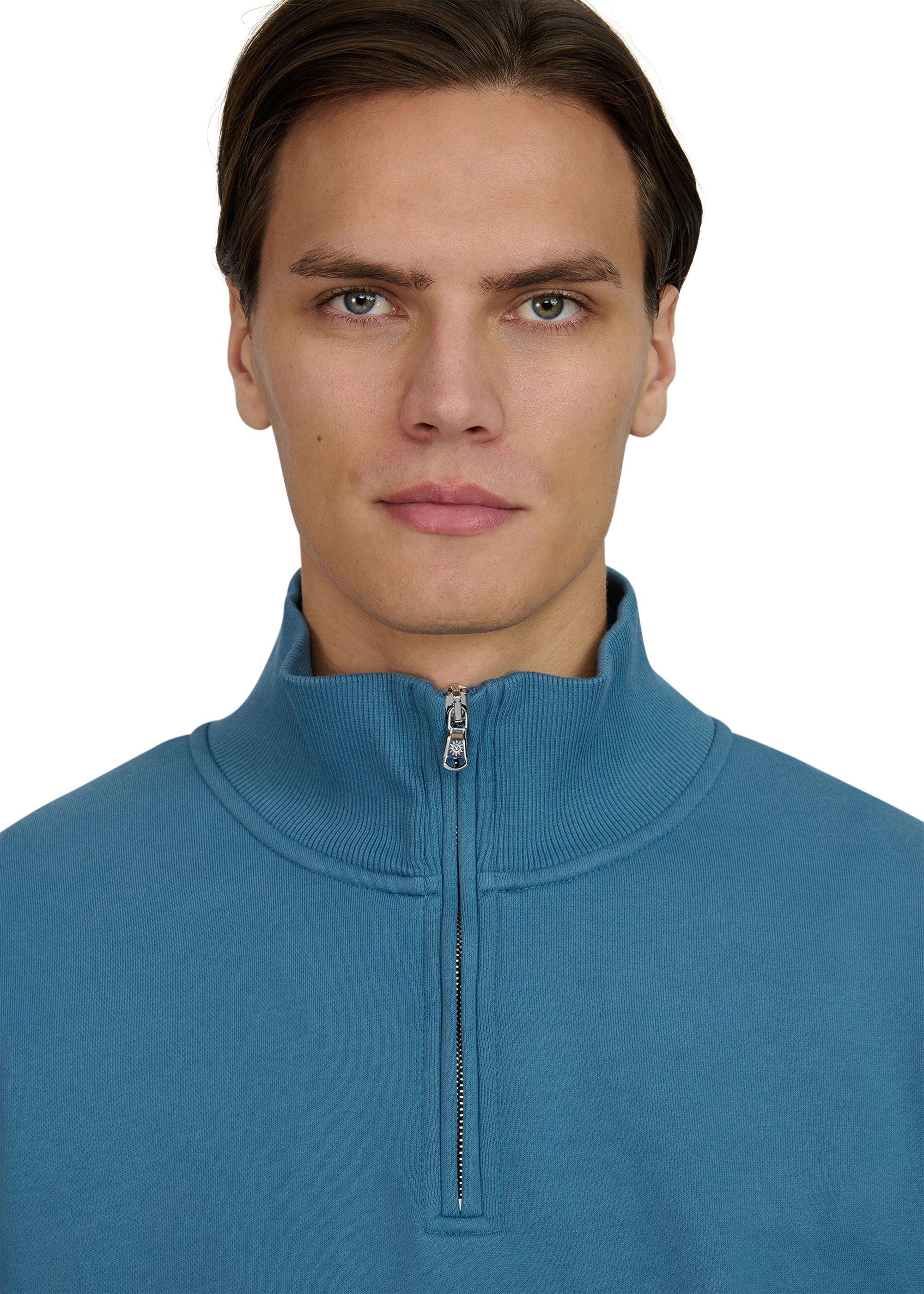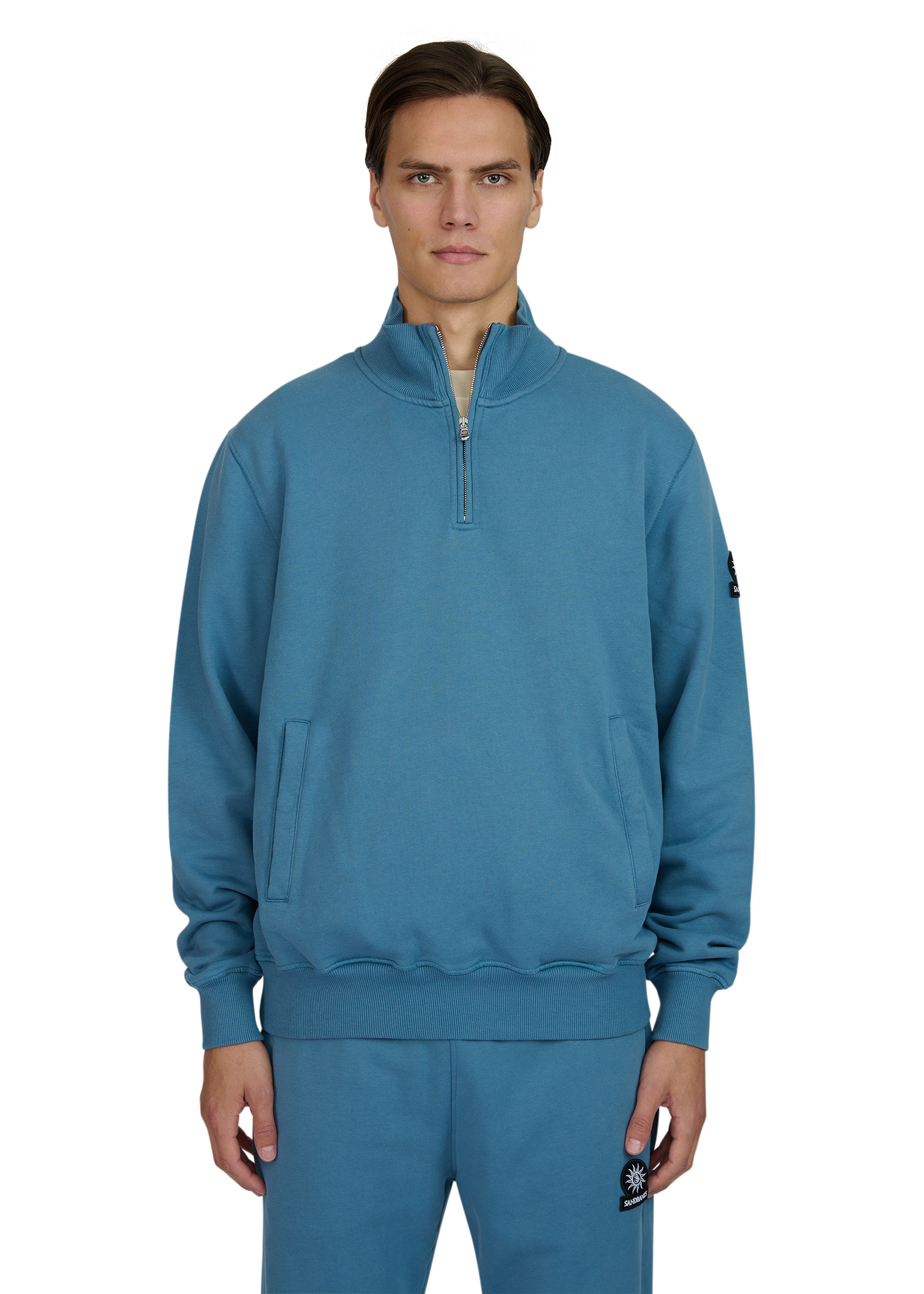 Sandbanks badge logo quarter zip sweatshirt in teal, made from a 400gsm diagonal knitted 100% BCI cotton fabric that features a slight brushed back for a superior soft feeling and warmth, whilst remaining breathable. This quarter zip sweatshirt features a Lampo metal zip in silver with a ribbed neck.