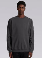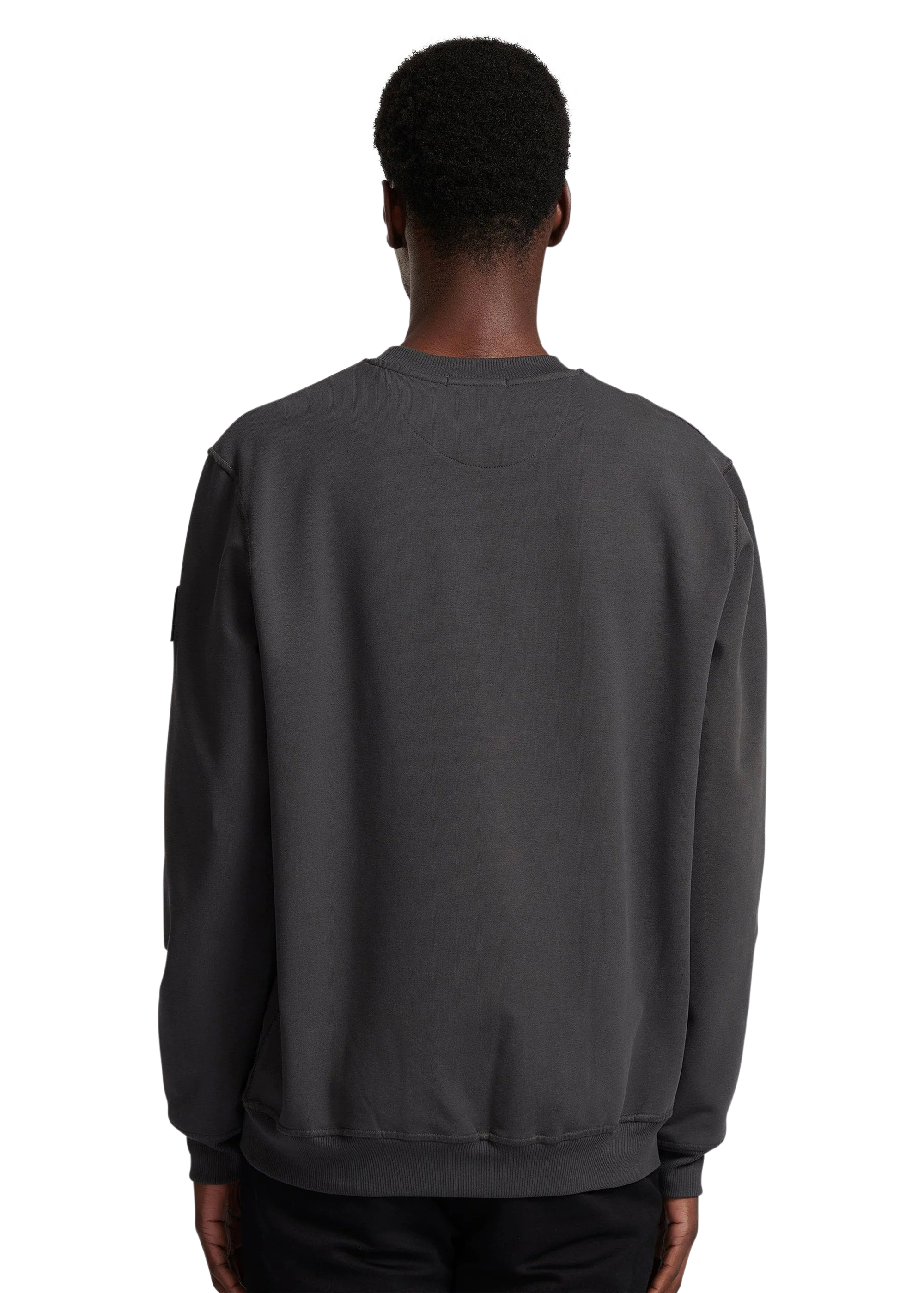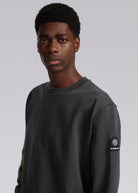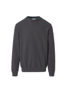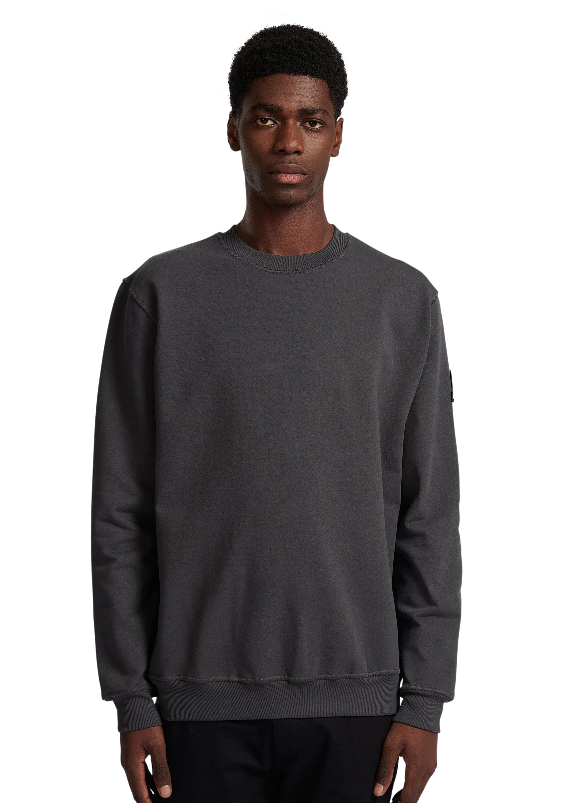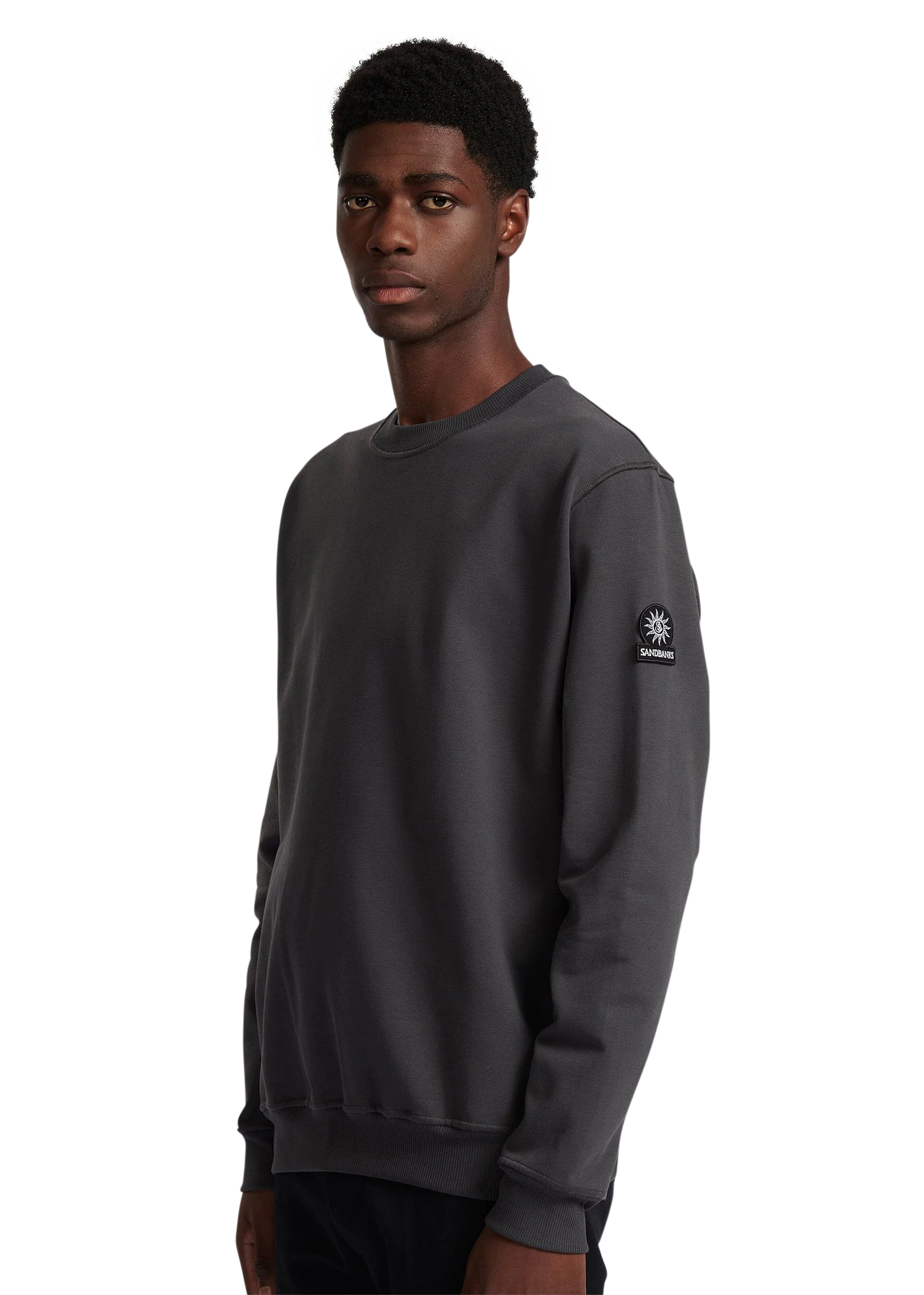 Our new and improved men's Sandbanks badge logo sweatshirt in anthracite. This garment has been upgraded with a 380gsm diagonal weave knitted fabric that features a slight brushed back for a superior soft feeling and warmth, whilst remaining breathable. Made from a 95% cotton 5% elastane for improved feel, shape retention and finished with a sleeve embroidered badge logo and cover stitch details.