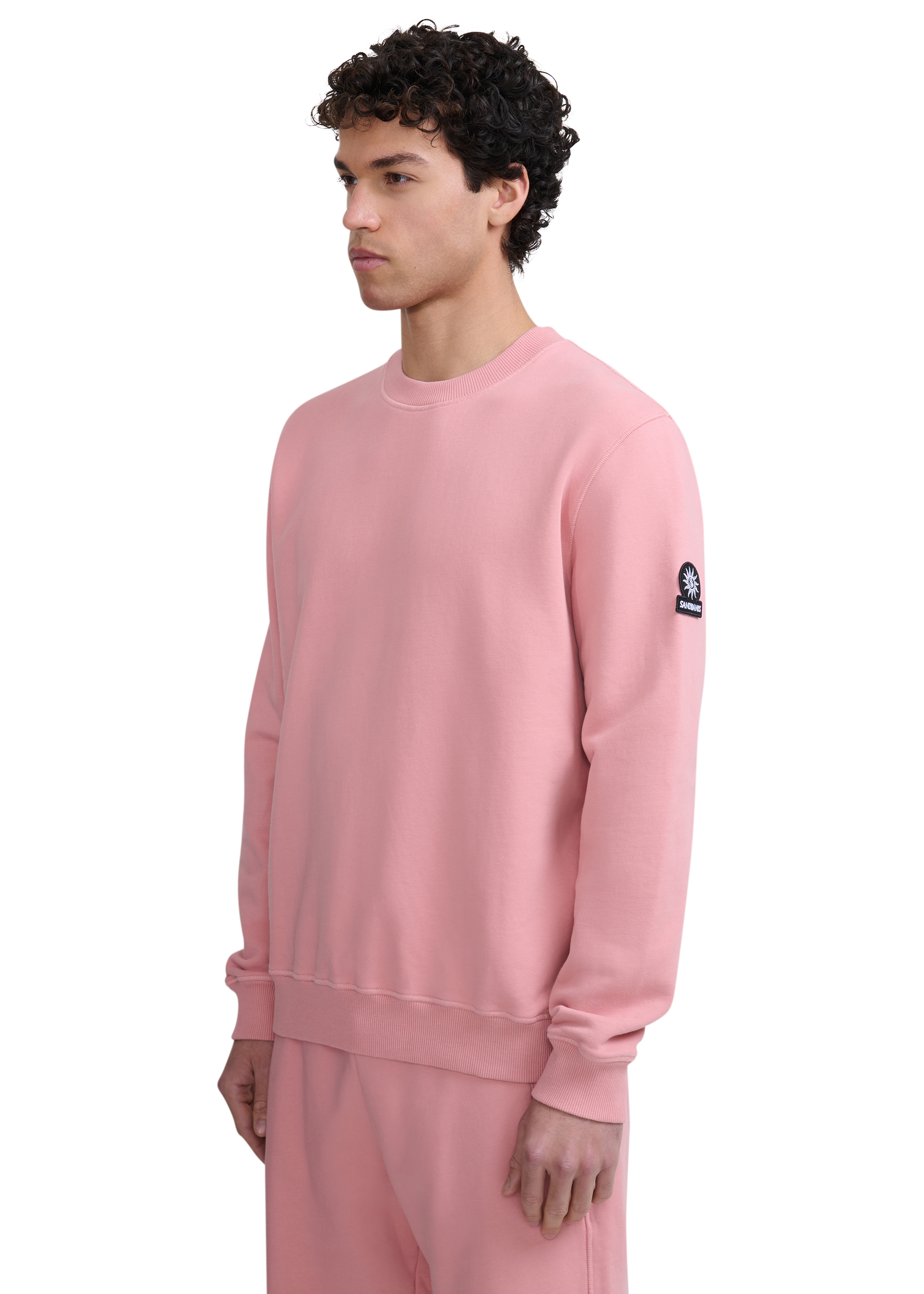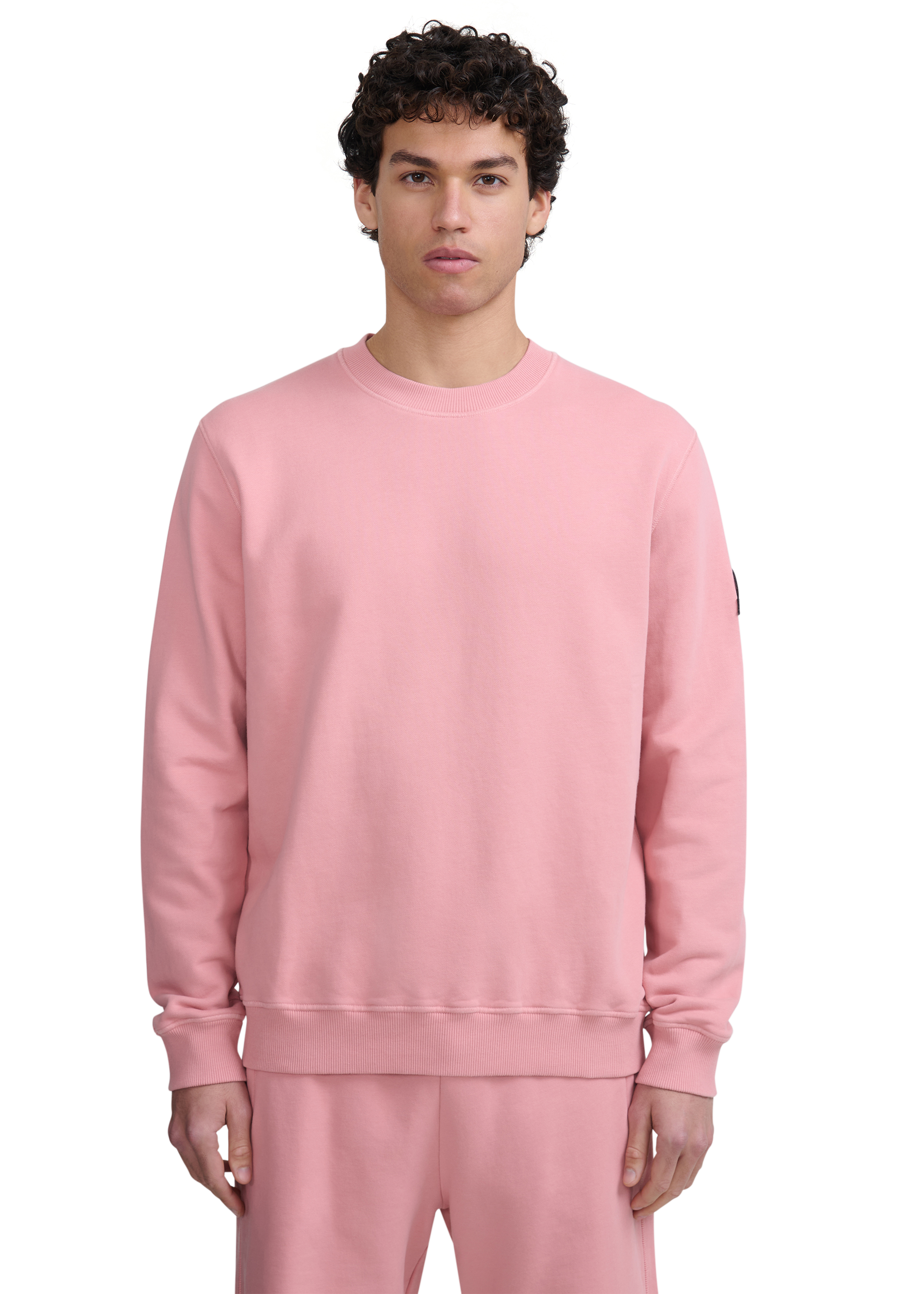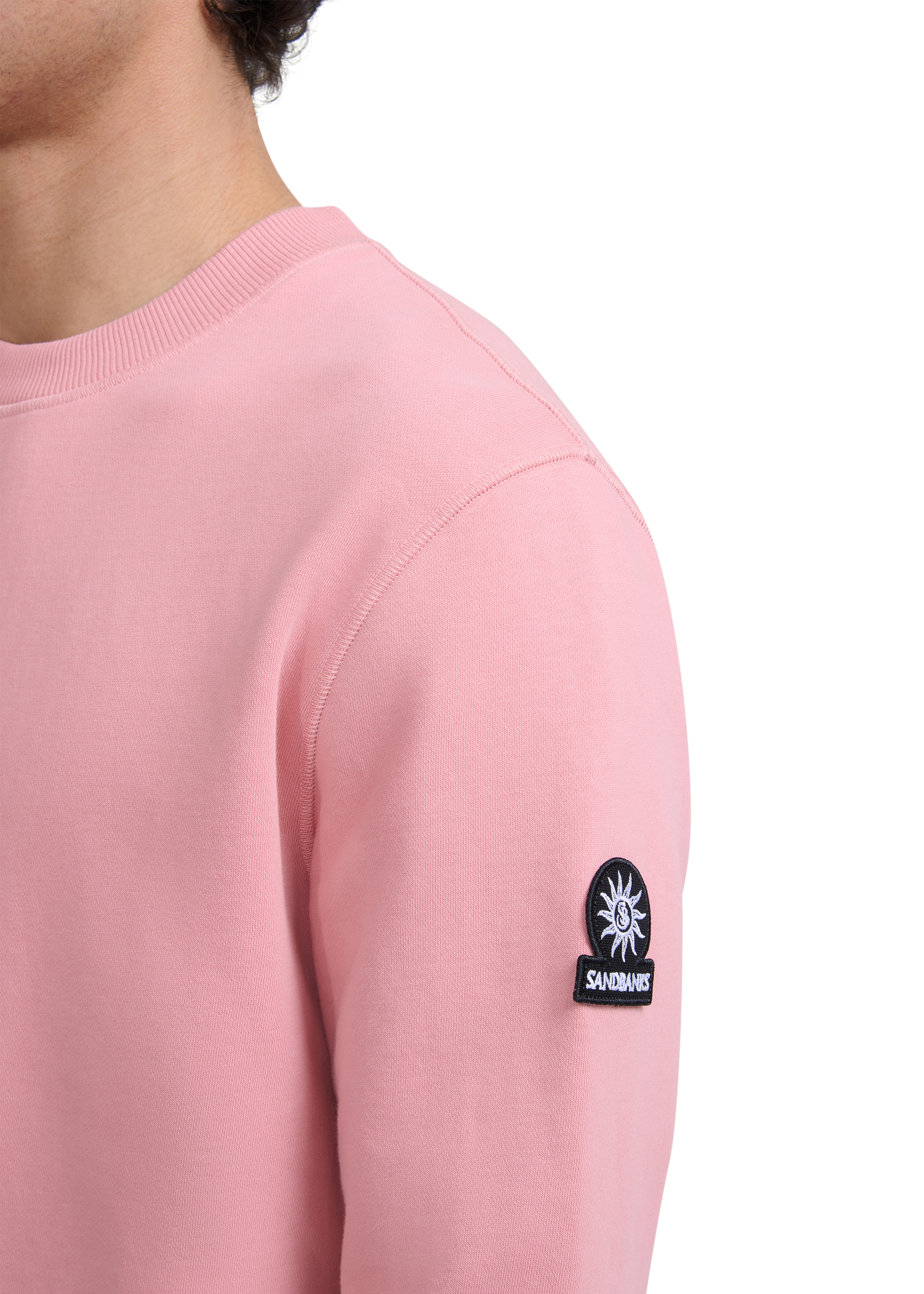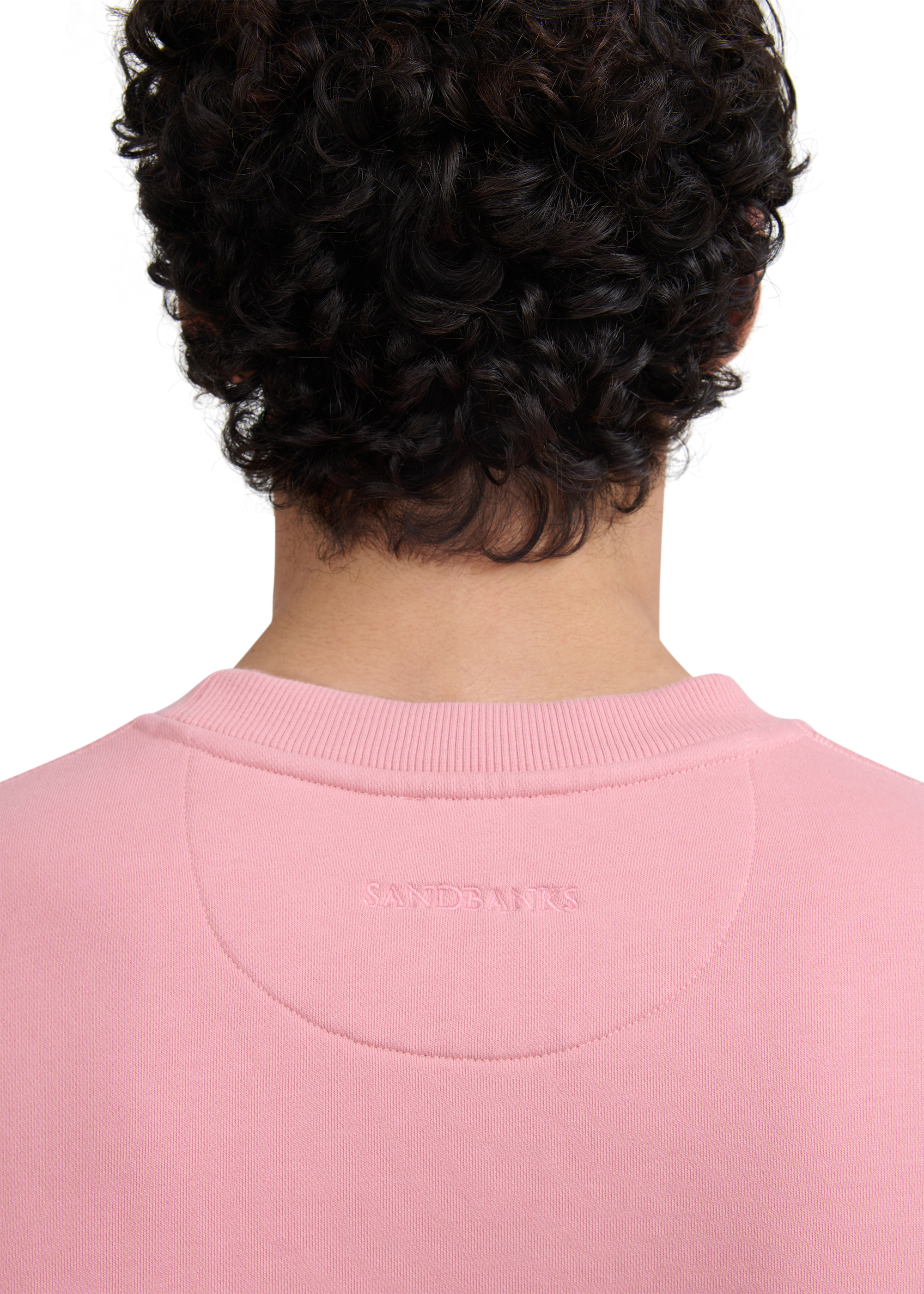 Sandbanks badge logo sweatshirt in dusty pink. This garment has been upgraded with a 400gsm diagonal knitted fabric that features a slight brushed back for a superior soft feeling and warmth, whilst remaining breathable. Made from 100% BCI Cotton with a sleeve embroidered badge logo and cover stitch details.