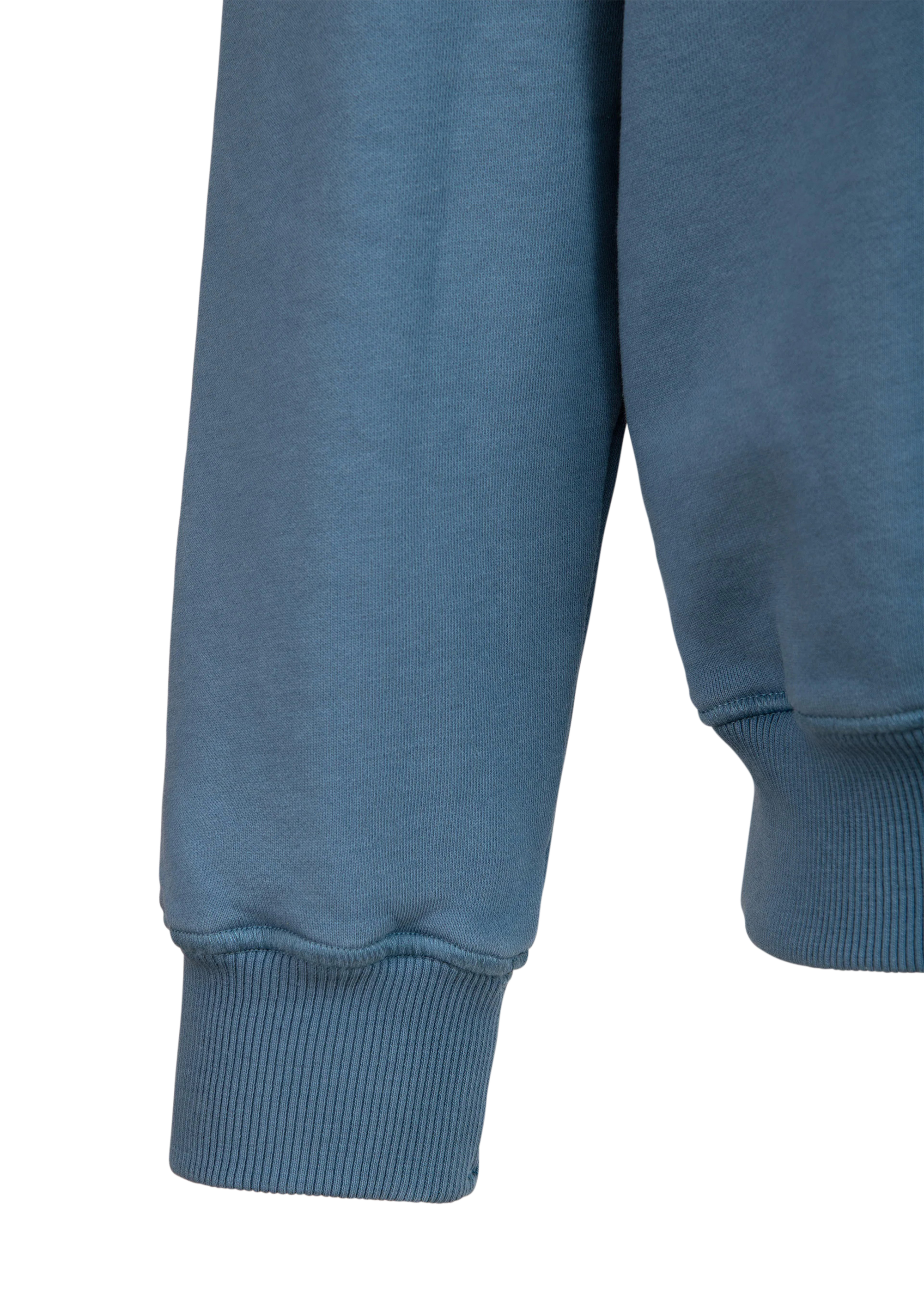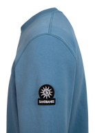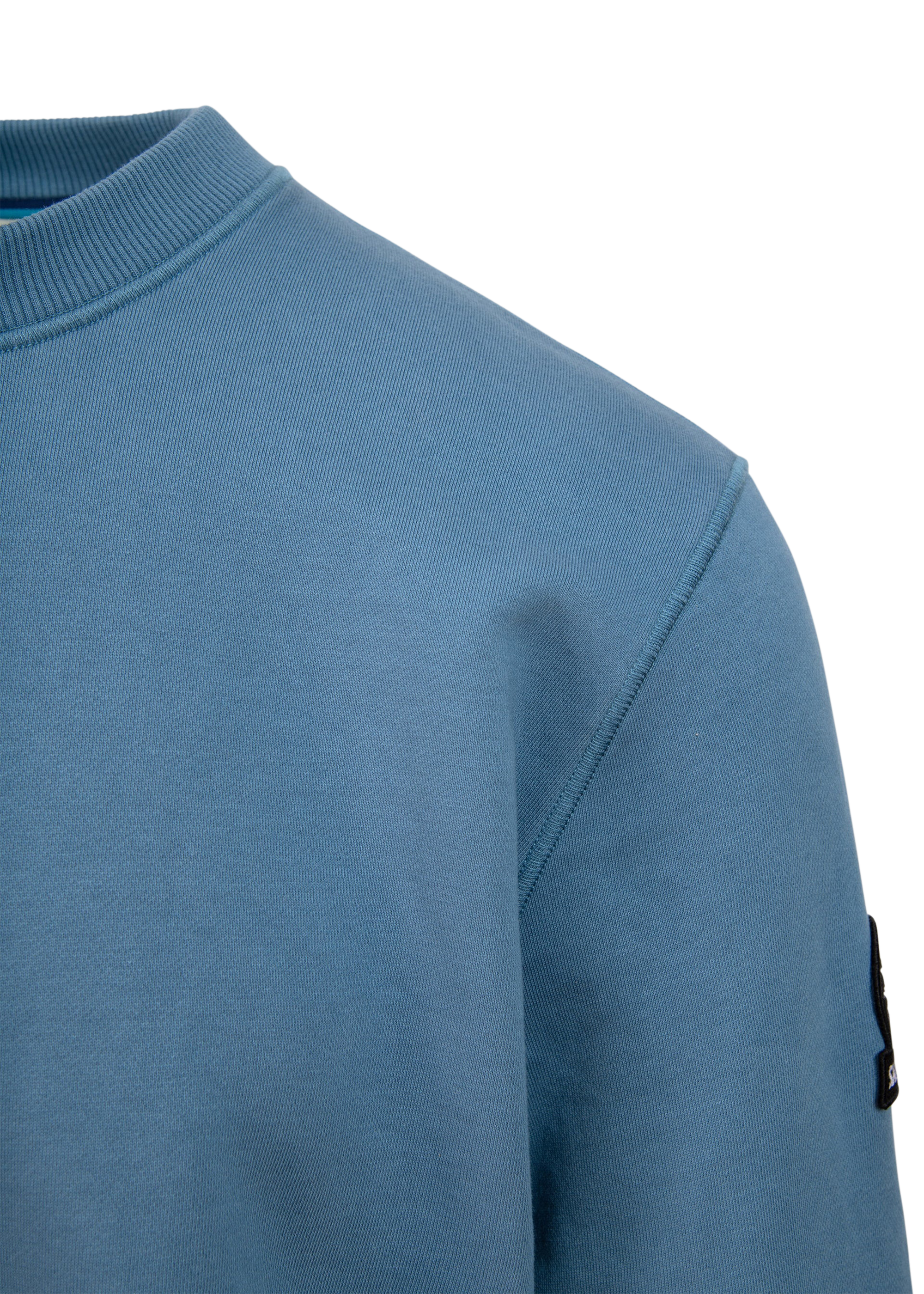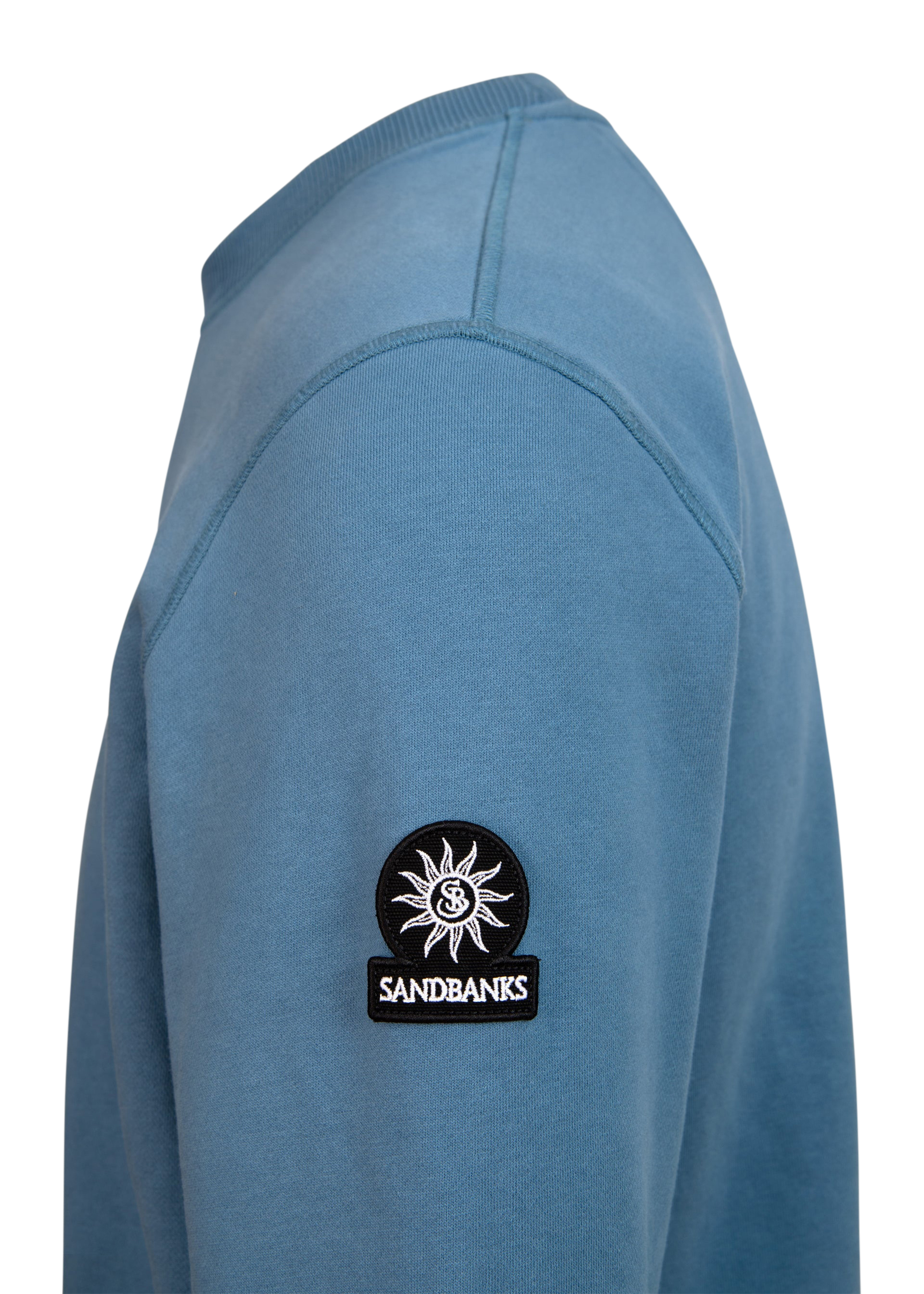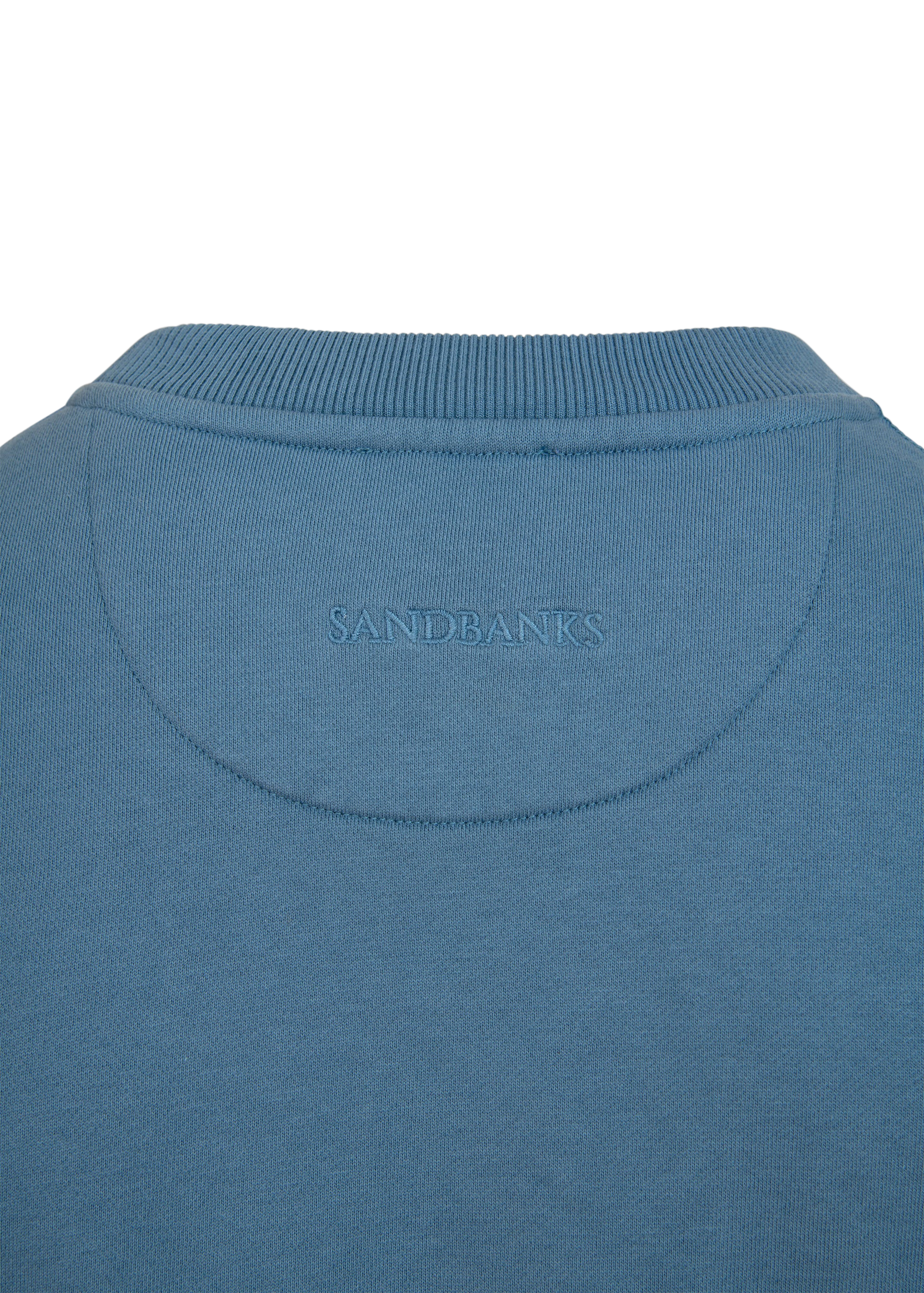 Our new and improved men's Sandbanks badge logo sweatshirt in teal. This garment has been upgraded with a 400gsm diagonal knitted fabric that features a slight brushed back for a superior soft feeling and warmth, whilst remaining breathable. Made from 100% BCI Cotton with a sleeve embroidered badge logo and cover stitch details.