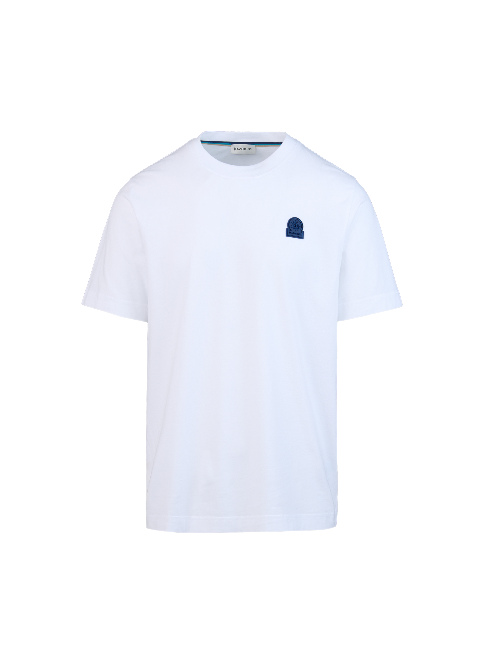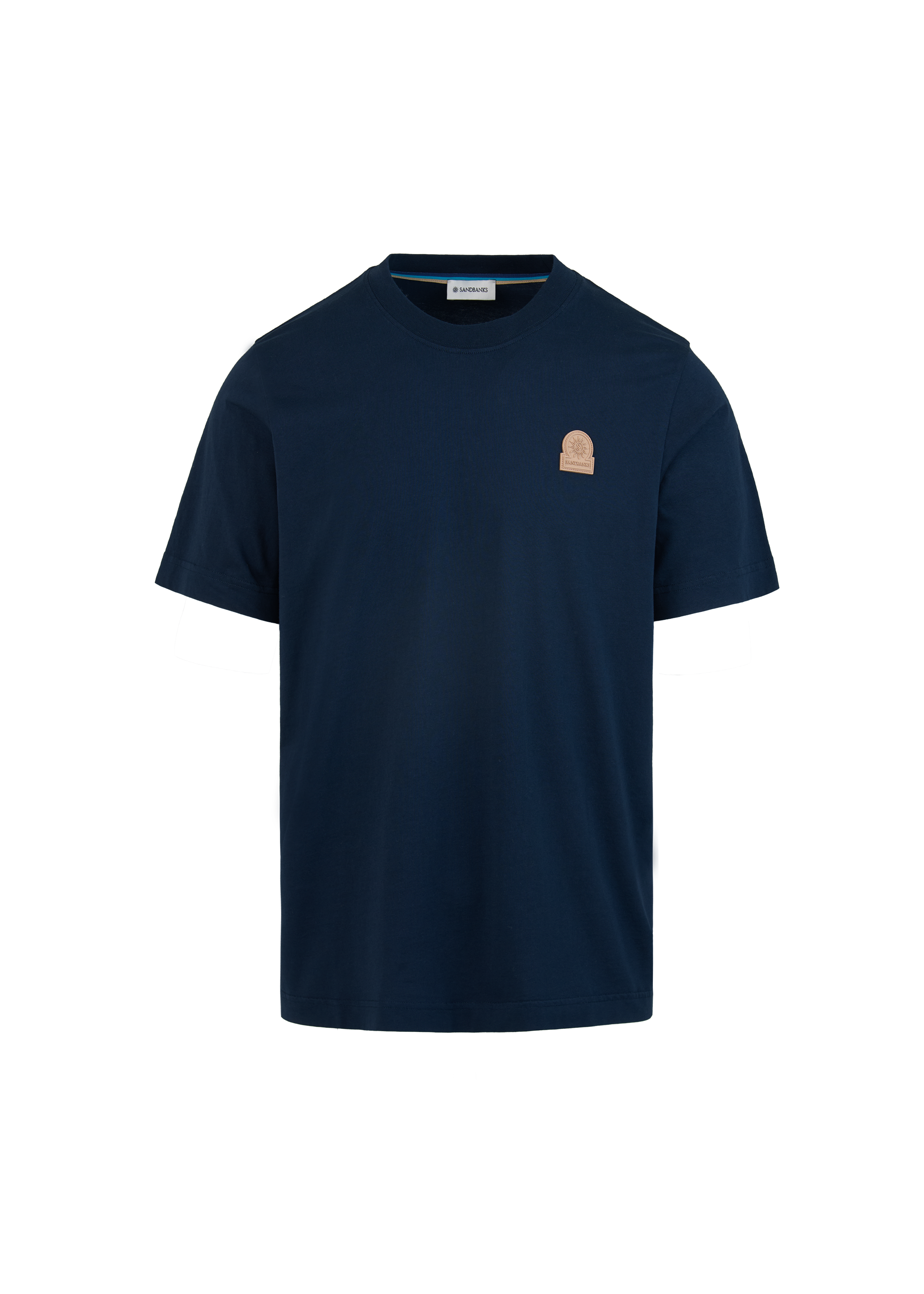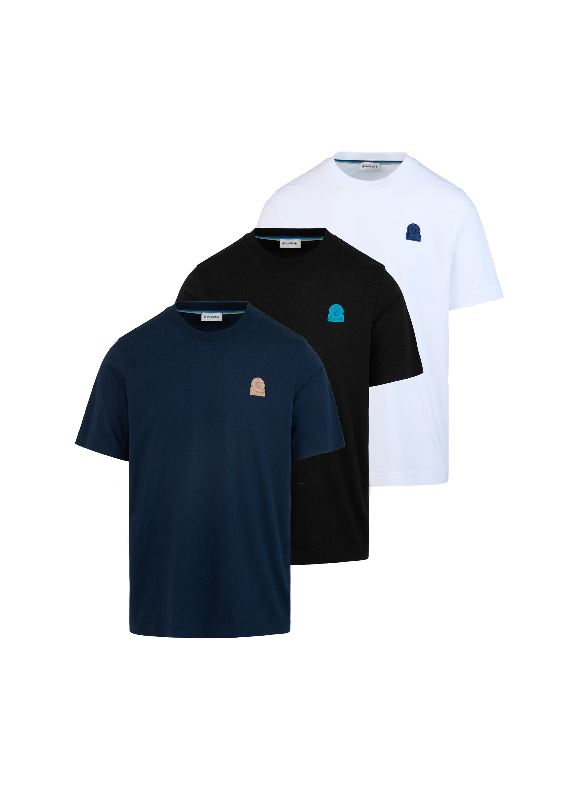 An essential trio of Sandbanks Badge Logo T-Shirts in White, Navy and Black. Crafted from soft BCI cotton, each piece is cut to a clean crew neck silhouette, offering effortless versatility for layering and everyday wear. Designed to move seamlessly between settings, this foundational set brings a polished edge to the modern wardrobe. Finished with a contrast rubber badge at the chest and distinctive tri-colour binding at the back neck.