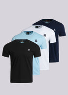 Pack of 4 Sandbanks Badge Logo T-Shirts in classic colours; Black, White, Navy and Crystal Blue. These classic fitting crew neck t-shirts are made from mercerised cotton for a silky and luxurious feel, feature an embroidered badge logo on the chest and tri-colour back neck binding.