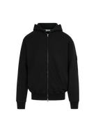 Our men's Sandbanks badge logo zip hoodie in black is constructed with a 400gsm diagonal knitted fabric that features a slight brushed back for a superior soft feeling and warmth, whilst remaining breathable. Made from 100% BCI Cotton with a sleeve embroidered badge logo and a silver Lampo two way zip.
